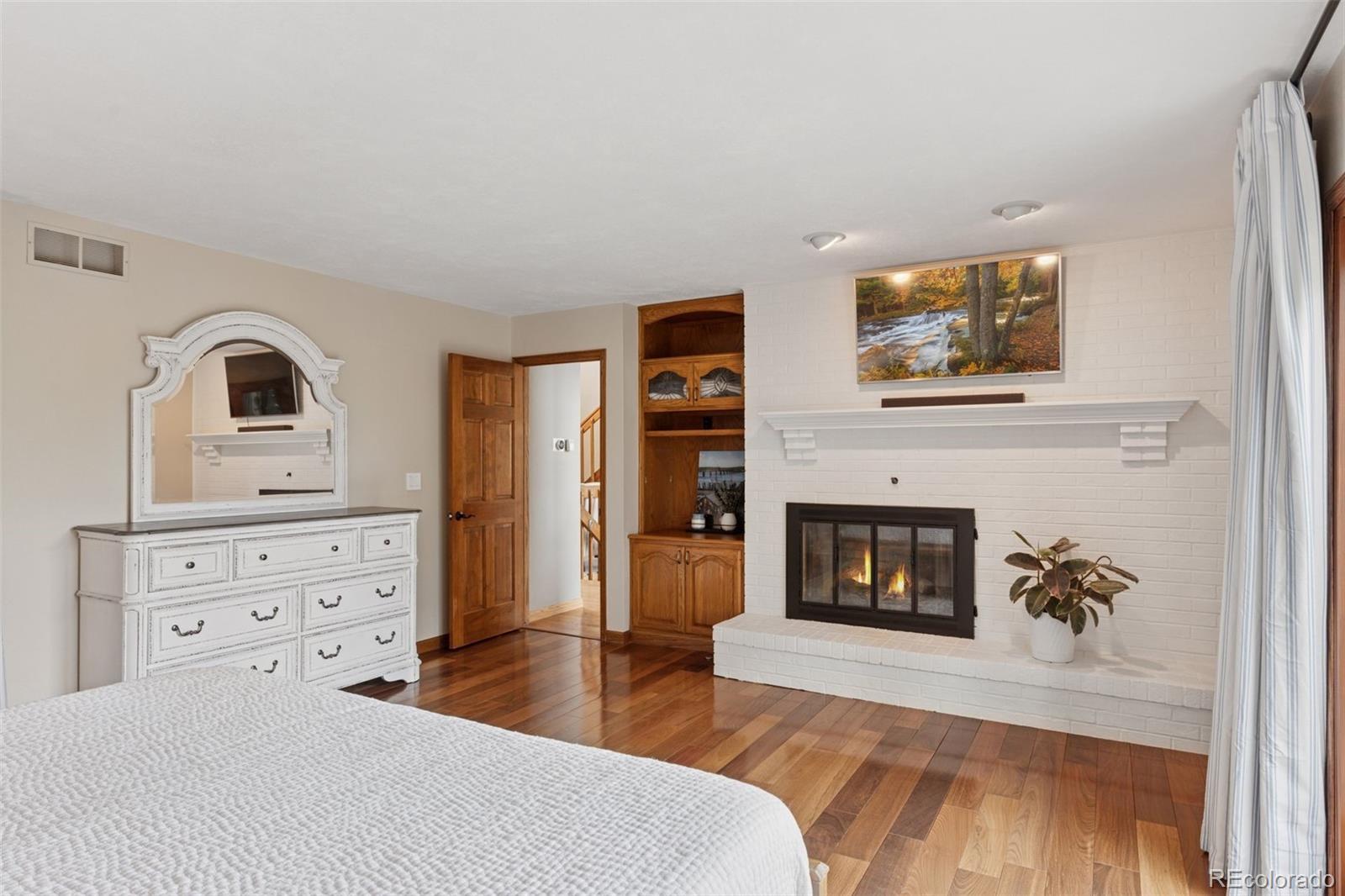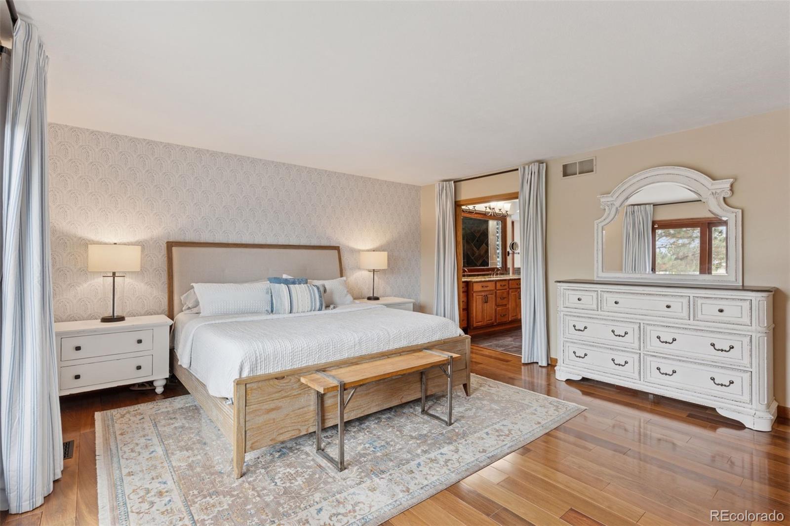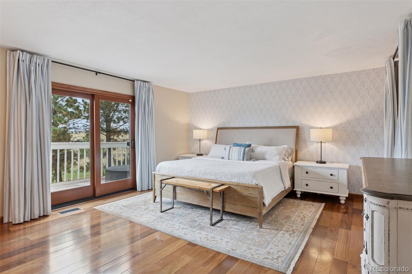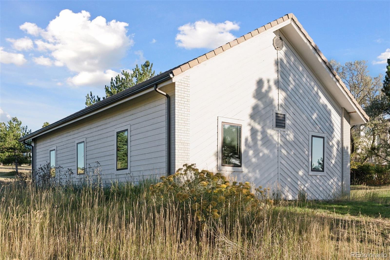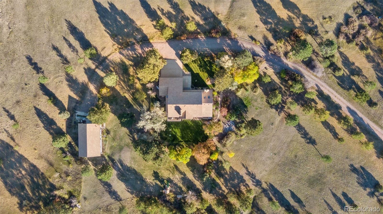 Welcome to five private landscaped acres offering fantastic mountain views within the wonderful Butterfield neighborhood. Four towering windows soar to the sky & focus natural light throughout the home bringing the mountains & acreage inside to integrate w/ the cozy farmhouse feel & modern updates. Wood flooring leads from the dramatic vaulted entry through to the living room & dining area. Stainless steel KitchenAid appliances & gourmet 4-burner Wolf gas range in the open-layout kitchen with granite countertops, kitchen counter seating & breakfast nook. Relax in the main floor family room featuring a full-brick fireplace & sliding door that connects to a warm covered deck w/ dual access from the dining & family areas. Five bedrooms + a loft (or use the basement bedroom as a spacious office). Rare main floor primary bedroom w/ gas log fireplace & five-piece en suite w/ a spacious stone & tile dual shower, heated floors & jetted tub. Enjoy morning coffee & evening sunsets tucked away on the private deck from your primary bedroom. Fun nights await in the almost 2000 sq ft walkout basement, recently finished & includes a spacious second family room w/ a dry bar, refrigerator, wine cooler & cabinetry for roomy movie nights or friendly gatherings. Four fireplaces (2 wood/2 gas) including a dramatic brick fireplace that rises to the vaulted ceiling in the open-feel living room. 3-car finished attached garage + an 1161 sq ft heated outbuilding big enough for your vintage collection, batting cage, or golf simulator. Front & back sprinkler system w/ irrigated lines to trees. Walkout basement opens to a nicely landscaped lawn w/ patio, swing set & staircase leading up to the covered deck. Concrete tile roof, house fan, storage room w/ well water tank + halo water system + additional room in basement w/ rough plumbing to add fourth bathroom. Enjoy the privacy of your own five-acre retreat near the renowned Colorado Golf Club w/ EZ access to Parker shopping & restaurants.
