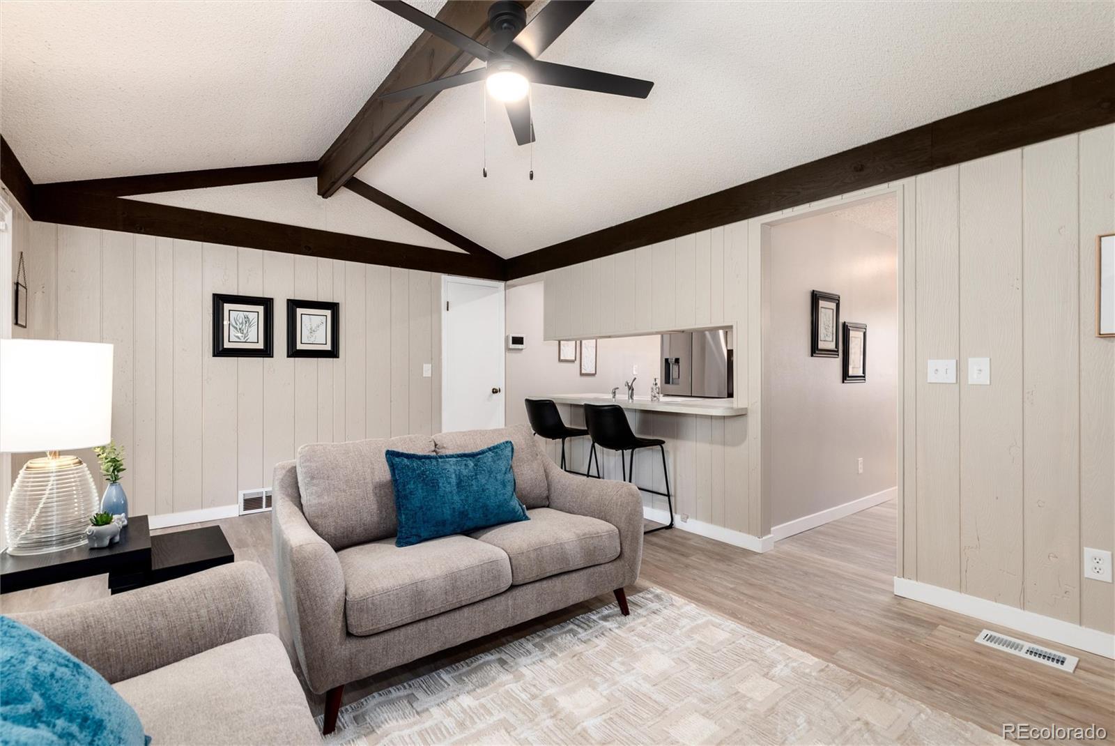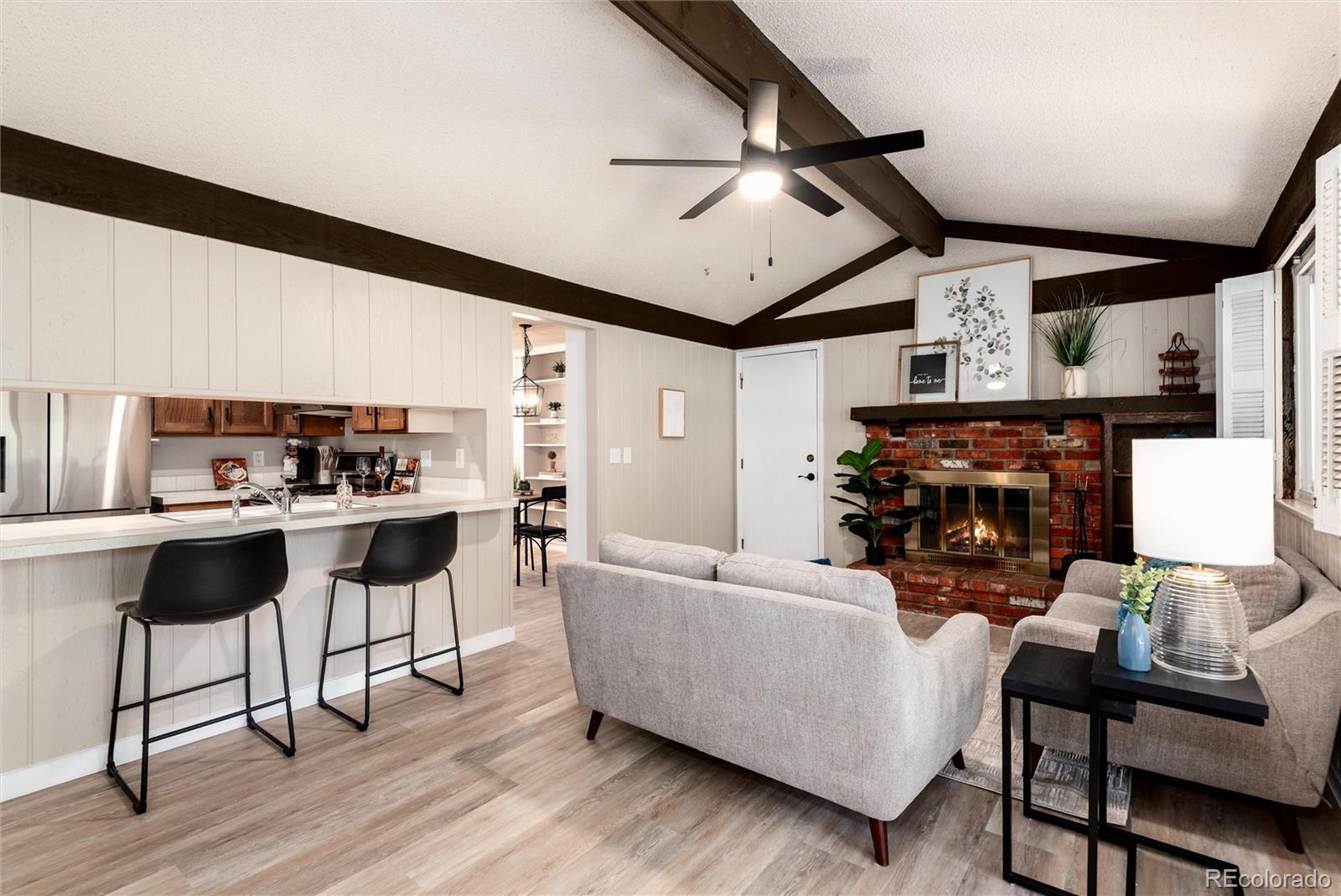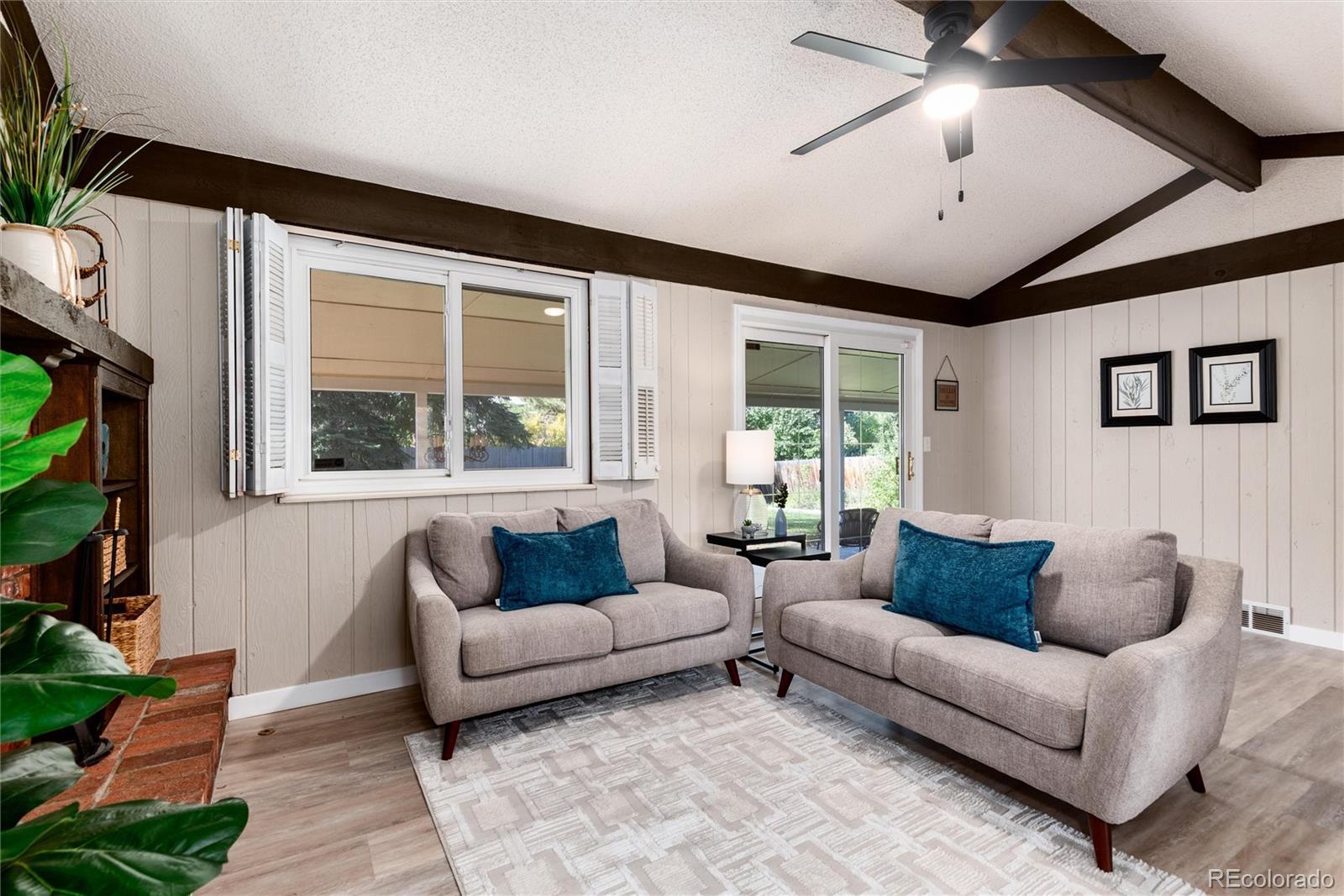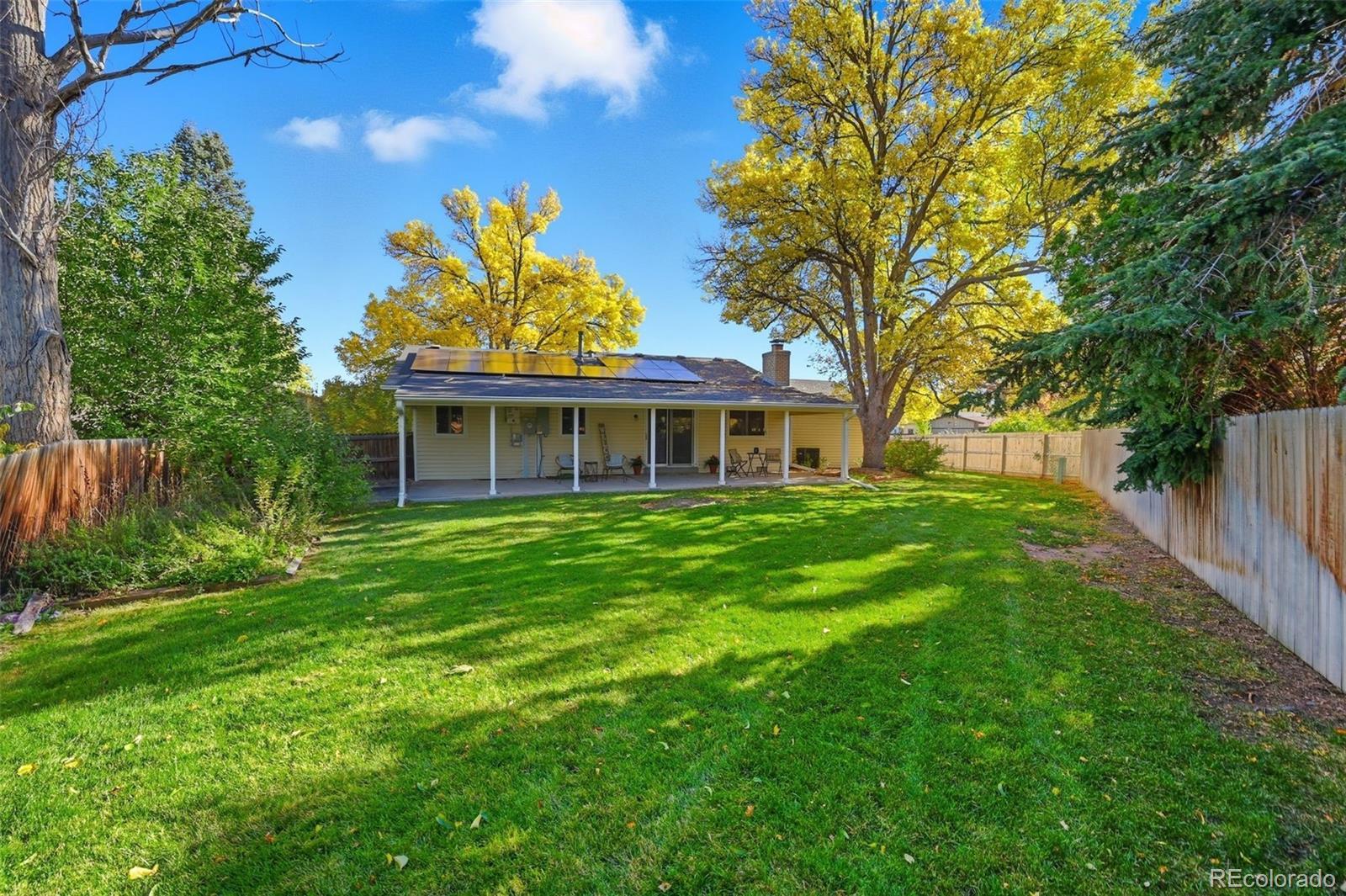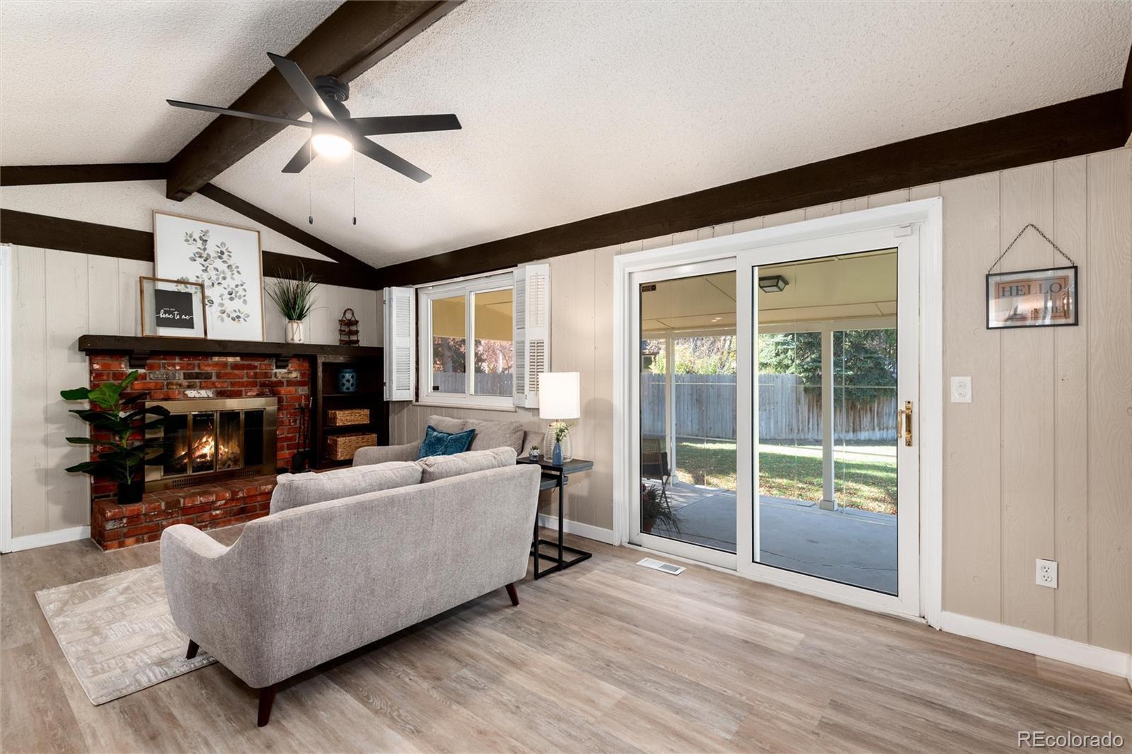 Welcome to this beautifully updated ranch in the highly sought-after Columbine West community. Located on a quiet, elevated street, this home sits on a generous 10,280 sq. ft. lot with mature trees, a fully fenced yard, a charming covered front porch, and a large covered back patio for private outdoor living and year-round enjoyment. Inside, the main level features vaulted ceilings, brand-new high-end vinyl plank flooring, new carpet in the bedrooms and hallway, fresh interior paint, upgraded lighting throughout, and new recessed lighting in the kitchen and living areas. The kitchen offers stainless steel appliances and newly updated cabinet hardware and eat-up island. It opens to the family room which offers a brick surround gas fireplace with wood mantel, vaulted ceilings with wood beam, ceiling fan, and nice window placement looking out onto the wonderful yard. The main floor also showcases two fully remodeled bathrooms with new vanities, toilets, lighting, flooring, mirrors, floating shelves, new flooring and new paint. The home also offers Newer windows, new ceiling fans in the bedrooms and central A/C for comfort and efficiency. The finished basement offers a large multi-purpose rec room, a half bath, utility space, and excellent storage—ideal for a home theater, game room, gym, hobby area, or future customization. The attached garage provides abundant storage and a convenient workbench. Located close to neighborhood parks, trails, schools, restaurants, grocery stores, and commuter routes, this home combines an updated interior, a standout lot, and an exceptional Littleton location!! FULLY PAID OFF SOLAR!!