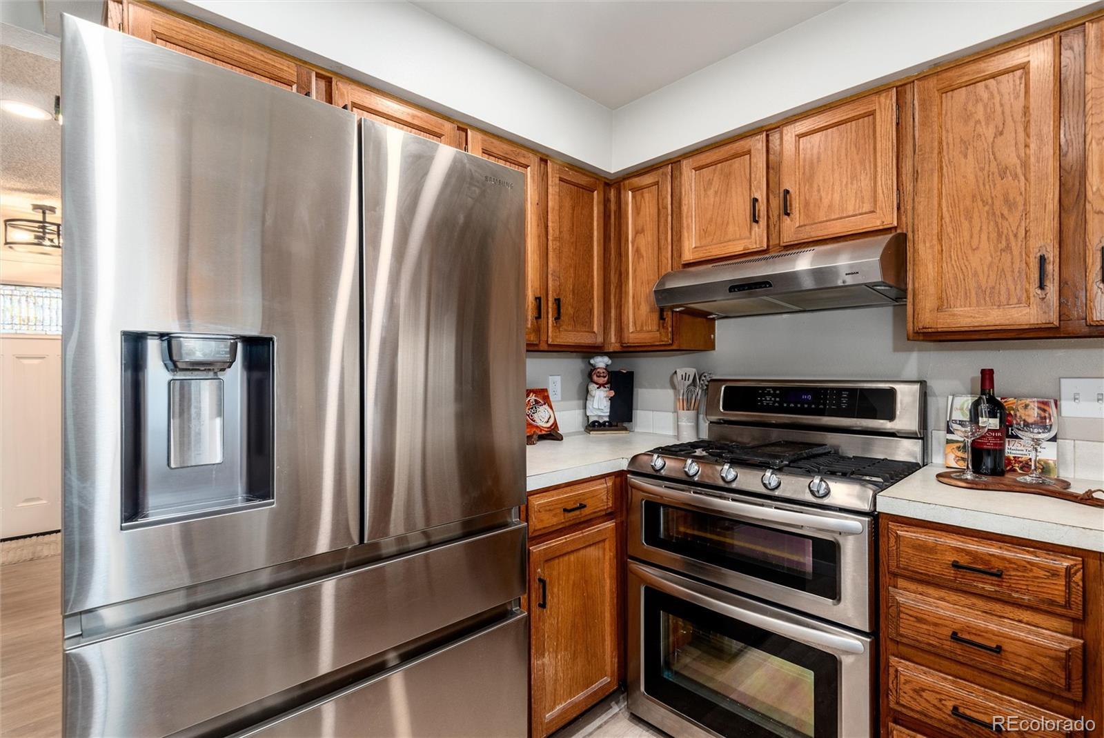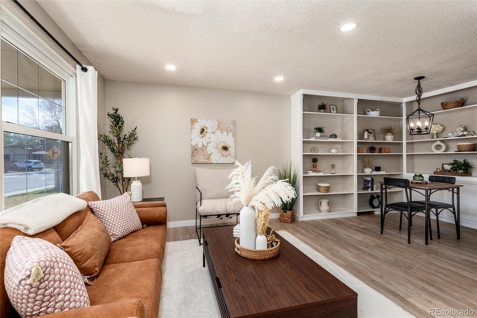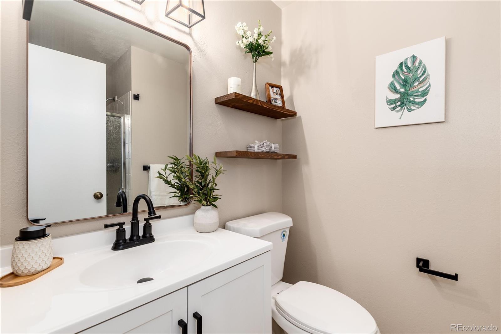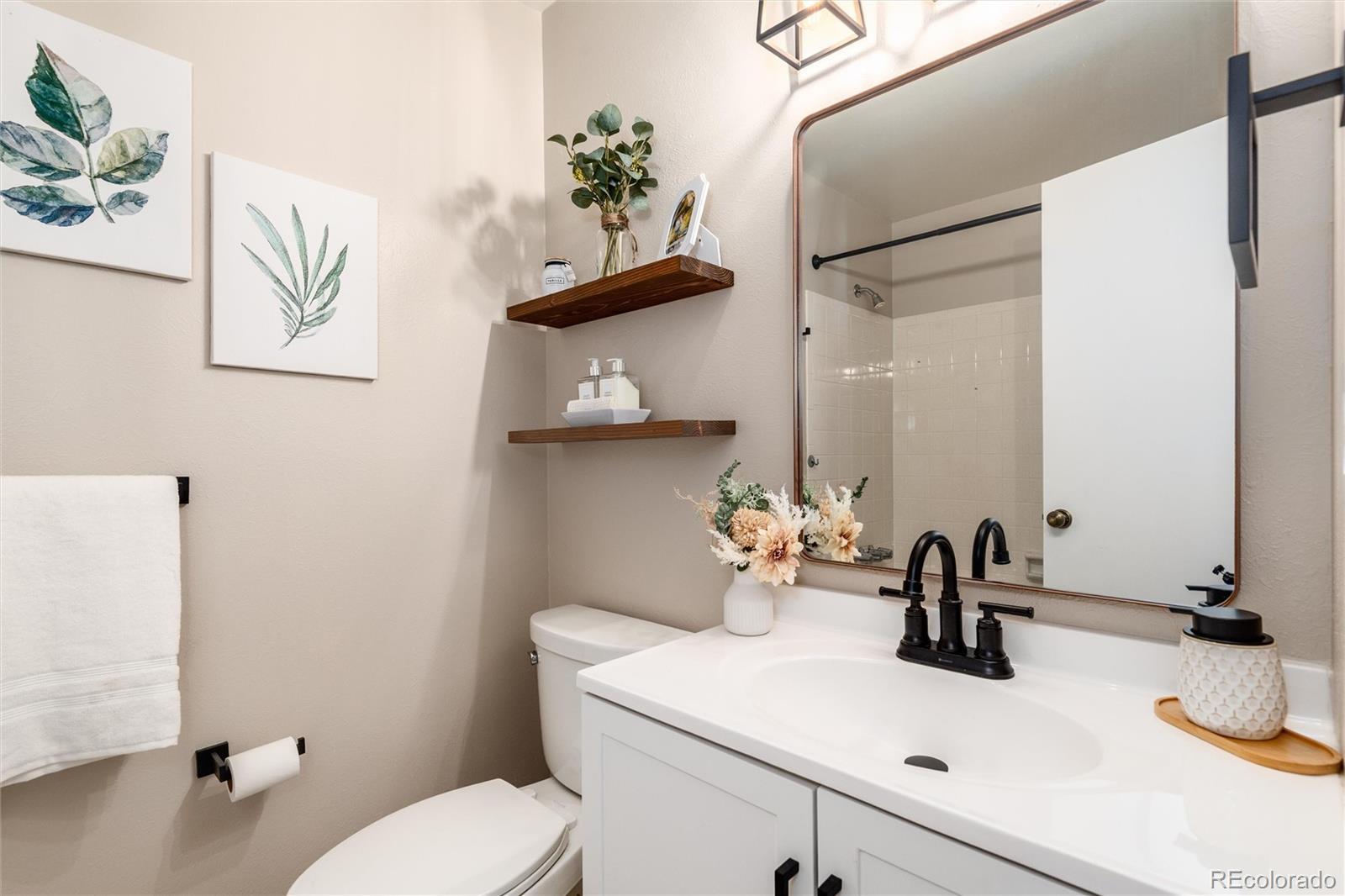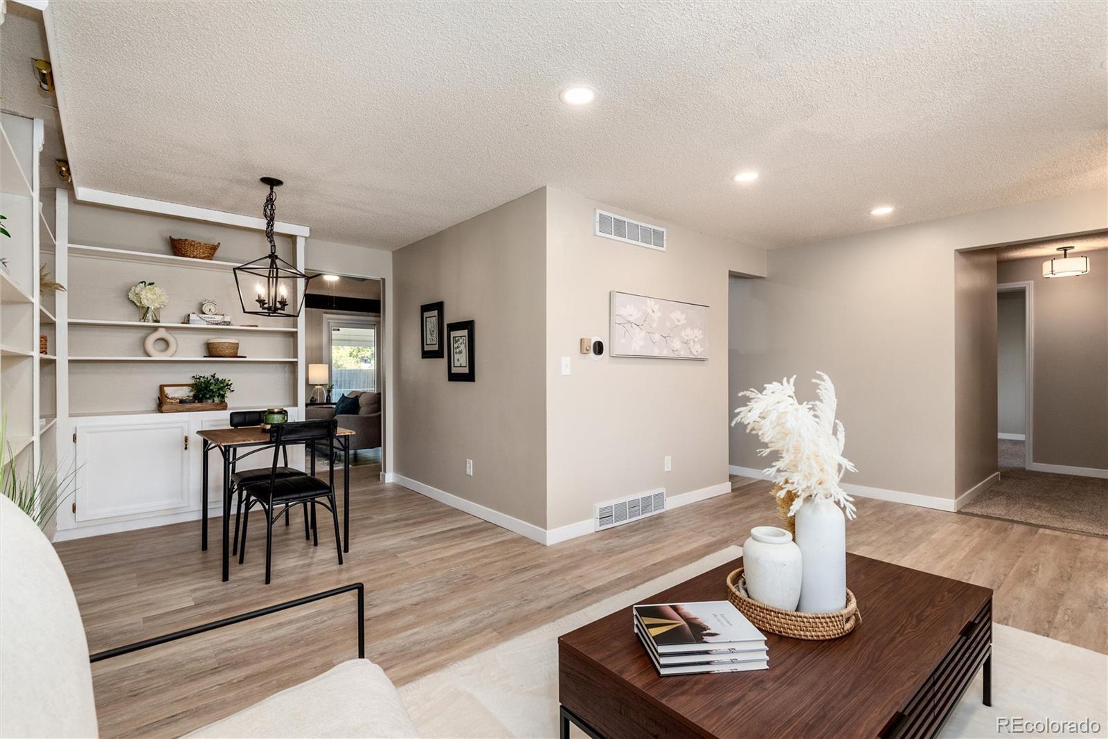 Welcome to this beautifully updated ranch in the highly sought-after Columbine West community. Located on a quiet, elevated street, this home sits on a generous 10,280 sq. ft. lot with mature trees, a fully fenced yard, a charming covered front porch, and a large covered back patio for private outdoor living and year-round enjoyment. Inside, the main level features vaulted ceilings, brand-new high-end vinyl plank flooring, new carpet in the bedrooms and hallway, fresh interior paint, upgraded lighting throughout, and new recessed lighting in the kitchen and living areas. The kitchen offers stainless steel appliances and newly updated cabinet hardware and eat-up island. It opens to the family room which offers a brick surround gas fireplace with wood mantel, vaulted ceilings with wood beam, ceiling fan, and nice window placement looking out onto the wonderful yard. The main floor also showcases two fully remodeled bathrooms with new vanities, toilets, lighting, flooring, mirrors, floating shelves, new flooring and new paint. The home also offers Newer windows, new ceiling fans in the bedrooms and central A/C for comfort and efficiency. The finished basement offers a large multi-purpose rec room, a half bath, utility space, and excellent storage—ideal for a home theater, game room, gym, hobby area, or future customization. The attached garage provides abundant storage and a convenient workbench. Located close to neighborhood parks, trails, schools, restaurants, grocery stores, and commuter routes, this home combines an updated interior, a standout lot, and an exceptional Littleton location!! FULLY PAID OFF SOLAR!!