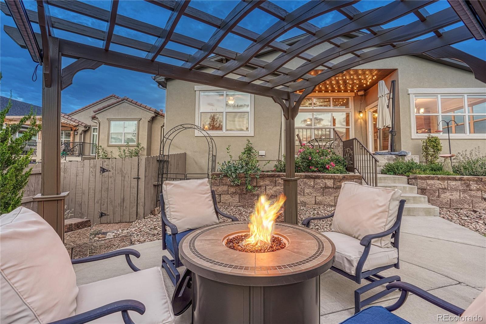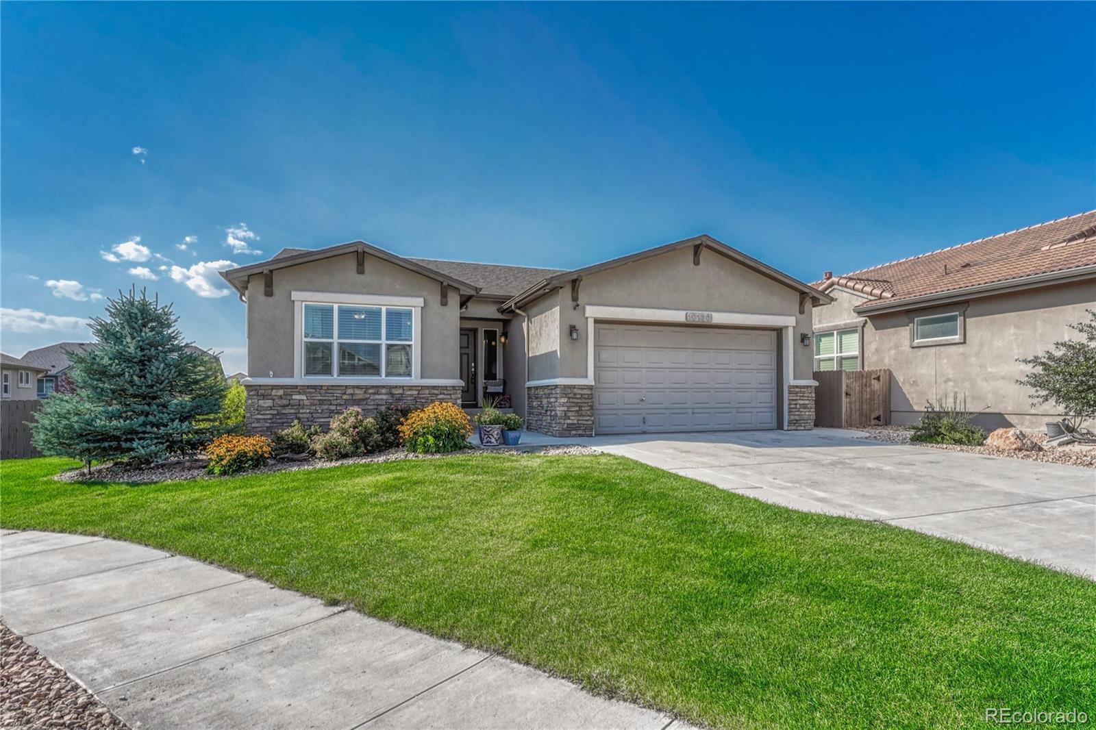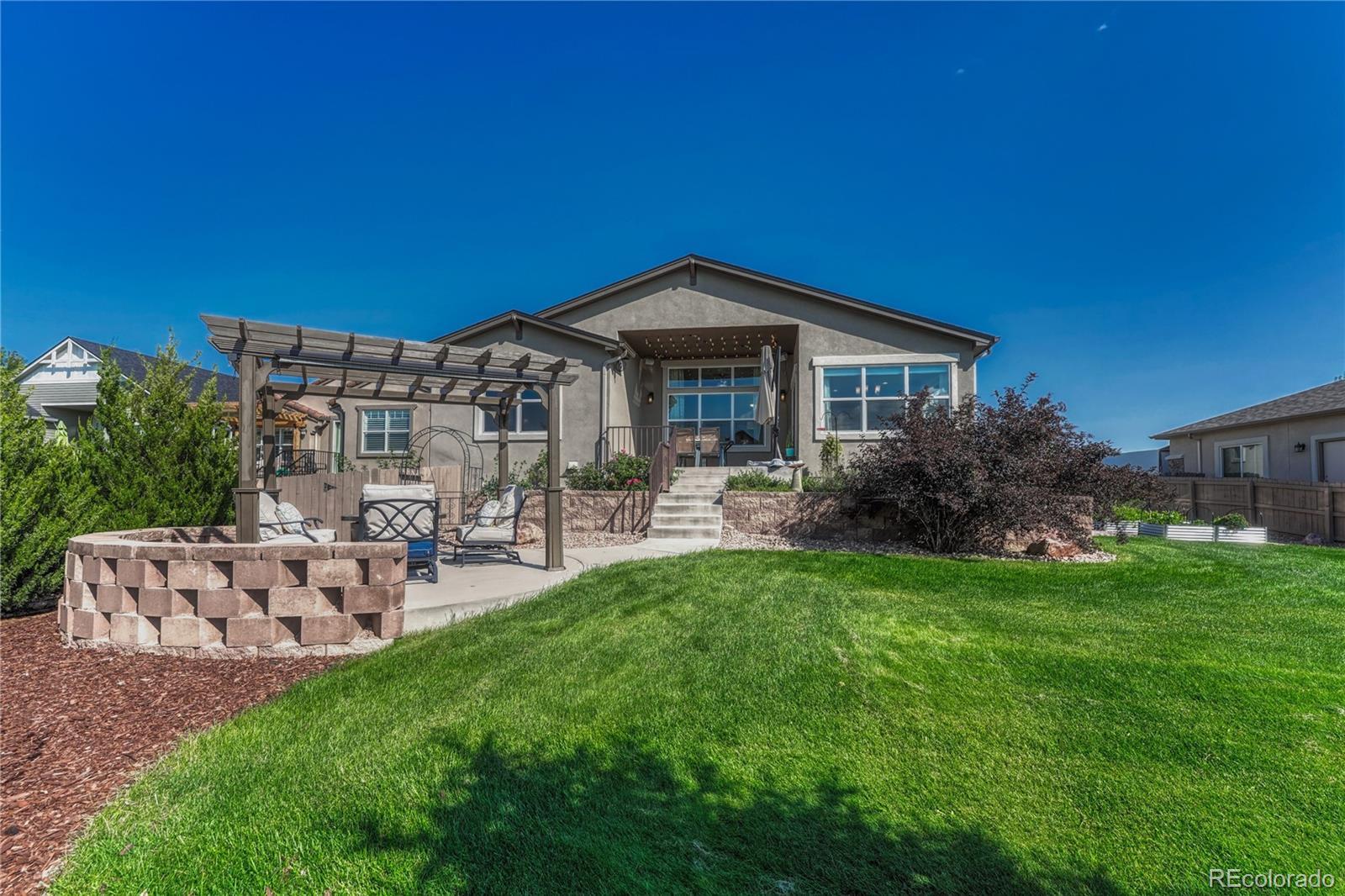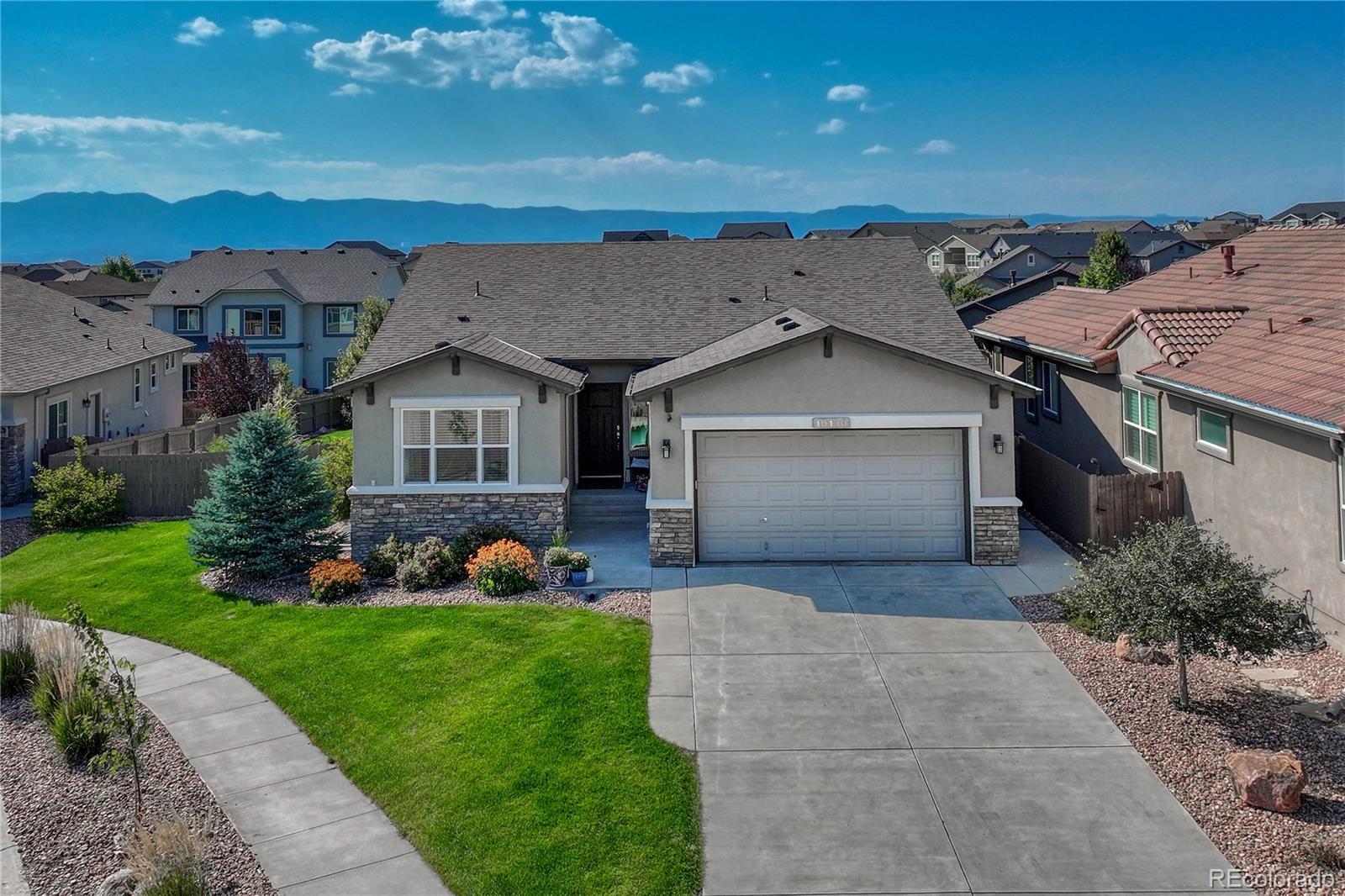Exceptional Move-In Ready Home | Tranquil Gardens | Finished Basement | Pikes Peak Views! Idyllically nestled on a cul-de-sac lot in the quiet and friendly community of Cordera, this 5BR/3BA, 3,368sqft residence truly captures the essence of leisurely living. Boasting a brand-new roof, the rancher affords overflowing curb appeal with stacked stone exterior accents, immaculate landscaping, and neighborly sidewalks. Filled with an inviting aesthetic, the interior delights with high entry ceilings, gorgeous hickory floors, flowing layout, and an elegant formal dining room. Ideal for entertaining, the spacious living room dazzles with a well-appointed fireplace, high ceilings, and built-in bookcases. Explore the chef’s kitchen further to discover stainless-steel appliances, granite countertops, gas stove, soft-close ash cabinets, LG French door refrigerator, and breakfast bar center island. For casual meals, serve guests in the adjoining breakfast nook, which has unobstructed Pikes Peak views & energy-saving cellular shades. Outdoor parties are a breeze in the fenced-in backyard with a sizable patio, custom pergola, sprawling lawn, dog run, mature trees, and a side yard garden boasting produce-packed raised garden beds. Sleep easy in the main-level primary bedroom with vaulted ceilings, walk-in closet, & an attached en suite featuring a huge walk-in shower with bench and a dual sink vanity. All additional bedrooms are generously sized, while the finished basement impresses with an enormous rec room, wiring for surround sound, and abundant flex space. Other considerations: 2.5-car garage, laundry room, security system, Sonos surround sound (living room and patio), quick access to Air Force Academy, Shriever, and Peterson, close to shopping, hospitals, and entertainment, moments from I-25 for easy commutes to Denver and Downtown Colorado Springs, and more! Start living your best life in one of the most coveted communities in Colorado Springs. Schedule your tour TODAY!