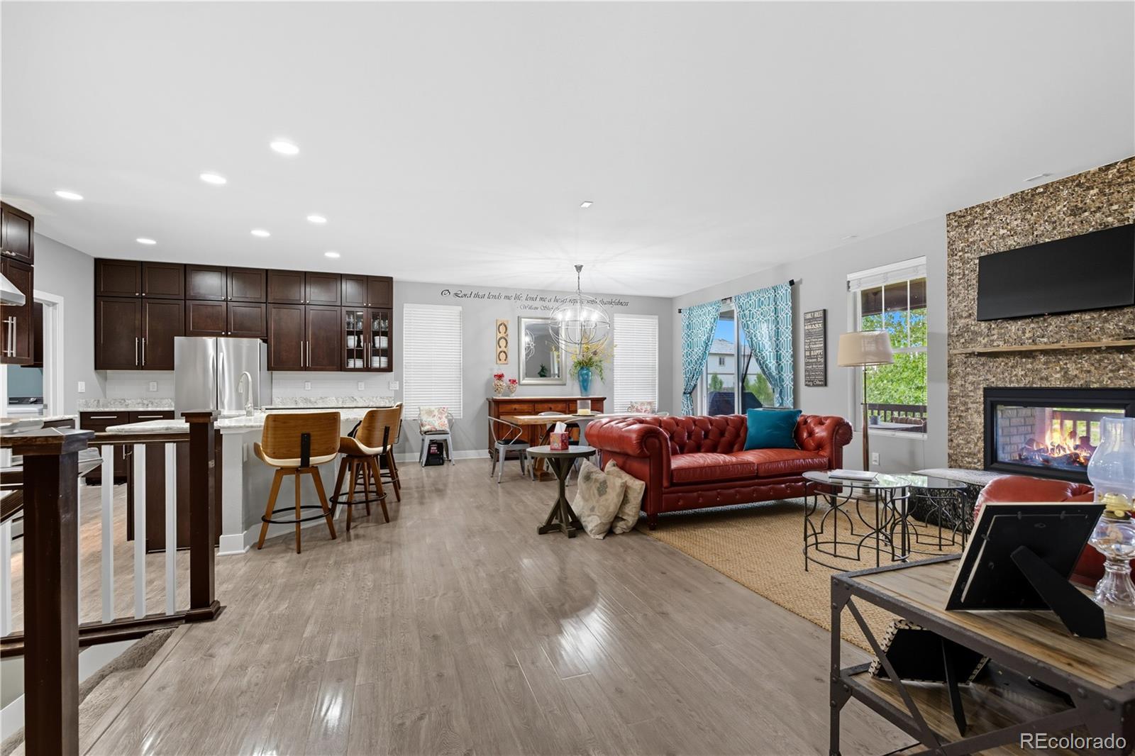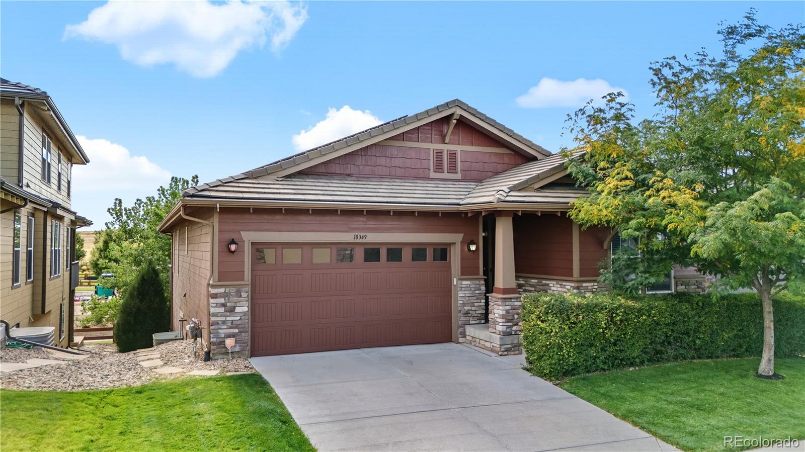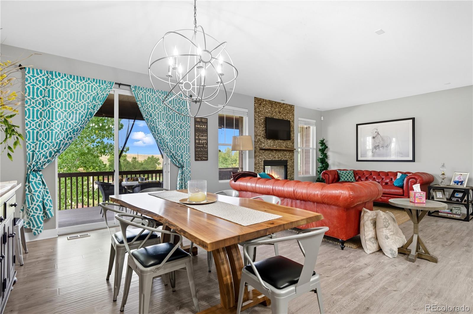 **New Price + Major Upgrades!** Welcome to this beautifully refreshed ranch-style home in the highly sought-after Meridian Village community of Parker. New carpet installed throughout in Dec 2025 and fresh exterior paint completed Oct 2025 enhance the move-in-ready appeal. This 4-bed, 3-bath home offers 3,836 finished sq ft, breathtaking Rocky Mountain and open-space views, and glowing Colorado sunsets from both the main-level deck and walkout patio. Inside, enjoy soaring ceilings, beautiful LVP wood floors, and a seamless open floor plan ideal for everyday living and entertaining. The chef’s kitchen is anchored by a commercial-style KitchenAid dual-fuel range with 6-burner gas cooktop, built-in griddle, double ovens, and commercial hood, complemented by stainless steel appliances, motion-activated Moen faucet, and a spacious walk-in pantry. The dining area shines beneath an elegant chandelier, while a dual-sided fireplace adds cozy ambiance to both the living room and covered outdoor deck for true indoor-outdoor Colorado living. The main level features two bedrooms and two full baths, including a serene primary retreat with sweeping mountain and open-space views, spa-inspired ensuite, and generous walk-in closet. A private office near the entry provides an ideal work-from-home setup. The finished walkout basement expands living space with two additional bedrooms, a full bath, and a versatile family/recreation room opening to the covered patio—perfect for relaxing or entertaining. Enjoy peaceful greenbelt views, direct access to neighborhood walking paths, and a nearby park just moments away.Practical highlights include main-floor laundry with washer and dryer, EV charger in the garage, fully owned solar panels that transfer to the new owner for long-term energy savings, and a durable concrete tile roof. Discover the perfect blend of space, style, efficiency, and Colorado lifestyle living in Meridian Village!