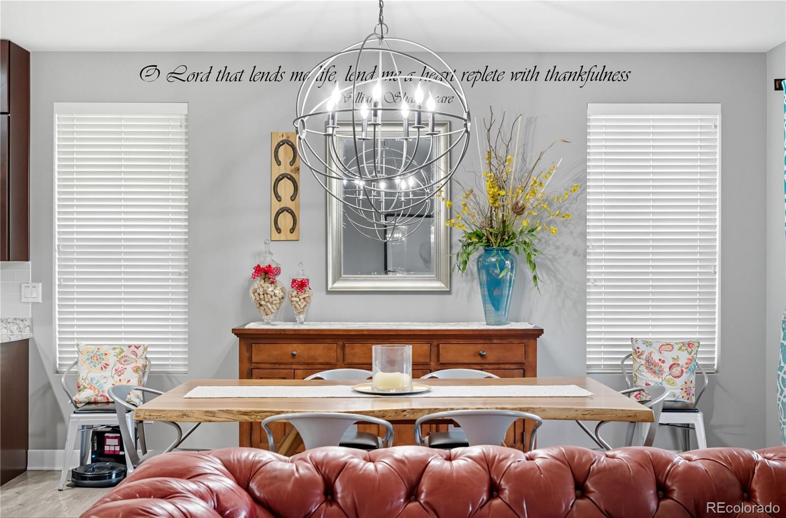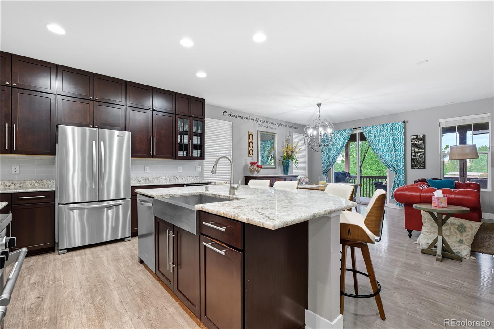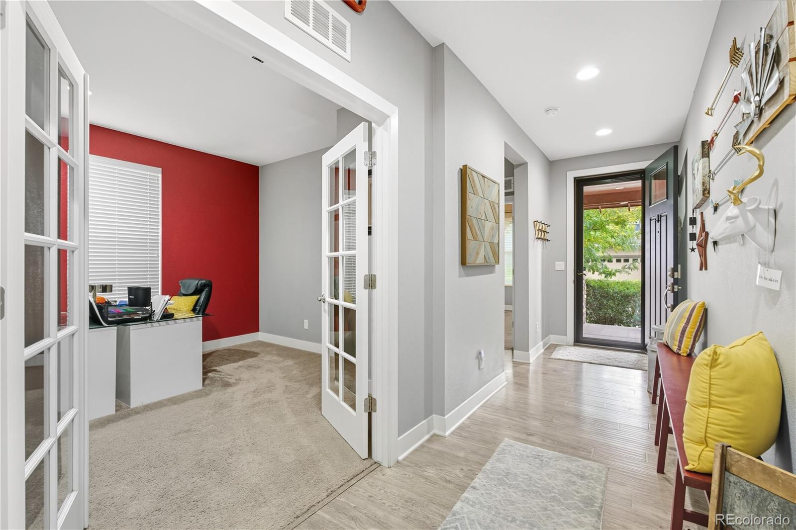 **New Price + Major Upgrades!** Welcome to this beautifully refreshed ranch-style home in the highly sought-after Meridian Village community of Parker. New carpet installed throughout in Dec 2025 and fresh exterior paint completed Oct 2025 enhance the move-in-ready appeal. This 4-bed, 3-bath home offers 3,836 finished sq ft, breathtaking Rocky Mountain and open-space views, and glowing Colorado sunsets from both the main-level deck and walkout patio. Inside, enjoy soaring ceilings, beautiful LVP wood floors, and a seamless open floor plan ideal for everyday living and entertaining. The chef’s kitchen is anchored by a commercial-style KitchenAid dual-fuel range with 6-burner gas cooktop, built-in griddle, double ovens, and commercial hood, complemented by stainless steel appliances, motion-activated Moen faucet, and a spacious walk-in pantry. The dining area shines beneath an elegant chandelier, while a dual-sided fireplace adds cozy ambiance to both the living room and covered outdoor deck for true indoor-outdoor Colorado living. The main level features two bedrooms and two full baths, including a serene primary retreat with sweeping mountain and open-space views, spa-inspired ensuite, and generous walk-in closet. A private office near the entry provides an ideal work-from-home setup. The finished walkout basement expands living space with two additional bedrooms, a full bath, and a versatile family/recreation room opening to the covered patio—perfect for relaxing or entertaining. Enjoy peaceful greenbelt views, direct access to neighborhood walking paths, and a nearby park just moments away.Practical highlights include main-floor laundry with washer and dryer, EV charger in the garage, fully owned solar panels that transfer to the new owner for long-term energy savings, and a durable concrete tile roof. Discover the perfect blend of space, style, efficiency, and Colorado lifestyle living in Meridian Village!