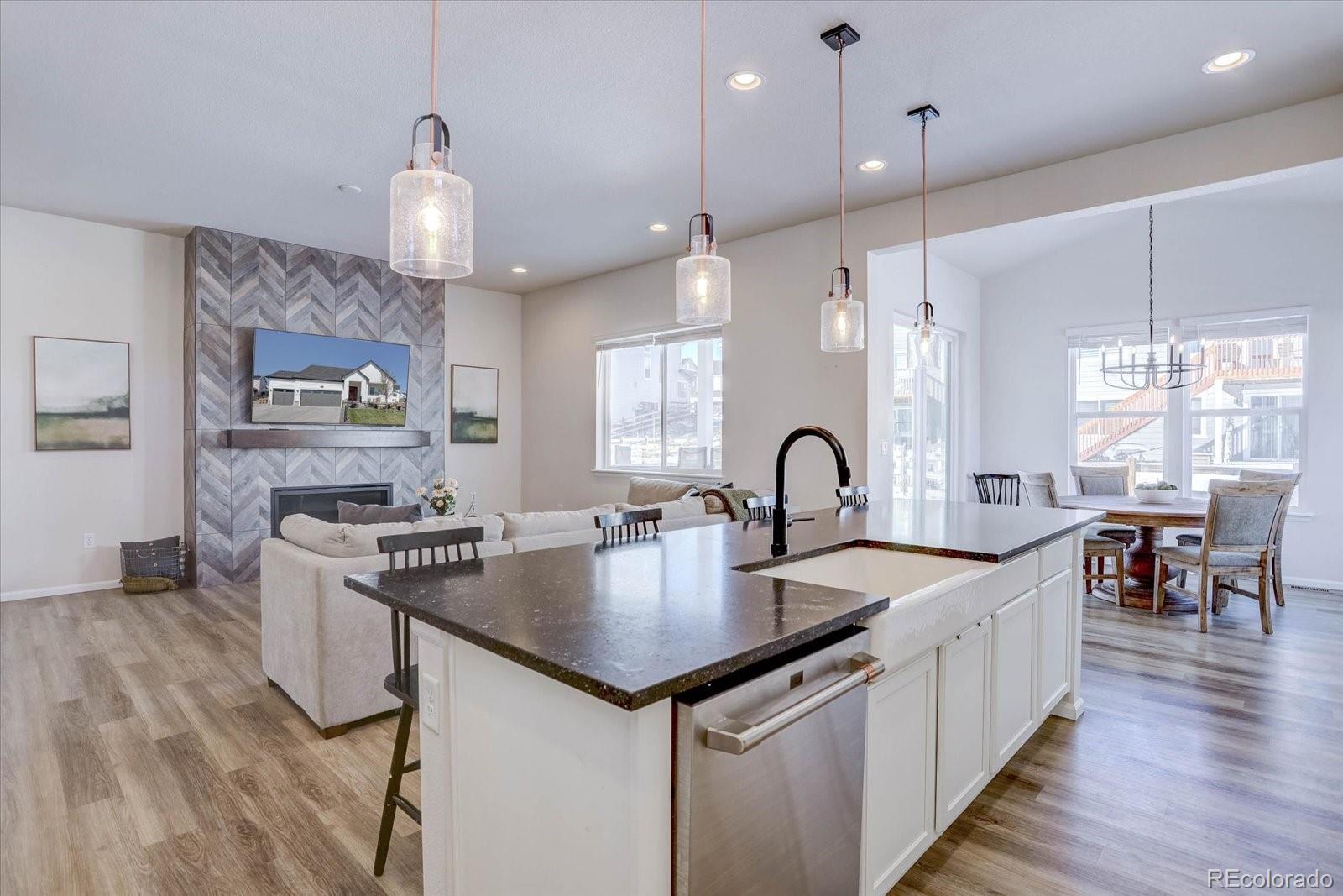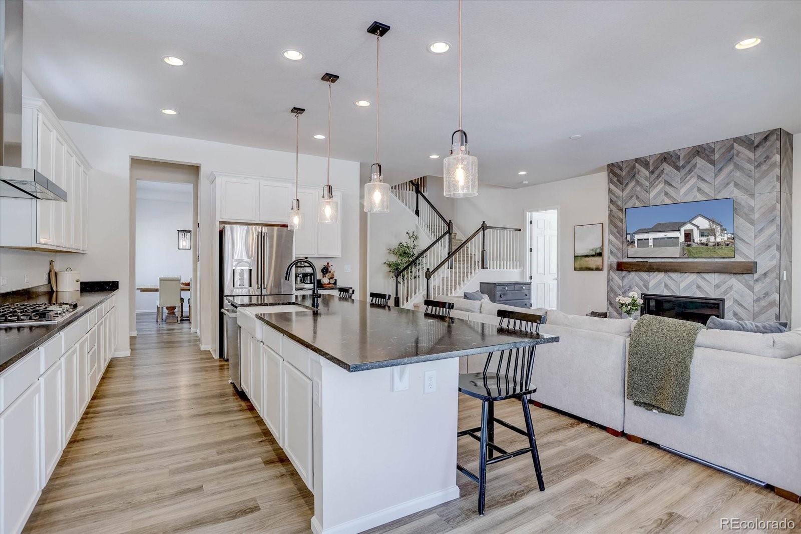 Better than new with $100,000+ in savings! This stunning resale already includes the costly upgrades buyers pay extra for in new construction. Enjoy a fully finished basement, complete landscaping, fencing, and premium structural upgrades—all move-in ready. The home comes equipped with high-end appliances, soaring 14-ft ceilings in the garage, and thoughtful features throughout. Skip the wait, skip the hidden costs, and step into a beautifully completed home that offers luxury and convenience from day one. Welcome to a stunning modern farmhouse in the coveted Independence community. Experience the ultimate in indoor/outdoor living with this beautifully designed home featuring a spacious main floor layout. Offering nearly every premium upgrade, this property is truly move-in ready! Step inside to wide plank luxury vinyl flooring, NEW carpeting, soaring 10-foot ceilings, and a neutral color palette. The centerpiece of the living room is a striking floor-to-ceiling tiled fireplace, creating a cozy yet modern focal point. Natural light floods every corner of the space, adding warmth and charm. The outdoor living space is equally impressive, with a covered patio overlooking a professionally landscaped yard—perfect for entertaining or relaxing year-round. The gourmet kitchen is a chef’s dream, featuring a grand center island with seating for five, custom white cabinetry, quartz countertops, a butler’s pantry, and a large walk-in pantry. Retreat to the main-floor primary suite, complete with a spacious walk-in closet, a luxurious 5-piece ensuite bath, and quartz countertops. Additional main-floor highlights include a front-facing office with French doors, perfect for working from home, and two upstairs bedrooms with a shared hall bath, offering a unique blend of privacy and flow. The finished basement extends the living space with a large open area, two bedrooms, and a full bathroom—ideal for guests, hobbies, or additional family members.