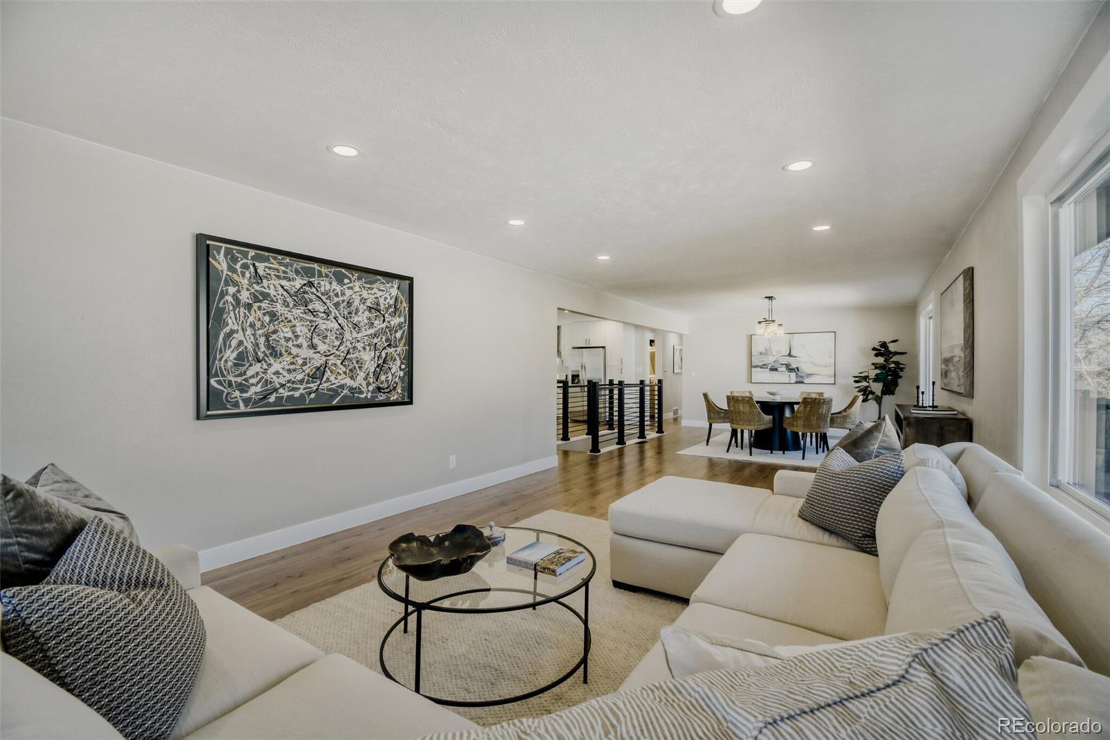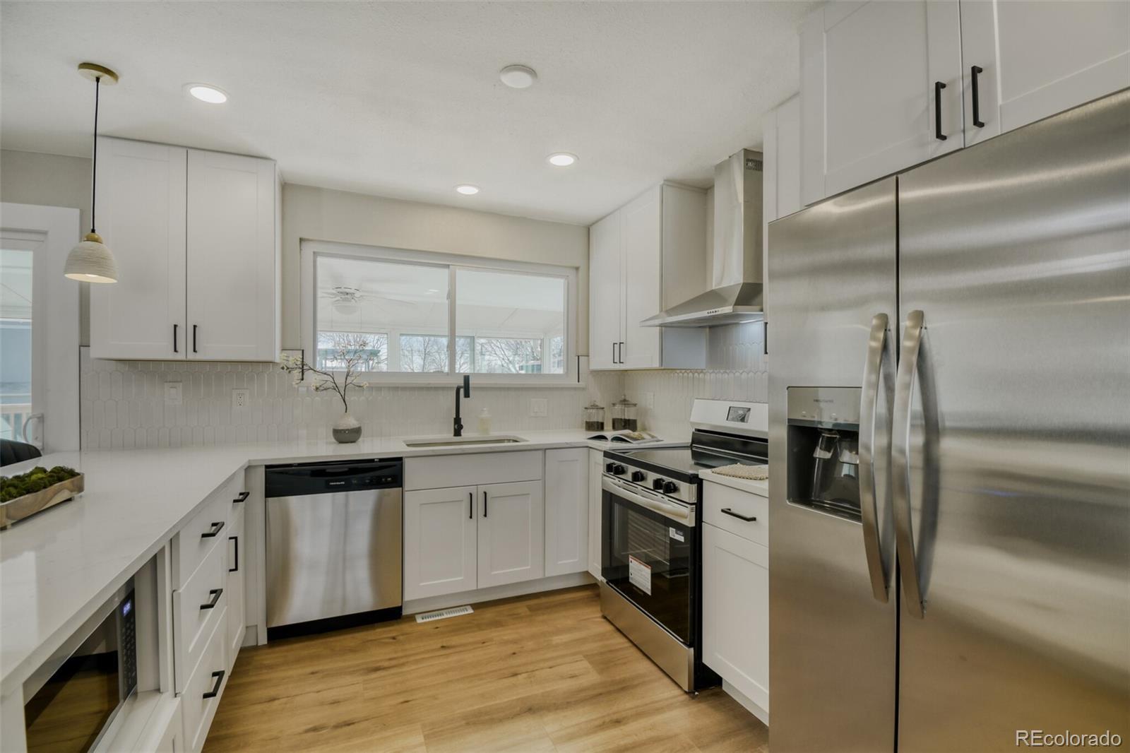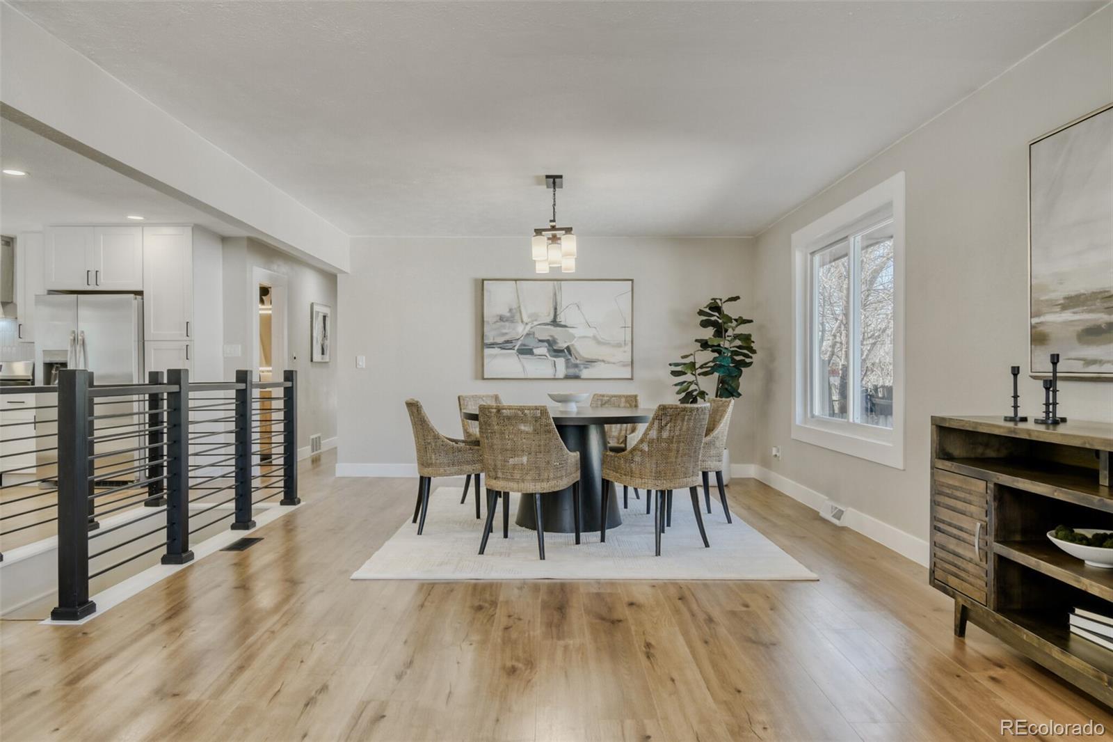 Welcome home to this rare, completely remodeled 6-bedroom, 3-bathroom ranch nestled in one of Arvada’s most desirable areas. From the moment you step inside, you’re greeted by gleaming floors, abundant natural light, and a stunning bay window that creates the perfect warm and welcoming first impression. As you continue through the home, you’ll fall in love with the open-concept layout, designed for both everyday living and effortless entertaining. The spacious dining area flows seamlessly into the large eat-in kitchen, featuring brand-new cabinetry, stainless steel appliances, gorgeous quartz countertops, and thoughtful modern finishes throughout. The spacious primary suite offers a peaceful retreat, complete with a walk-in closet and a private en-suite bathroom showcasing a double vanity and walk-in shower. Downstairs, the finished basement offers incredible versatility with a large flex space perfect for movie nights, game days, parties, or a play area. You’ll also find three additional bedrooms — ideal for guests, a home office, hobby space, or workout room. Just off the kitchen, the attached sunroom is perfect for summer dinners or morning coffee. Step outside to the massive deck — ready for grilling, entertaining, and enjoying Colorado’s beautiful seasons. Conveniently located near grocery stores, restaurants, and with easy access to I-76 and I-70, this home truly offers comfort, space, and convenience all in one. Solar panels are owned and already paid for. Enjoy lower energy bills! New A/C, furnace is 1 year old, and roof is in great shape! This move-in-ready home is waiting for you to make it your own.