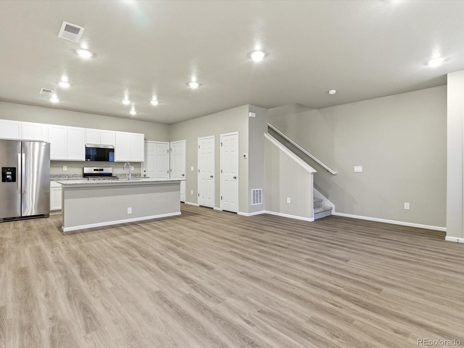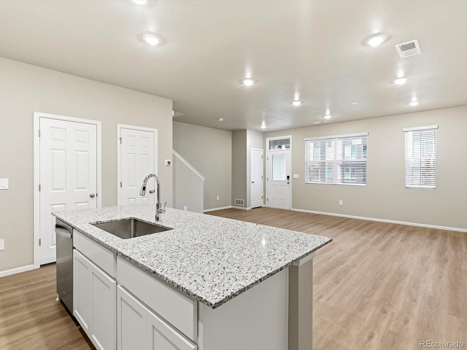 Open concept kitchen with granite countertops and white cabinets! The Orchard is a stylish two-story townhome featuring an open-concept main floor and a charming covered front porch. Upstairs offers a private primary suite with walk-in closet, plus two additional bedrooms and a versatile landing space. With 2.5 baths and a two-bay garage, this design blends comfort and functionality. The Meritage Home difference includes spray-foam insulation, advanced air filtration for year-round comfort and healthier air, and durable cementitious siding known for its strength, fire-resistance, and long-lasting performance. A Whirlpool appliance package, and full home blinds are also included for move-in convenience. Welcome home where every detail is built for comfort, efficiency, and LIFE. BUILT. BETTER. Horizon Uptown is a walkable, master-planned community in Aurora featuring parks, a dog park, and tennis courts. Located at I-70 and E-470, it offers quick access to Denver International Airport, downtown Denver, the Fitzsimons Innovation Community, the Denver Tech Center, and major entertainment destinations. *This home qualifies for special incentives through builder preferred lender for a limited time. Terms and conditions apply. See sales counselor for details!