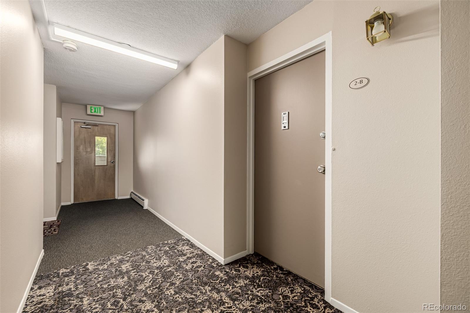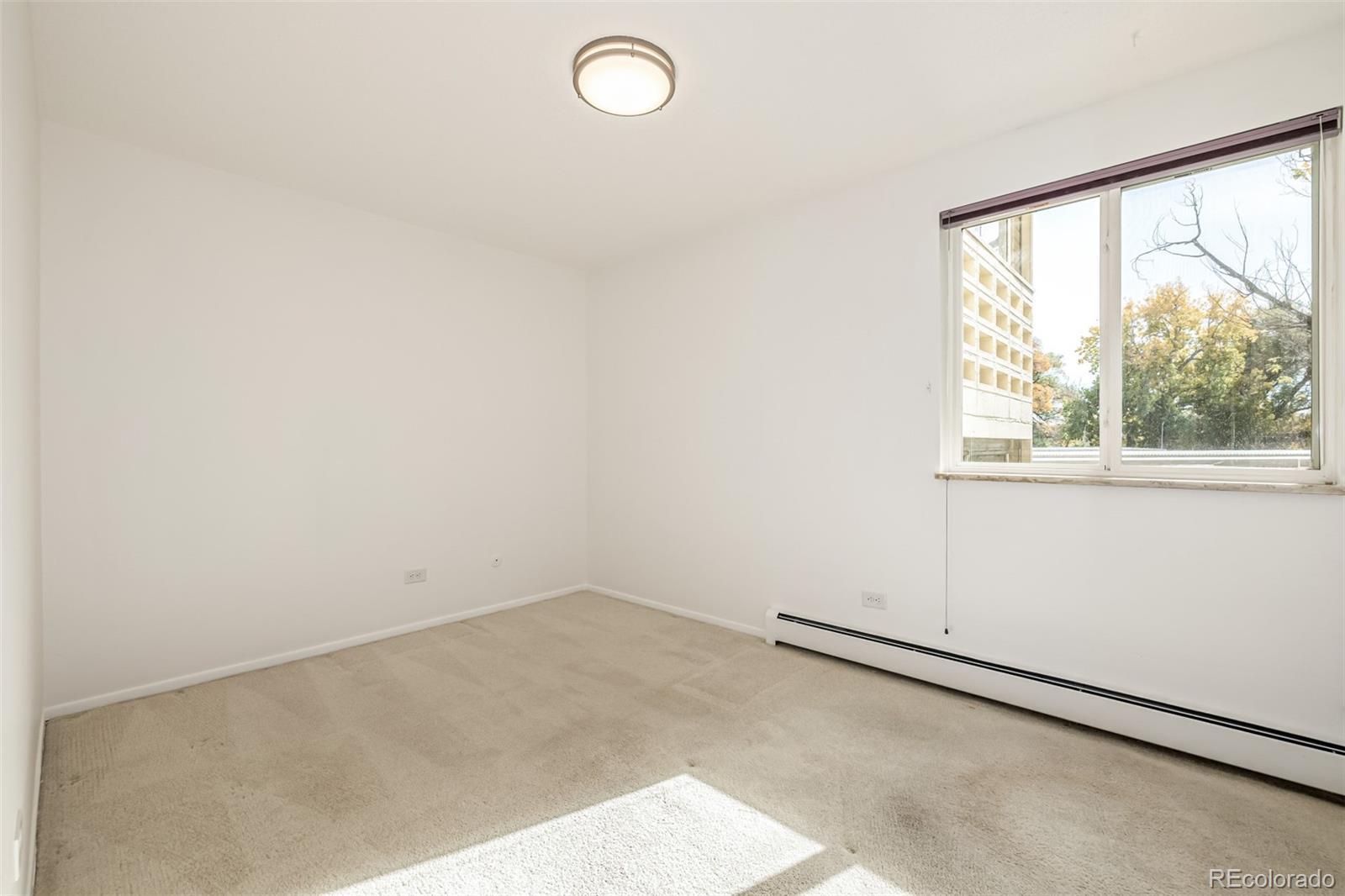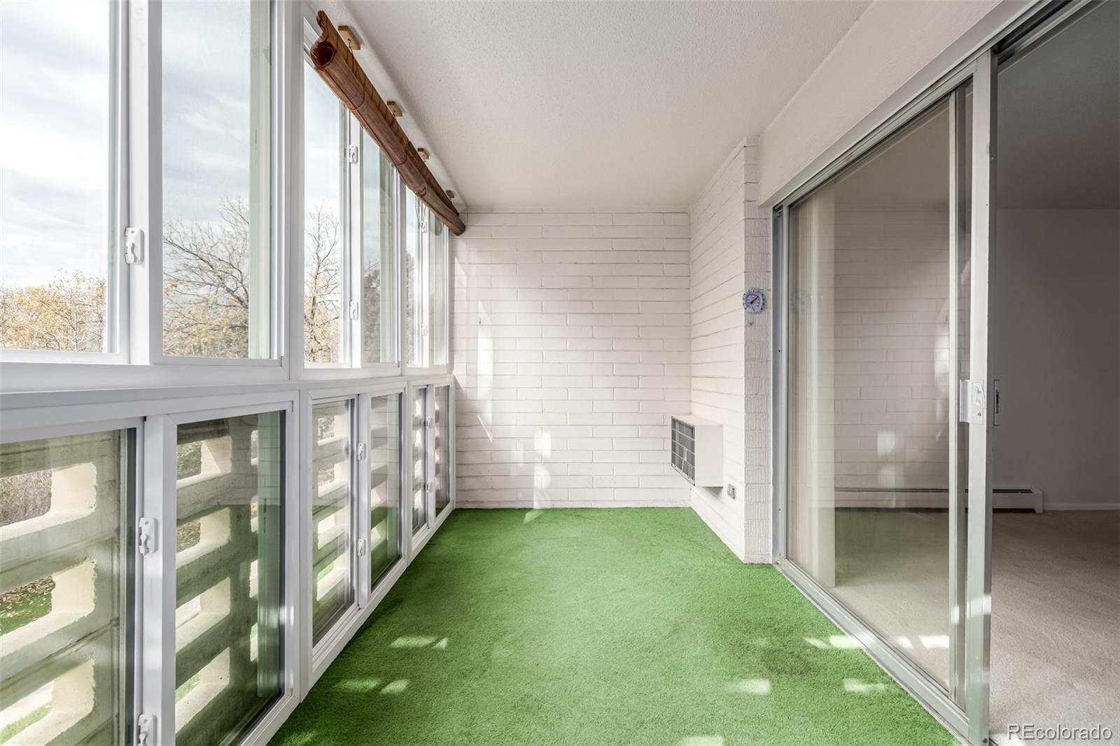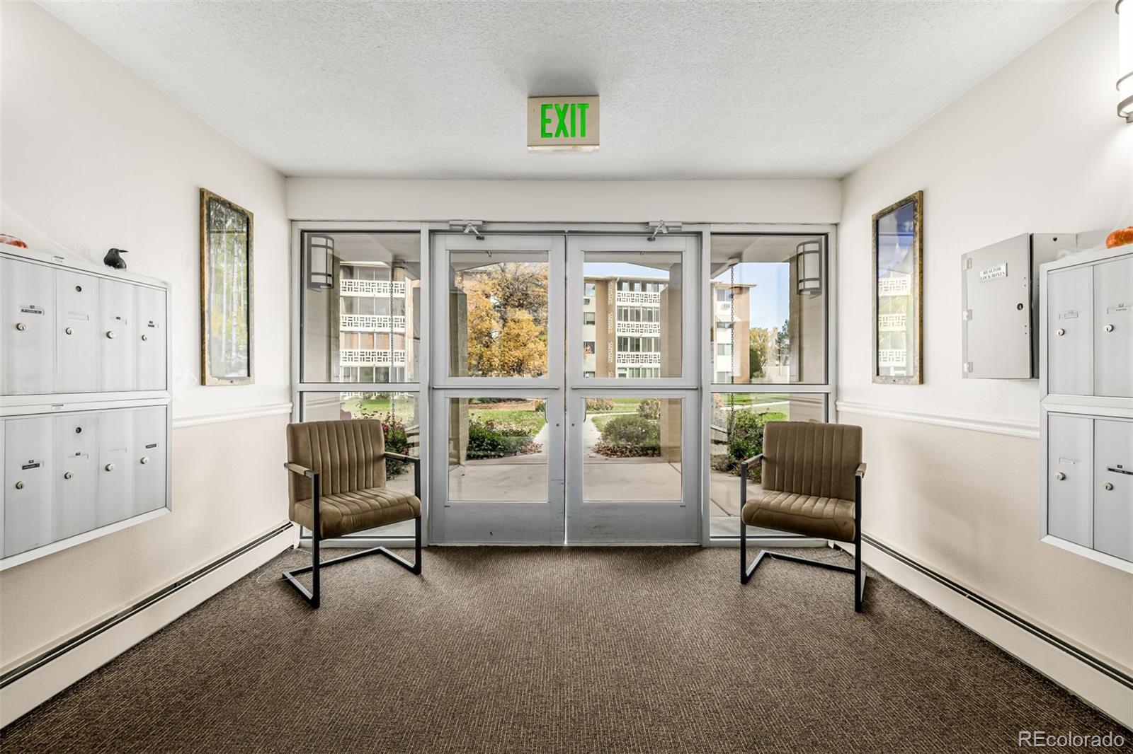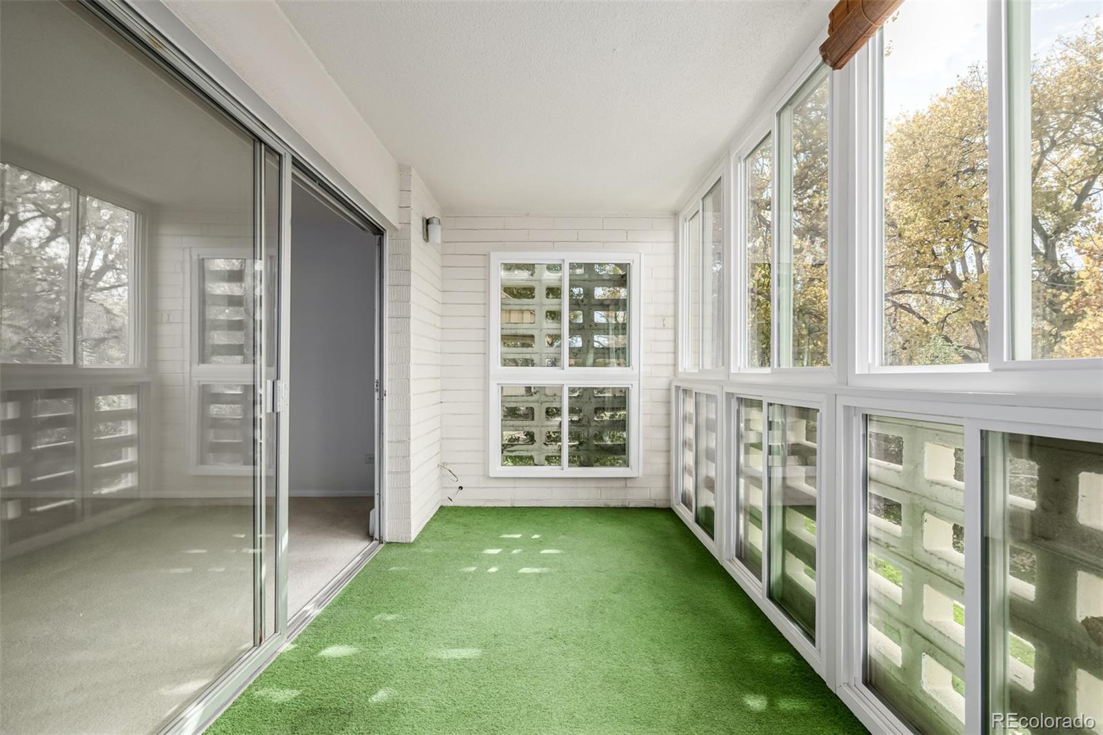 Tucked away in one of the most private and peaceful locations in Windsor Gardens, this beautifully refreshed corner-unit condo offers rare privacy, premium views, and quiet comfort. This ranch-style 2-bed 1 bath unit has just been freshly painted and deep cleaned, carpets cleaned and is ready for immediate move-in. Inside, you'll find a remodeled walk-in shower with a grab bar for safe, easy access. Located in a secured building with locked foyer entry, elevator and stair access, and just two doors from the laundry room, convenience is key. As a corner unit, it features extra windows in the bedroom, providing abundant natural light and added views to the SW. The private lanai is ideal for relaxing with scenic, unobstructed views in all seasons. Includes a deeded parking space. HOA dues cover heat, water, sewer, trash, building maintenance, and even property taxes—truly low-maintenance living! Windsor Gardens is Denver’s premier 55+ community with incredible amenities including a 9-hole golf course, clubhouse, indoor/outdoor pools, fitness center, restaurant, and 24/7 armed security with body cams. Enjoy trails, events, and clubs, all just minutes to Cherry Creek, Lowry, and major services.