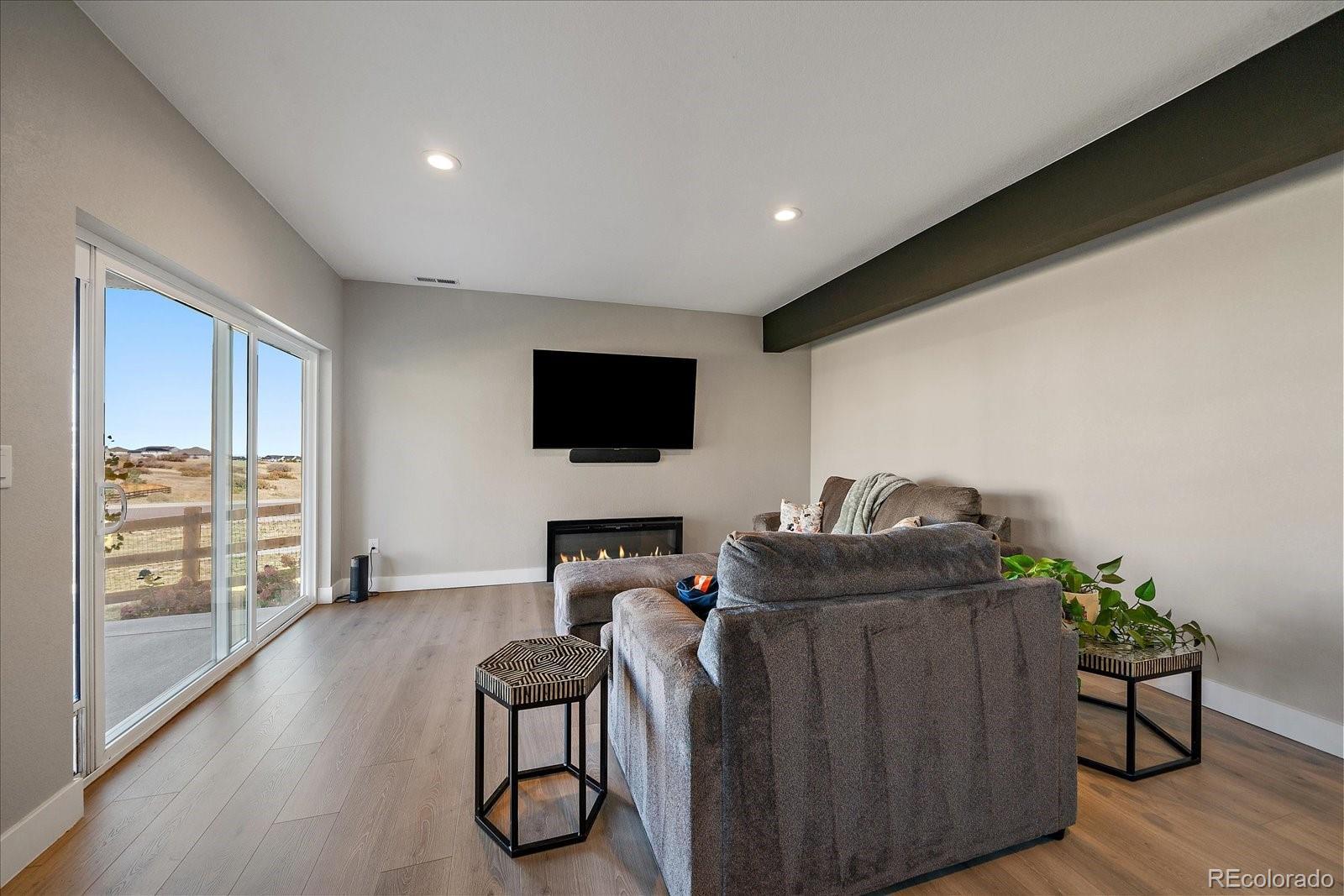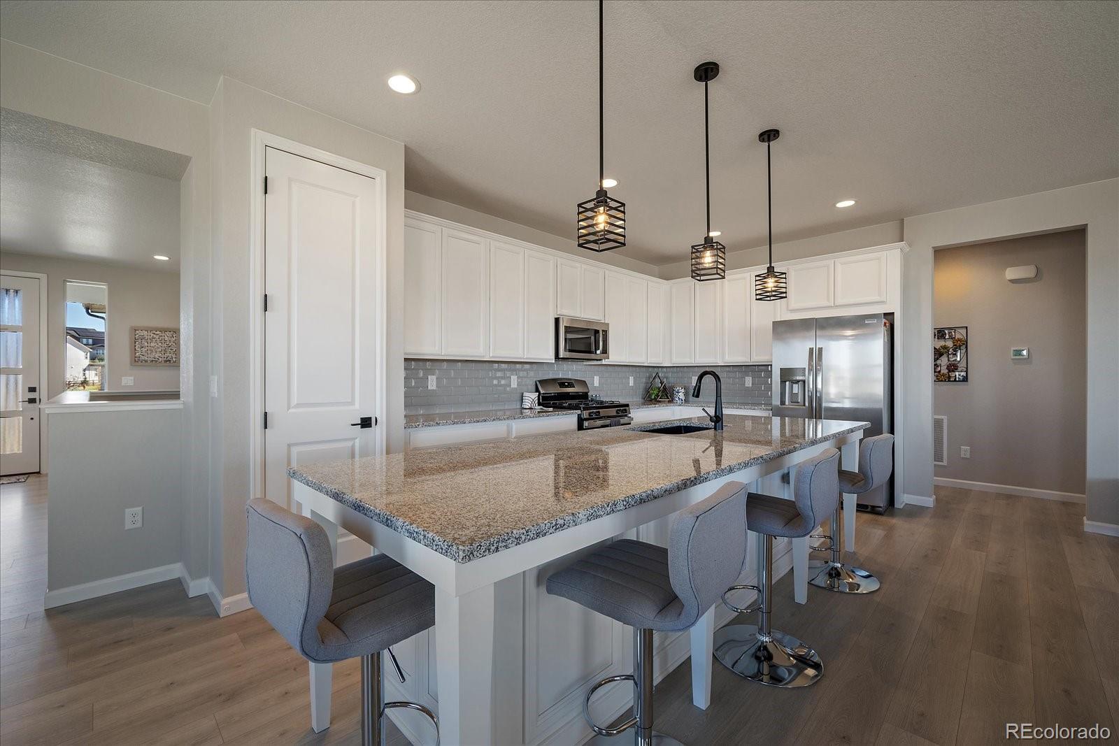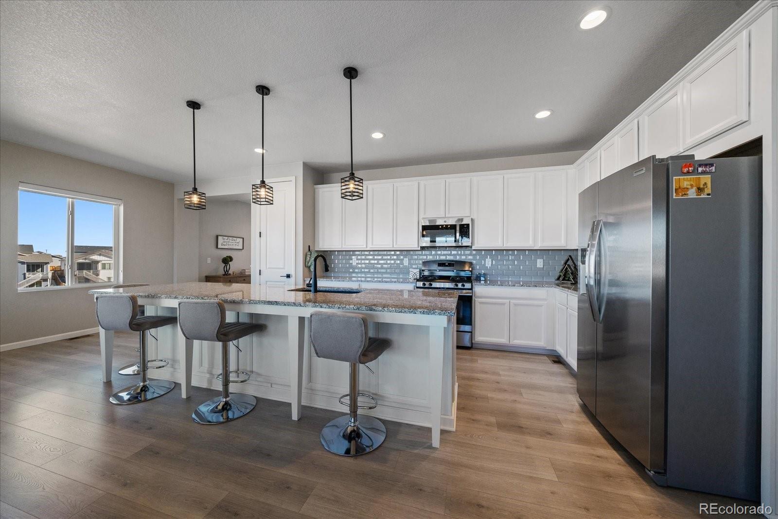 Welcome Home! This 3 Bed, 4 Bath stunning finished walk-out ranch will not disappoint. Located at the end of a cul-de-sac backing to open space with professional landscaping. This Taylor Morrison Flatirons Model is spacious, with a functional, well appointed floor plan that has an open concept design, a main floor office, an oversized covered deck, large kitchen with beautiful cabinets and large center island. The Primary Suite features a large spa shower and walk-in closet. The laundry room has a washer and dryer (purchased in 2020) that is included and a utility sink with storage. The 2nd main floor bedroom has a full bath ensuite. In the finished basement you will find a bedroom with a large walk-in closet, a 3/4 bath with a no-lip rain shower, and a large family room ready for entertaining, with Custom Black Beams, and luxury vinyl plank flooring. You can walk right out to the professionally landscaped back yard with additional concrete patio and walkway, backing to open space. All door knobs, hinges, door handles, faucets, towel bars and lighting have been upgraded to a matte black. The kitchen sink has been upgraded to a black silgranite farm sink. All bedrooms have fandaliers. There is a list of inclusions in Supplements.