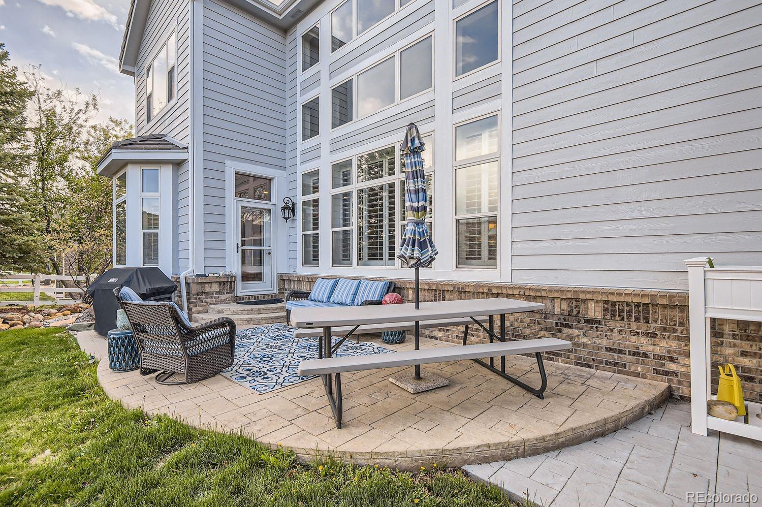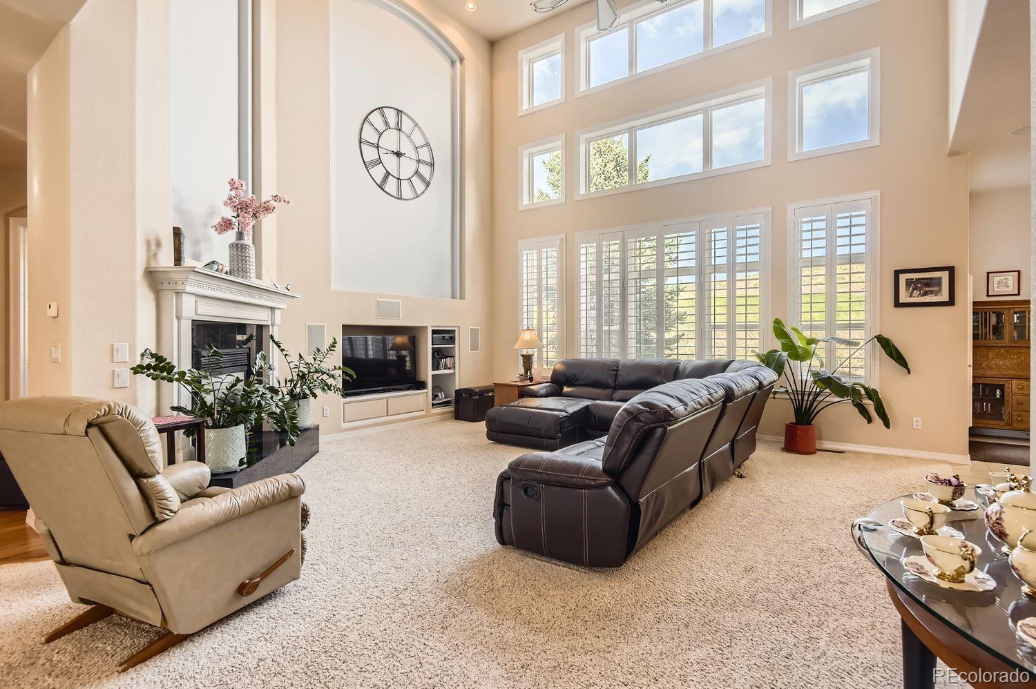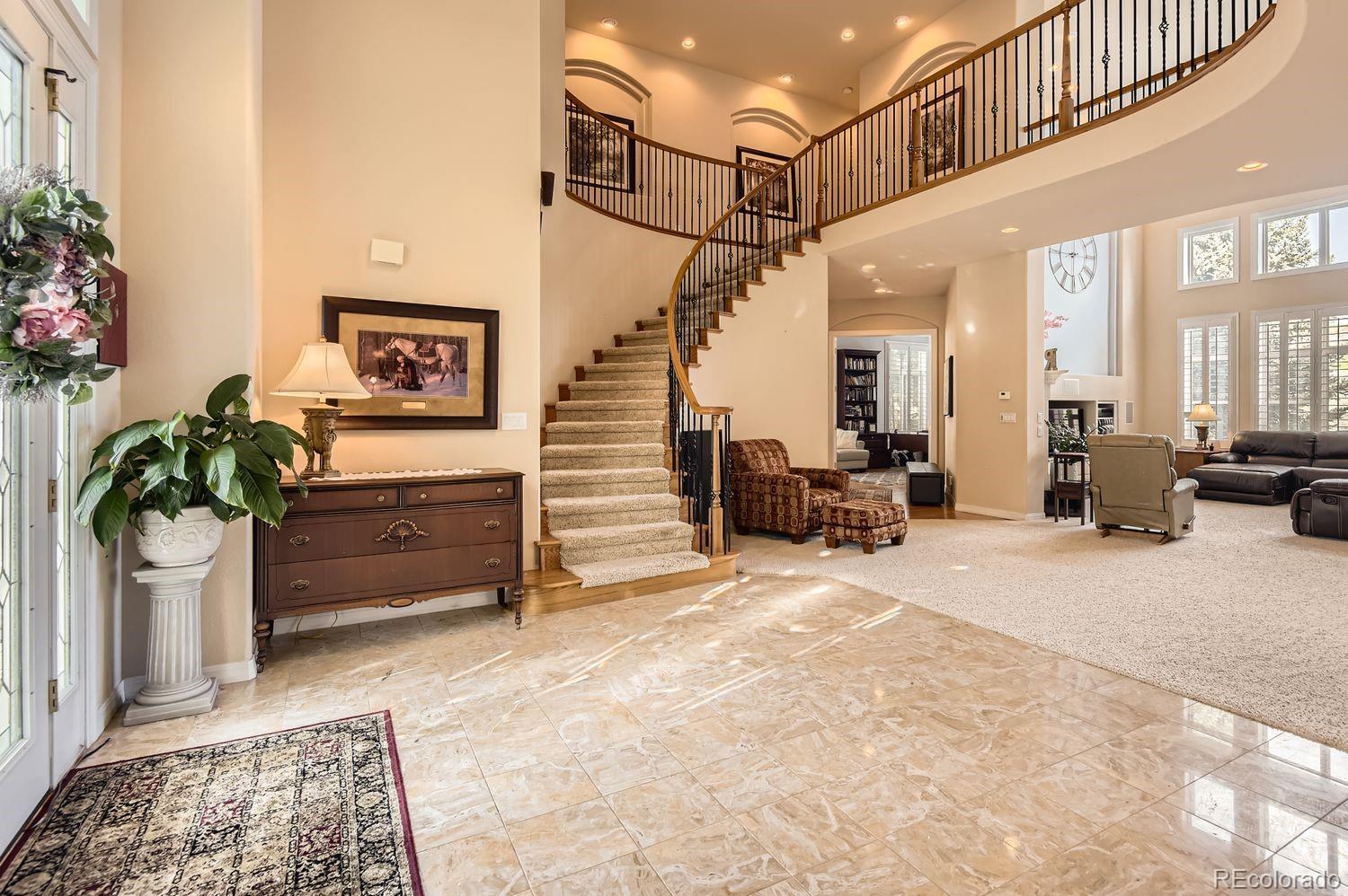 Welcome! Check out this beautiful executive home in Carriage Club, ideally located adjacent to Douglas County-Bluffs Regional Trail Open Space, featuring 3 miles of walking, hiking, biking and horseback riding trails! Step into this gorgeous home to find a grand foyer with 20 foot ceilings, an elegant spiral staircase to the second story, and wall to wall windows with custom plantation shutters. This home's highly flexible floor plan features 5 bedrooms and 5 bathrooms, a private office, AND another 2000+ square feet of finished living space in the basement. You're sure to love the gourmet kitchen, with slab granite counter tops including a large island, a 5 burner gas cook top, stainless steel appliances including a NEW double oven, NEW garbage disposal, and tons of cabinet space along with an adjacent butler's pantry. Venture upstairs to discover an open landing and bridge along with 4 bedrooms and 3 baths. On one side of the overlook is the spacious primary suite, which offers newer wainscoting and crown molding, lovely mountain views, a cozy double-sided fireplace and sitting area, dual walk-in closets and a luxurious 5-piece bathroom with vaulted ceilings. On the other side are 2 more bedrooms sharing a Jack-and-Jill style bathroom, and one more bedroom with its own ensuite bathroom - an ideal setup for guests. The finished basement has new carpet, tile, and paint, and provides tons of options for customizing your ideal living setup. You'll find a huge rec/game/media space with a built-in wet bar, a designated workout room, and the 5th bedroom and bathroom with a walk-in steam shower. Many upgrades have already been made to this home, including a new 50 gallon water heater, newer paint and crown molding in 3 bedrooms, updated landscaping with new lighting in the front and back yards, a Lifetime Playset, exterior paint and light fixtures, a new whole house humidifier, a radon mitigation system, and more. This home is a MUST SEE!