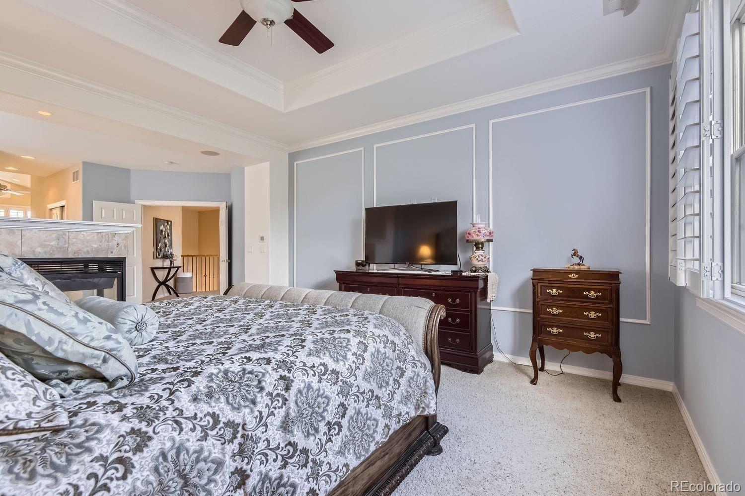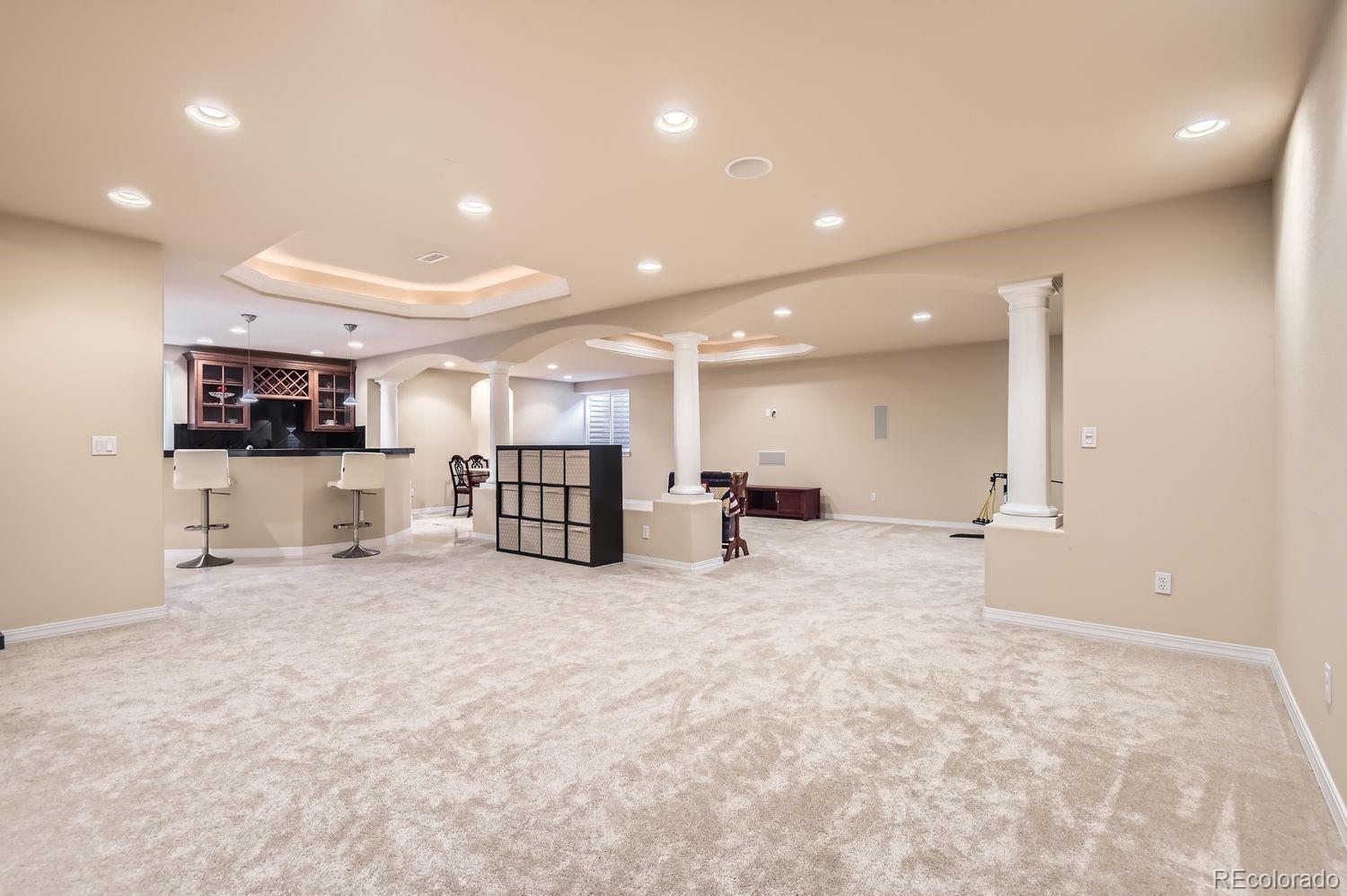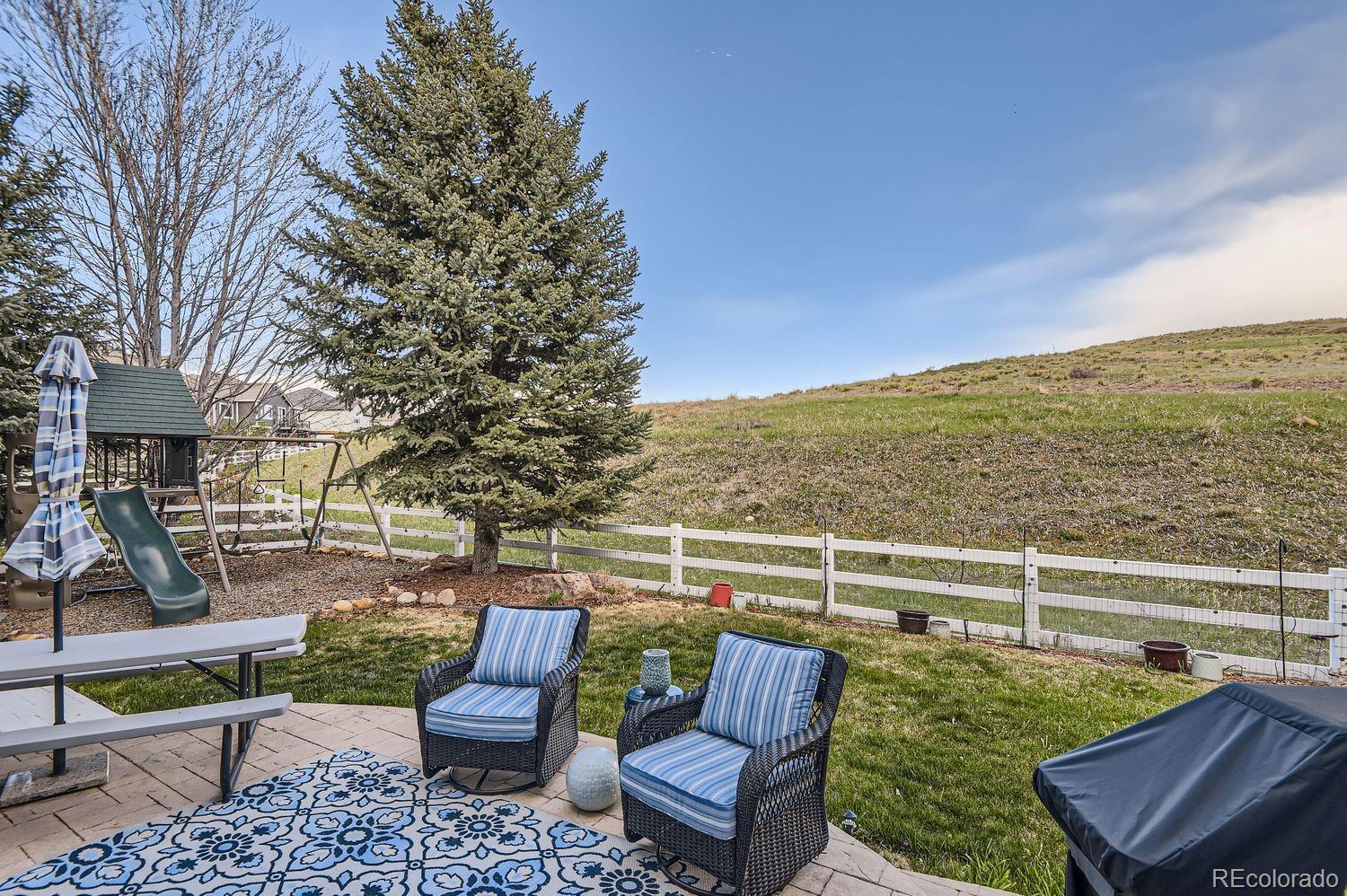 Welcome! Check out this beautiful executive home in Carriage Club, ideally located adjacent to Douglas County-Bluffs Regional Trail Open Space, featuring 3 miles of walking, hiking, biking and horseback riding trails! Step into this gorgeous home to find a grand foyer with 20 foot ceilings, an elegant spiral staircase to the second story, and wall to wall windows with custom plantation shutters. This home's highly flexible floor plan features 5 bedrooms and 5 bathrooms, a private office, AND another 2000+ square feet of finished living space in the basement. You're sure to love the gourmet kitchen, with slab granite counter tops including a large island, a 5 burner gas cook top, stainless steel appliances including a NEW double oven, NEW garbage disposal, and tons of cabinet space along with an adjacent butler's pantry. Venture upstairs to discover an open landing and bridge along with 4 bedrooms and 3 baths. On one side of the overlook is the spacious primary suite, which offers newer wainscoting and crown molding, lovely mountain views, a cozy double-sided fireplace and sitting area, dual walk-in closets and a luxurious 5-piece bathroom with vaulted ceilings. On the other side are 2 more bedrooms sharing a Jack-and-Jill style bathroom, and one more bedroom with its own ensuite bathroom - an ideal setup for guests. The finished basement has new carpet, tile, and paint, and provides tons of options for customizing your ideal living setup. You'll find a huge rec/game/media space with a built-in wet bar, a designated workout room, and the 5th bedroom and bathroom with a walk-in steam shower. Many upgrades have already been made to this home, including a new 50 gallon water heater, newer paint and crown molding in 3 bedrooms, updated landscaping with new lighting in the front and back yards, a Lifetime Playset, exterior paint and light fixtures, a new whole house humidifier, a radon mitigation system, and more. This home is a MUST SEE!