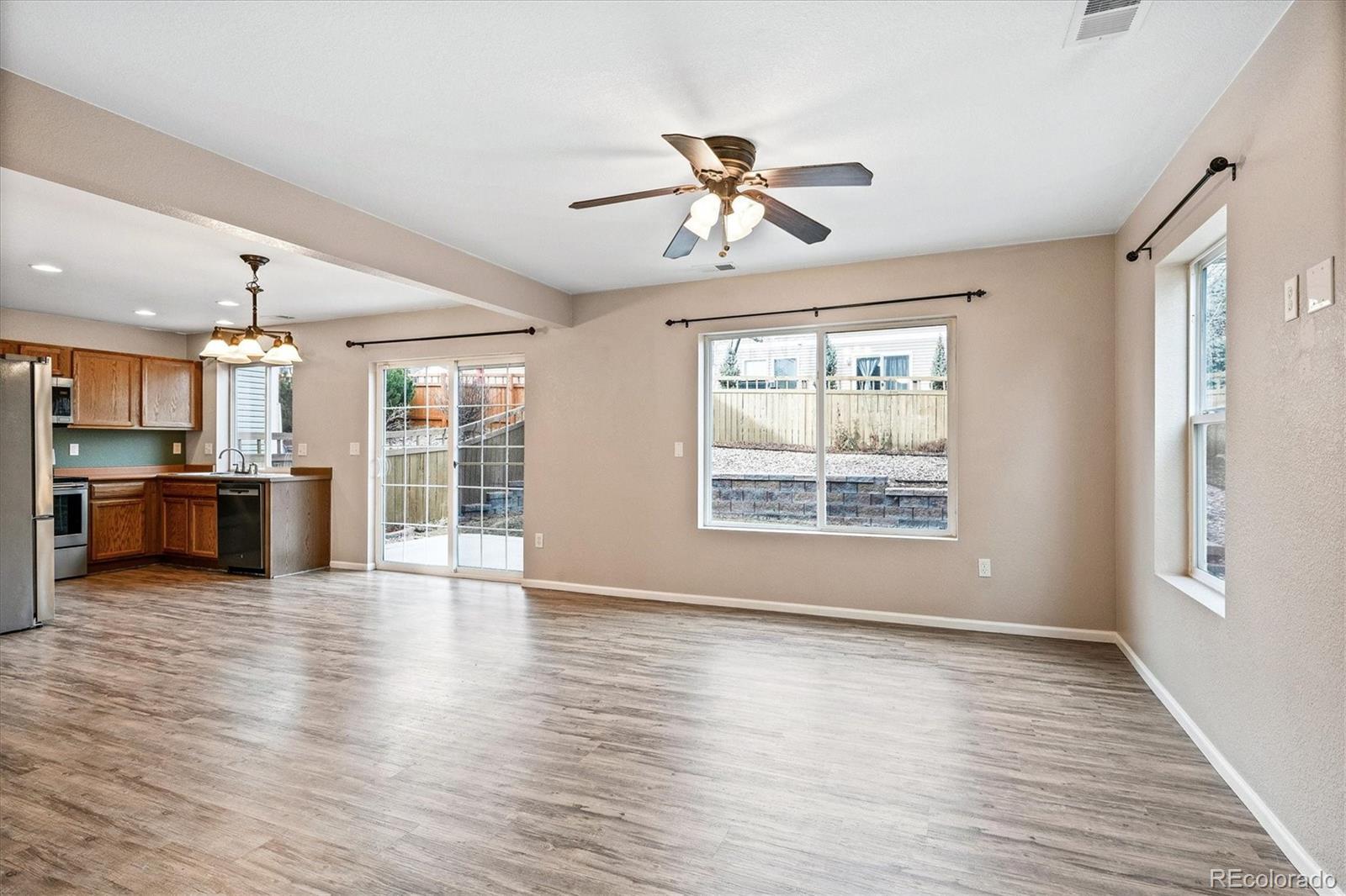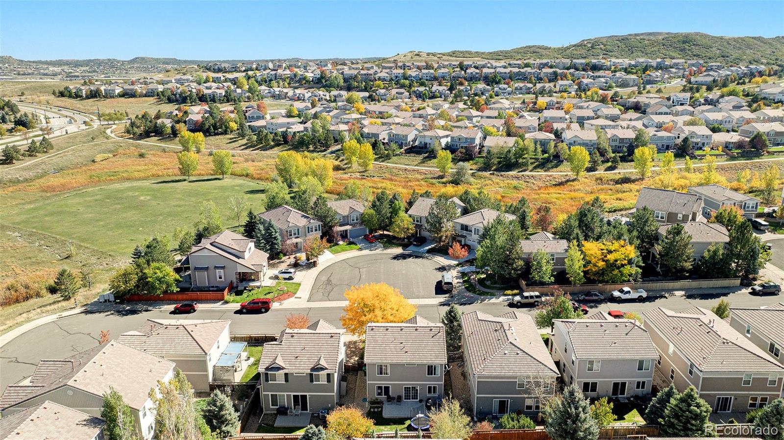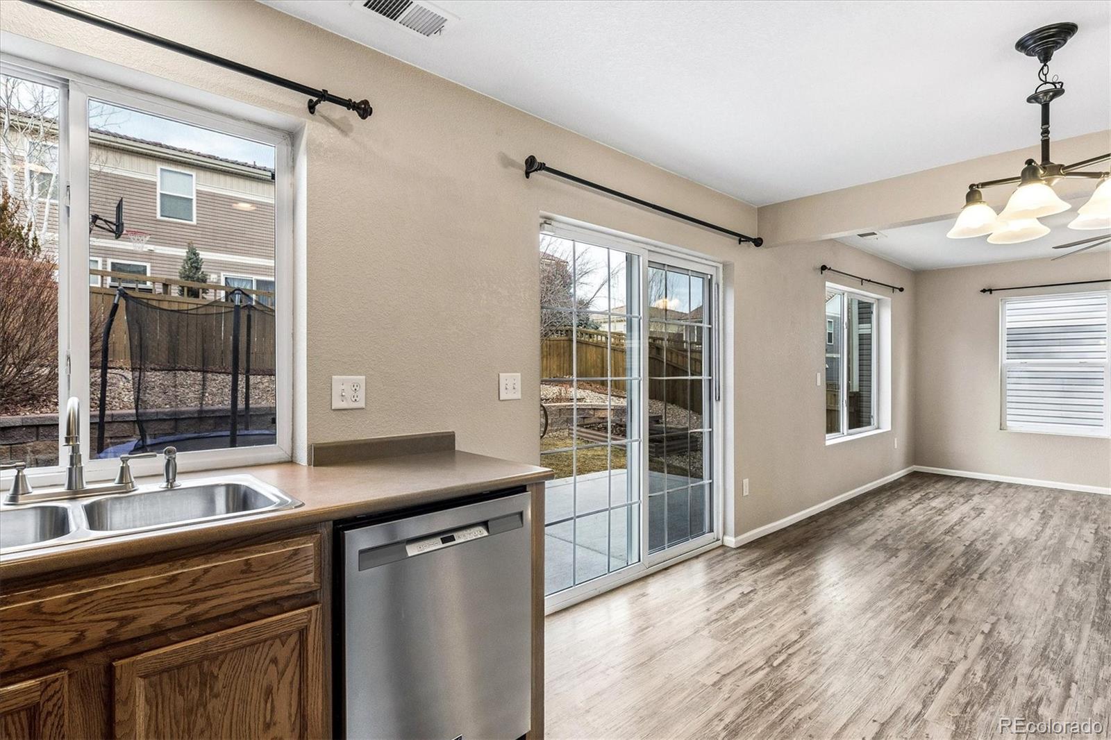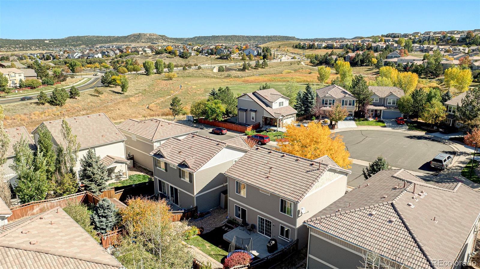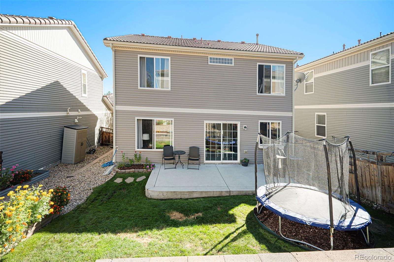 Perfect move-in ready low maintenance Meadows home--vinyl siding, concrete tile roof, central vacuum, central air, updated flooring throughout, new paint & close to parks and pools! Open foyer welcomes you to spacious great room, the heart of the home, bright and filled with light, seamlessly connected to dining and kitchen. Newer stainless steel appliances in kitchen with pantry opens directly to private backyard with expanded large patio for hospitality & outdoor enjoyment, landscaped with garden beds, trees, trampoline (included), and automatic sprinkler system. Kitchen/dining provides direct access to attached 2-car garage with storage. Upstairs includes the large primary suite with walk-in closet and adjoining full bathroom. Along with the laundry conveniently located upstairs is another full bath and two additional bedrooms, one with a walk-in closet, as well as an expansive loft area for a variety of uses: crafts, play area, office & more. Located steps away from large Meadows play field and within walking distance to one of two Meadows pools. Wonderful walkable neighborhood with nearby Grange pool, club house, parks, trails, dog parks, biking, baseball fields & more. Ultimate in convenience: just minutes from hospital, Castle Rock's best retail and restaurants, and I-25 corridor!