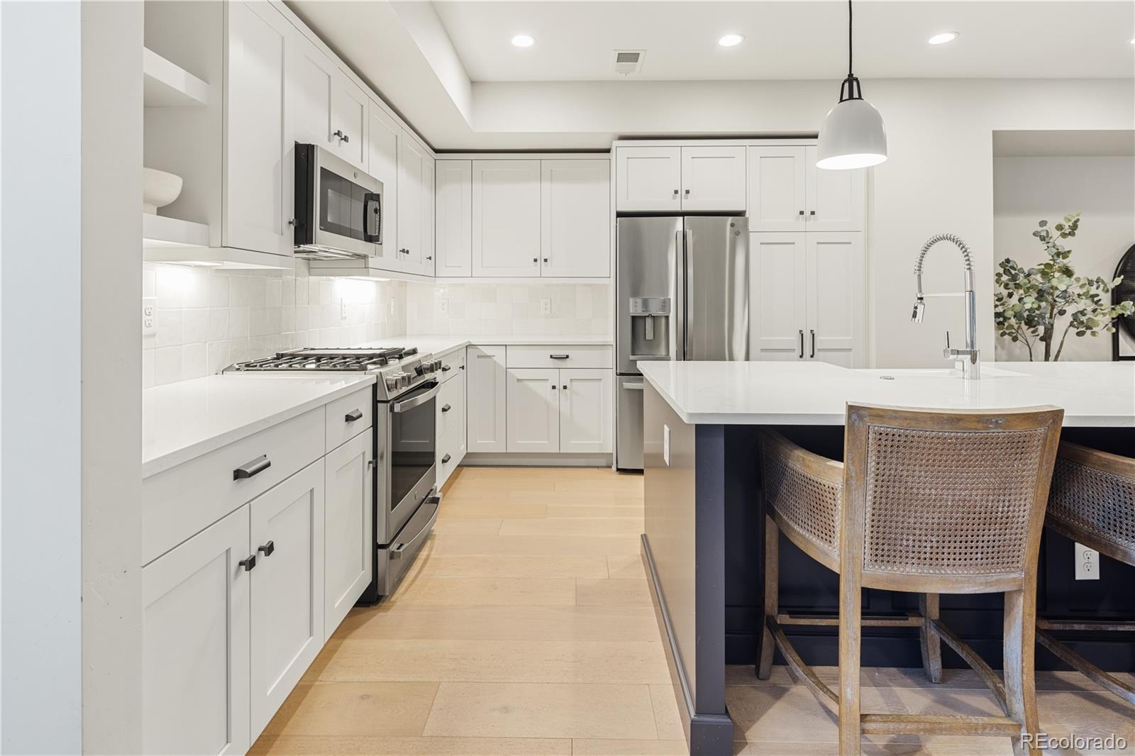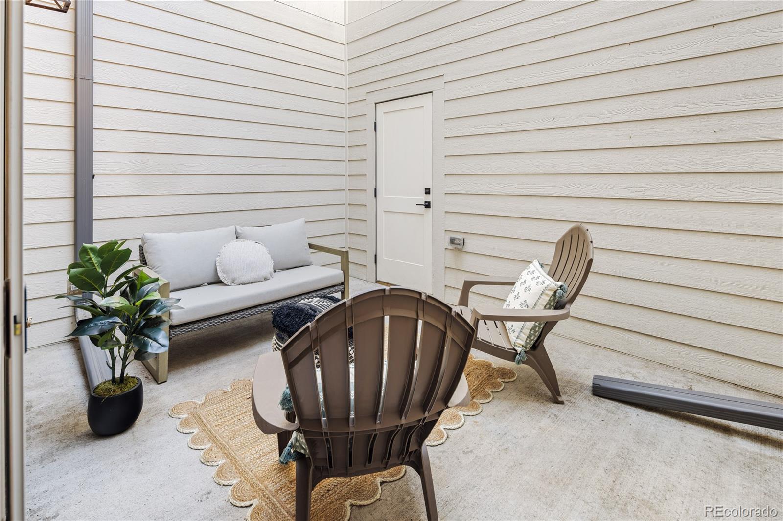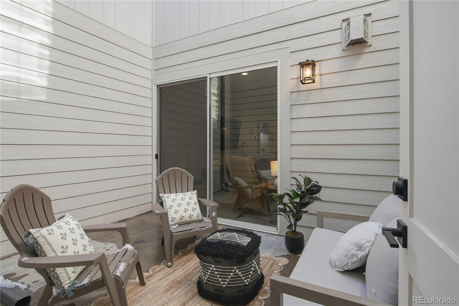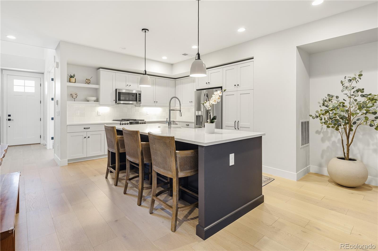 This stunning 4-bedroom, 4-bath townhome, built in 2022, offers the perfect blend of modern comfort, thoughtful layout, and an unbeatable Arvada location. Just a 3-minute drive & 16-minute walk to Olde Town Arvada, you’ll enjoy easy access to one of the area’s most vibrant districts, home to over 31 bars and restaurants, charming boutiques, coffee houses, and year-round community events. From the moment you arrive, the modern European-inspired architecture and quality exterior construction set the tone. Inside, the home is filled with natural light from west-facing windows, while dramatic vaulted ceilings in the entryway lead to a thoughtfully designed custom under-stairs bench featuring coat hooks, seating, and built-in storage cubbies—perfect for keeping everyday essentials. The open-concept kitchen is a showpiece with custom multi-tone cabinetry by Caruso Kitchens, soft-close cabinets, a large island with quartz countertops, farmhouse apron sink, GE Profile appliances, including a gas range with multi-ring burner, and French door refrigerator with water dispenser. One of the standout features is the private indoor/outdoor courtyard, creating an inviting space for morning coffee, evening gatherings, or quiet relaxation. Other key home features include refined hand-trowel wall texture throughout, engineered hardwood flooring in the main living spaces. The primary suite feels luxurious and private, featuring custom closets, barn door entry, dual vanity, and a spa-inspired bath with a luxury shower & frameless European glass. Each bedroom offers ample space and comfort, providing flexibility for guests, a home office, or additional living space. Above the 2-car heated garage, a private guest suite with its own ensuite bathroom is ideal for visitors, extended family, or a secluded home office. Perfectly located just minutes from Lady Nomada, Bonfire Burritos, Stone Cellar Bistro, Costco, In-N-Out Burger, and all the retail and dining options at Arvada Shopping Center.