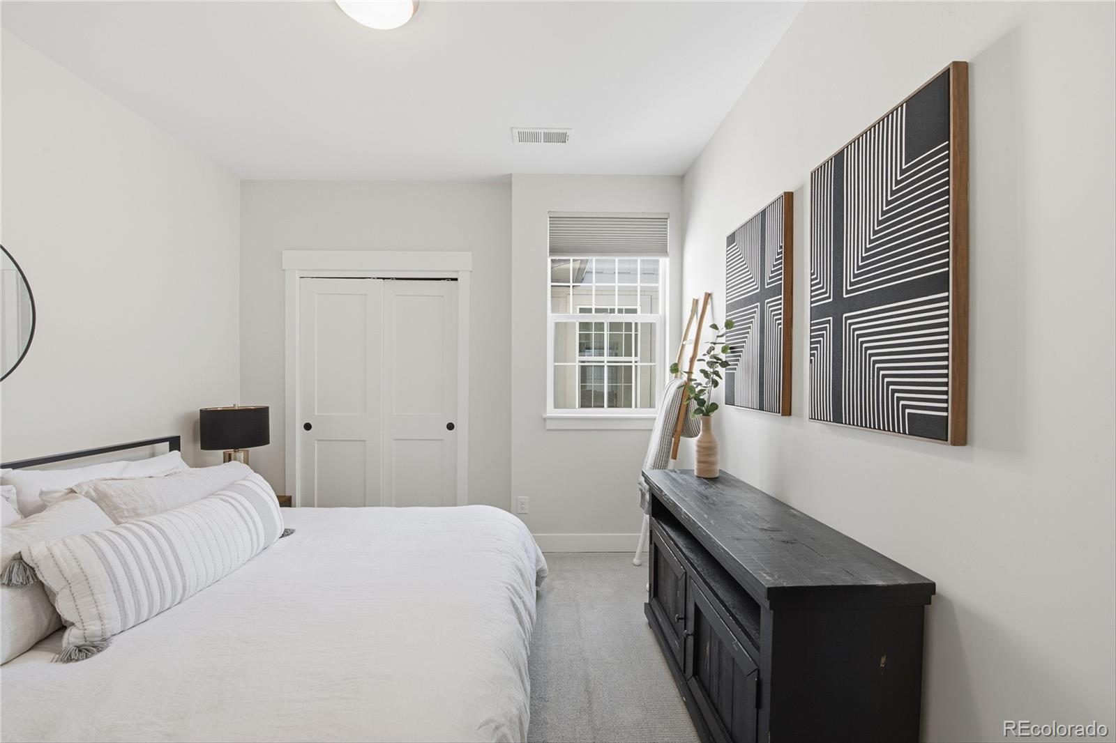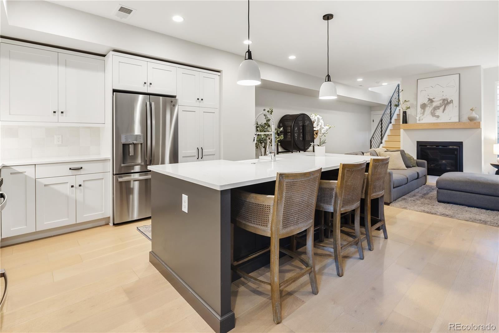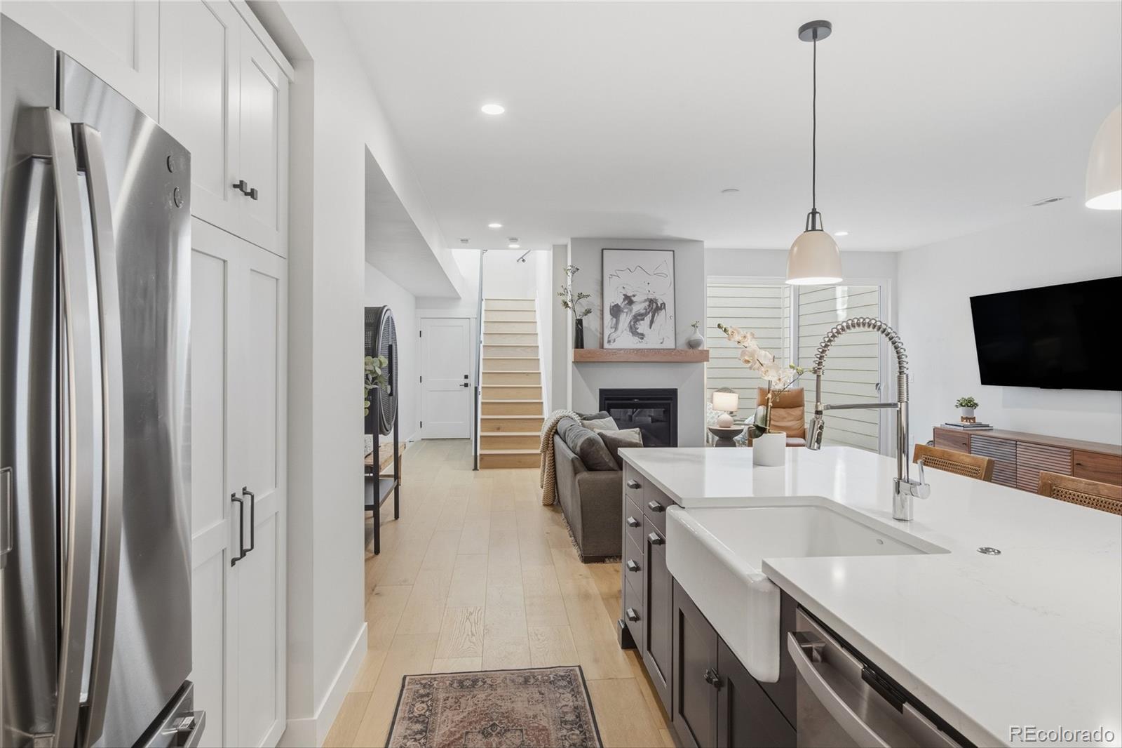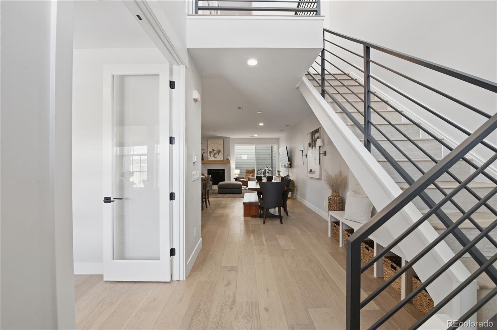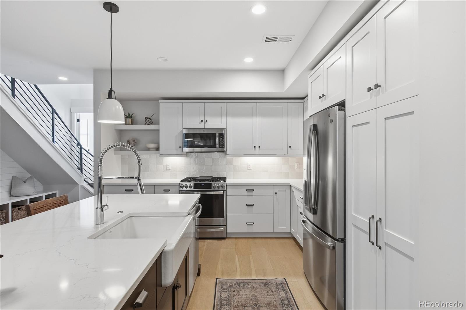 This stunning 4-bedroom, 4-bath townhome, built in 2022, offers the perfect blend of modern comfort, thoughtful layout, and an unbeatable Arvada location. Just a 3-minute drive & 16-minute walk to Olde Town Arvada, you’ll enjoy easy access to one of the area’s most vibrant districts, home to over 31 bars and restaurants, charming boutiques, coffee houses, and year-round community events. From the moment you arrive, the modern European-inspired architecture and quality exterior construction set the tone. Inside, the home is filled with natural light from west-facing windows, while dramatic vaulted ceilings in the entryway lead to a thoughtfully designed custom under-stairs bench featuring coat hooks, seating, and built-in storage cubbies—perfect for keeping everyday essentials. The open-concept kitchen is a showpiece with custom multi-tone cabinetry by Caruso Kitchens, soft-close cabinets, a large island with quartz countertops, farmhouse apron sink, GE Profile appliances, including a gas range with multi-ring burner, and French door refrigerator with water dispenser. One of the standout features is the private indoor/outdoor courtyard, creating an inviting space for morning coffee, evening gatherings, or quiet relaxation. Other key home features include refined hand-trowel wall texture throughout, engineered hardwood flooring in the main living spaces. The primary suite feels luxurious and private, featuring custom closets, barn door entry, dual vanity, and a spa-inspired bath with a luxury shower & frameless European glass. Each bedroom offers ample space and comfort, providing flexibility for guests, a home office, or additional living space. Above the 2-car heated garage, a private guest suite with its own ensuite bathroom is ideal for visitors, extended family, or a secluded home office. Perfectly located just minutes from Lady Nomada, Bonfire Burritos, Stone Cellar Bistro, Costco, In-N-Out Burger, and all the retail and dining options at Arvada Shopping Center.