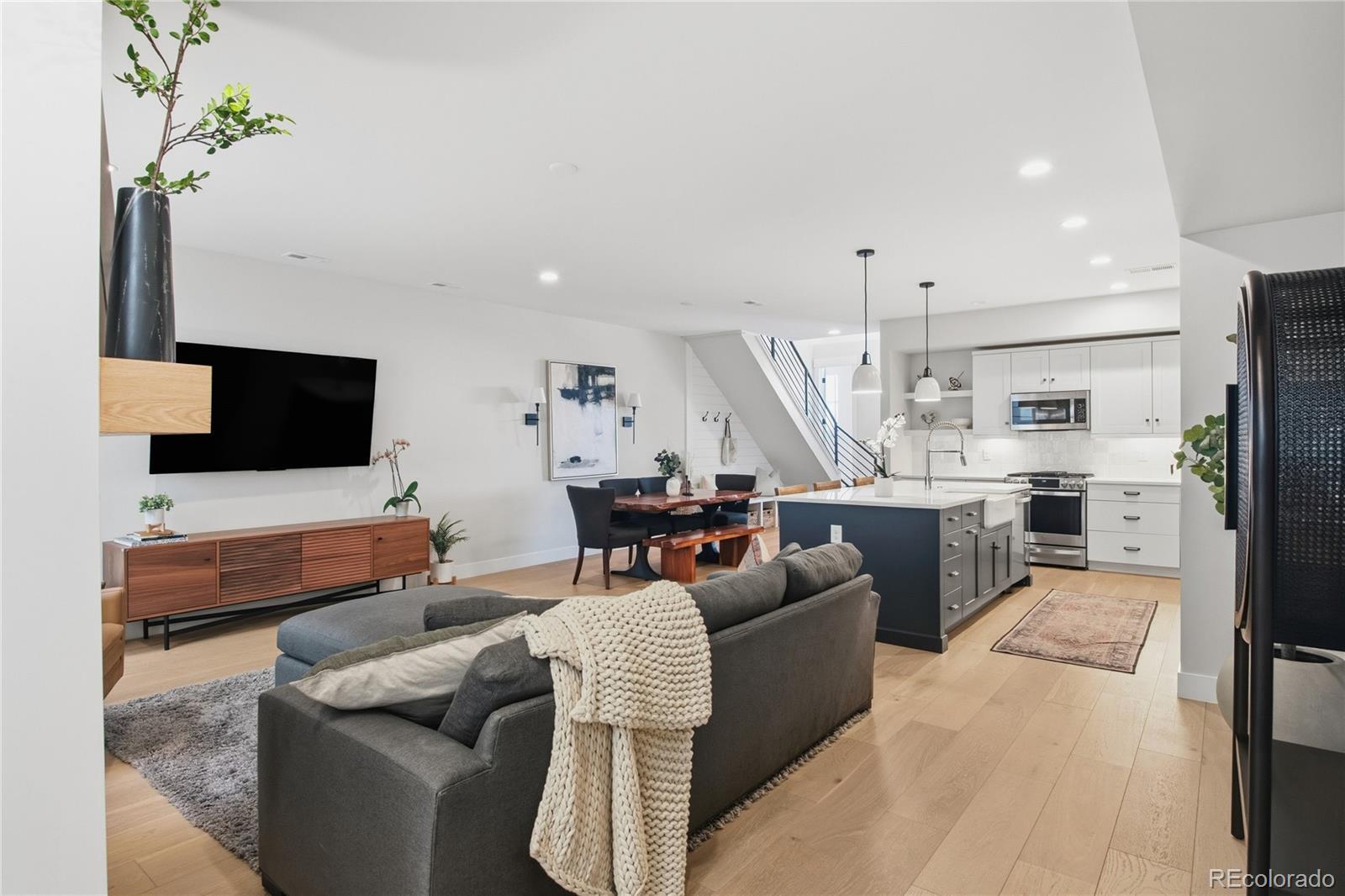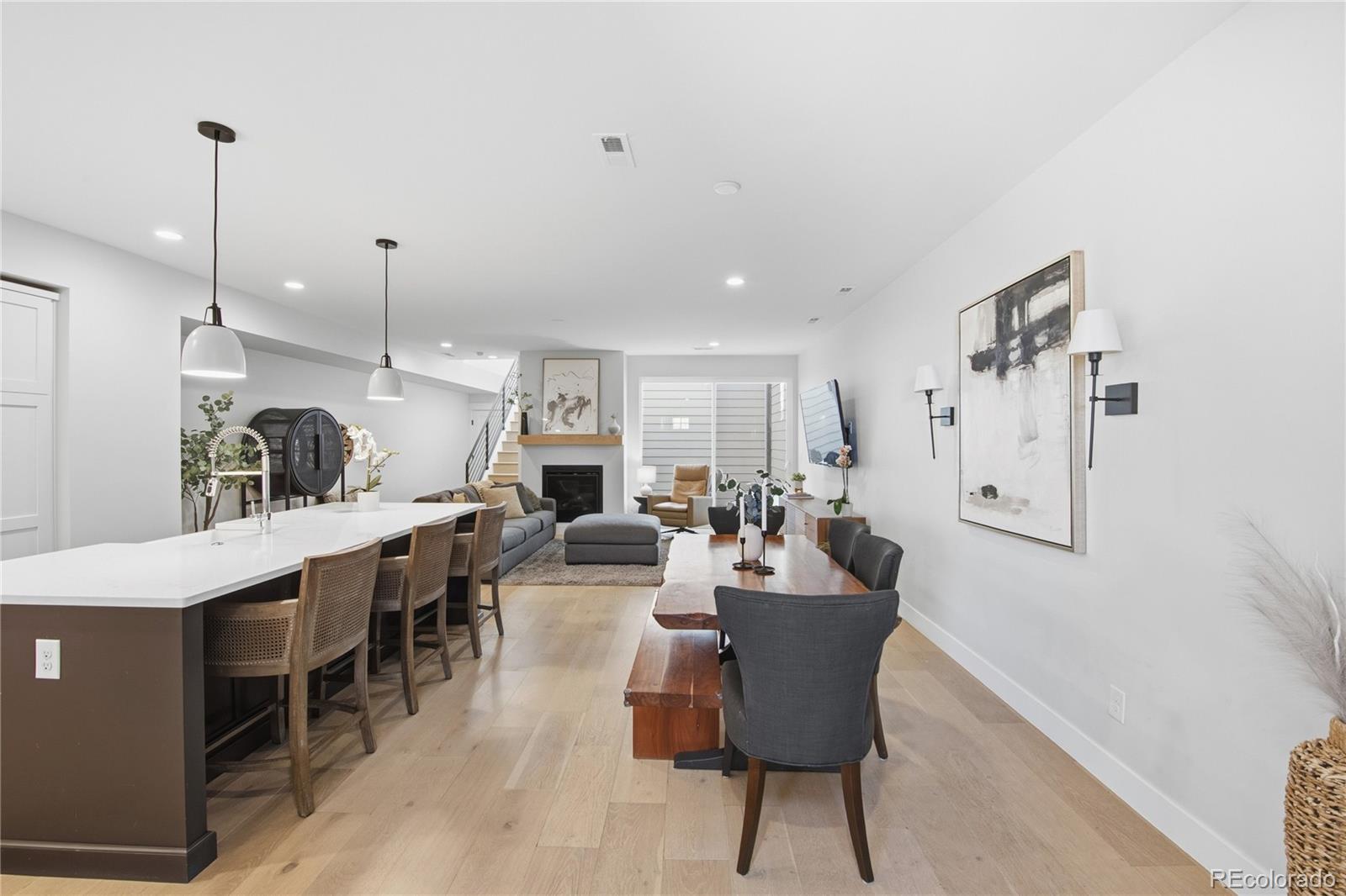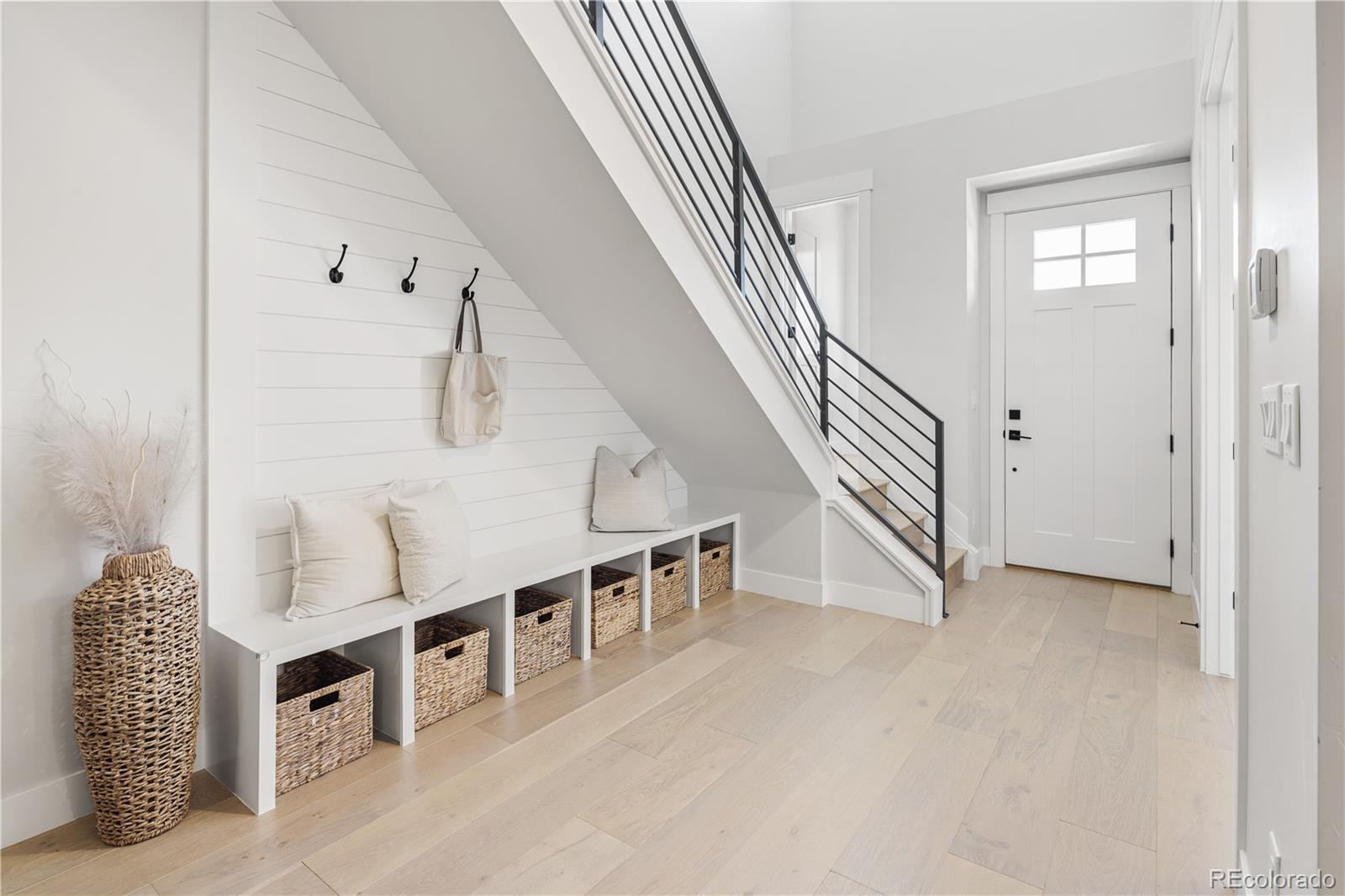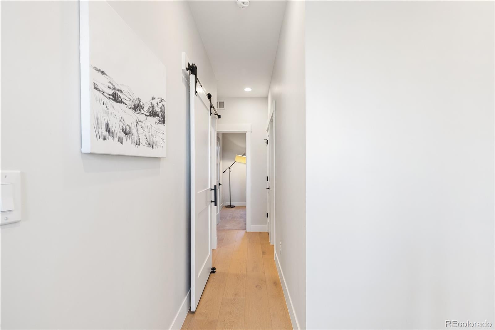 This stunning 4-bedroom, 4-bath townhome, built in 2022, offers the perfect blend of modern comfort, thoughtful layout, and an unbeatable Arvada location. Just a 3-minute drive & 16-minute walk to Olde Town Arvada, you’ll enjoy easy access to one of the area’s most vibrant districts, home to over 31 bars and restaurants, charming boutiques, coffee houses, and year-round community events. From the moment you arrive, the modern European-inspired architecture and quality exterior construction set the tone. Inside, the home is filled with natural light from west-facing windows, while dramatic vaulted ceilings in the entryway lead to a thoughtfully designed custom under-stairs bench featuring coat hooks, seating, and built-in storage cubbies—perfect for keeping everyday essentials. The open-concept kitchen is a showpiece with custom multi-tone cabinetry by Caruso Kitchens, soft-close cabinets, a large island with quartz countertops, farmhouse apron sink, GE Profile appliances, including a gas range with multi-ring burner, and French door refrigerator with water dispenser. One of the standout features is the private indoor/outdoor courtyard, creating an inviting space for morning coffee, evening gatherings, or quiet relaxation. Other key home features include refined hand-trowel wall texture throughout, engineered hardwood flooring in the main living spaces. The primary suite feels luxurious and private, featuring custom closets, barn door entry, dual vanity, and a spa-inspired bath with a luxury shower & frameless European glass. Each bedroom offers ample space and comfort, providing flexibility for guests, a home office, or additional living space. Above the 2-car heated garage, a private guest suite with its own ensuite bathroom is ideal for visitors, extended family, or a secluded home office. Perfectly located just minutes from Lady Nomada, Bonfire Burritos, Stone Cellar Bistro, Costco, In-N-Out Burger, and all the retail and dining options at Arvada Shopping Center.