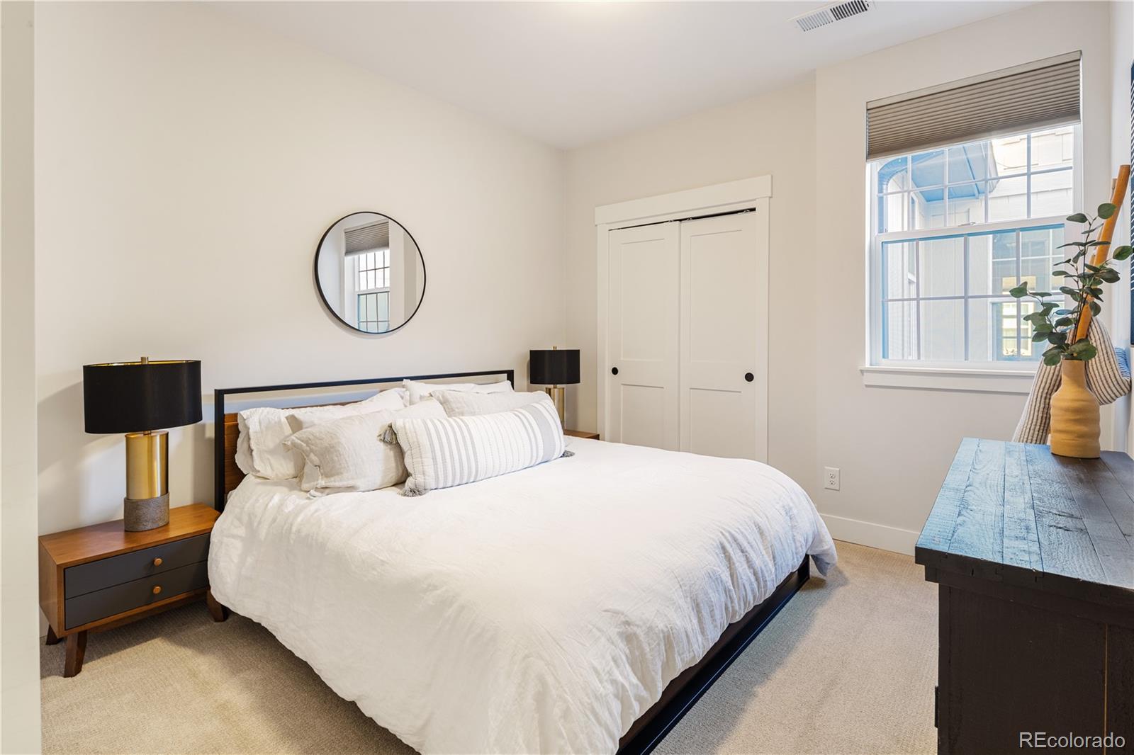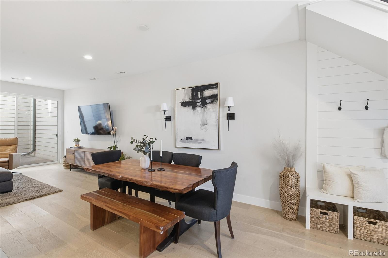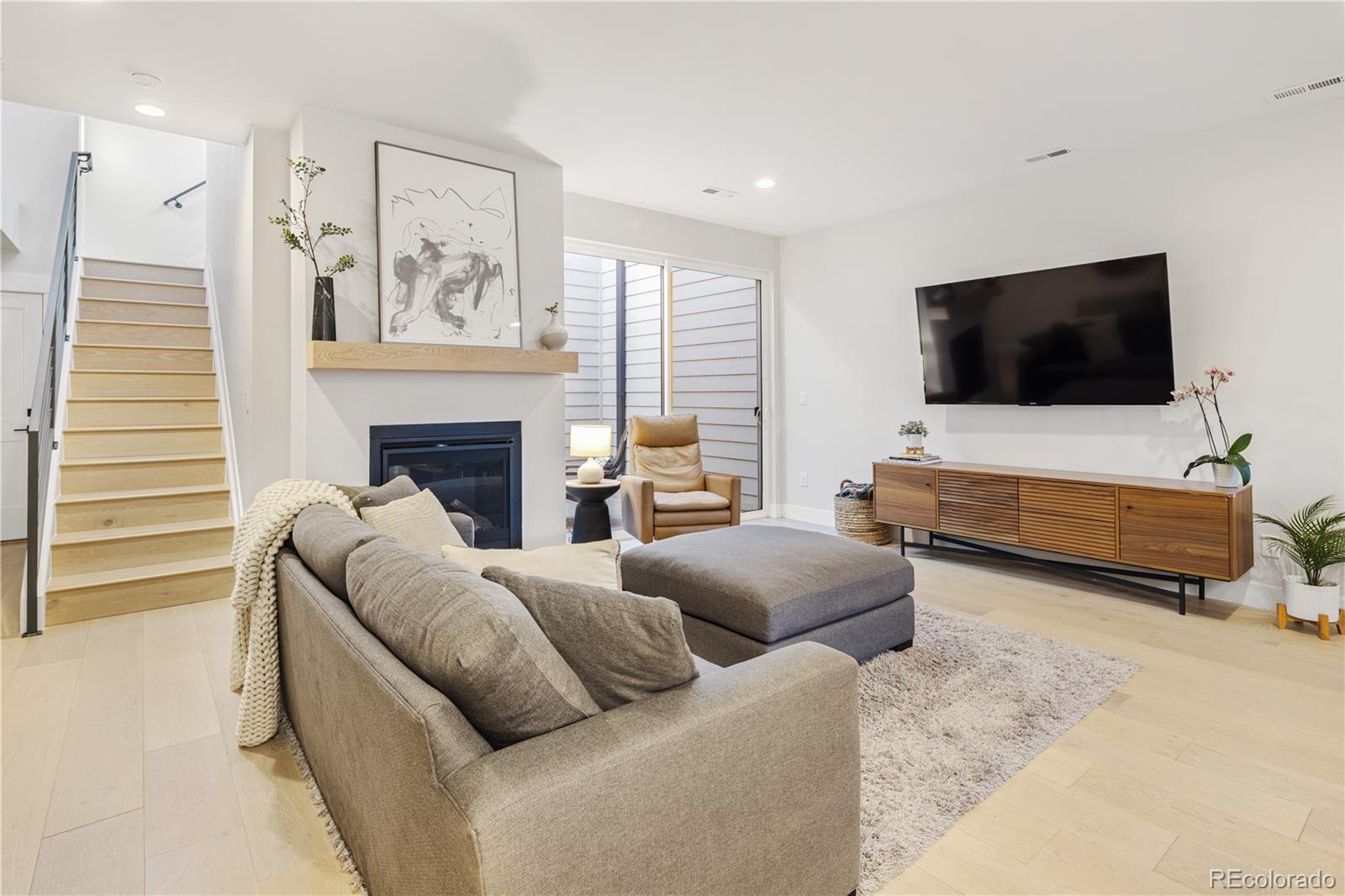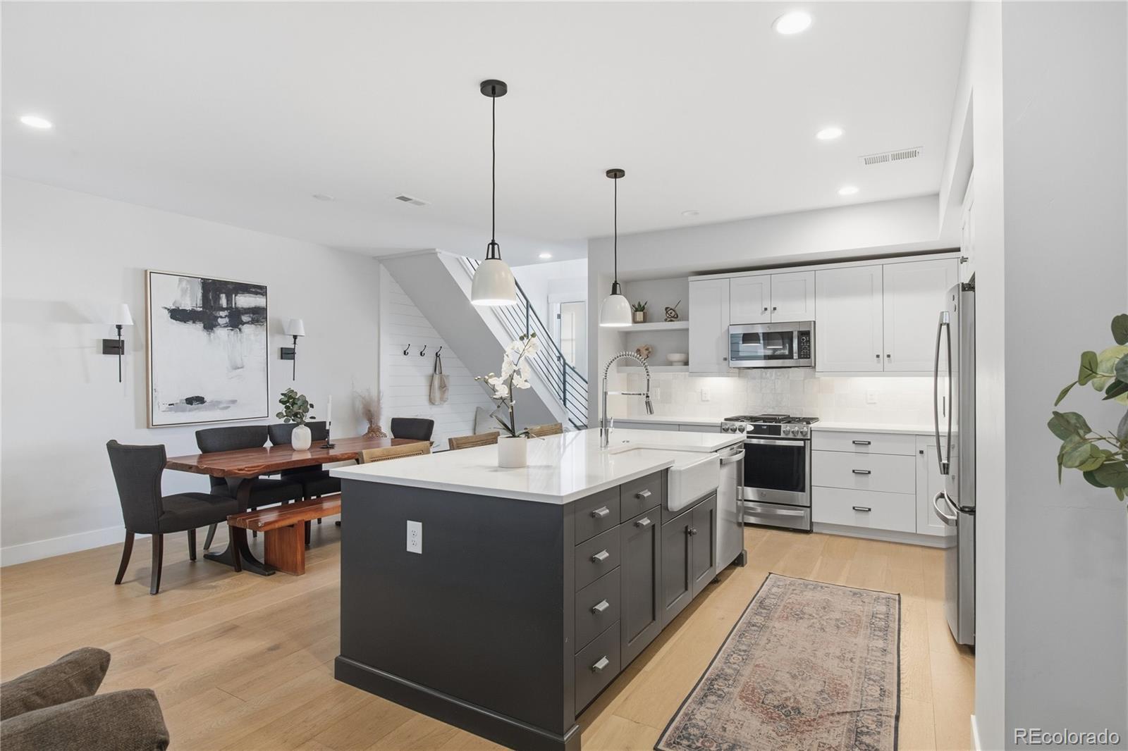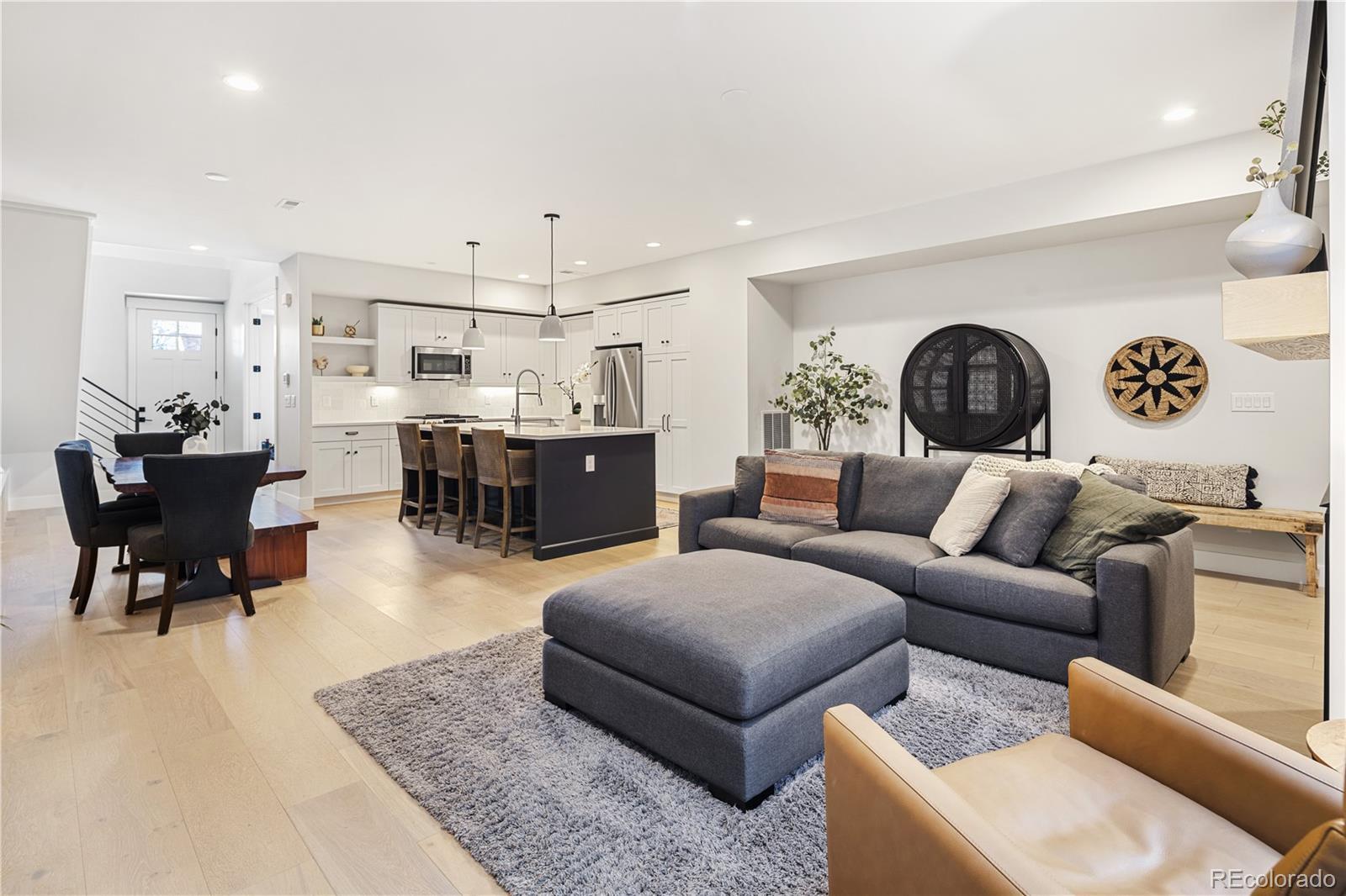 This stunning 4-bedroom, 4-bath townhome, built in 2022, offers the perfect blend of modern comfort, thoughtful layout, and an unbeatable Arvada location. Just a 3-minute drive & 16-minute walk to Olde Town Arvada, you’ll enjoy easy access to one of the area’s most vibrant districts, home to over 31 bars and restaurants, charming boutiques, coffee houses, and year-round community events. From the moment you arrive, the modern European-inspired architecture and quality exterior construction set the tone. Inside, the home is filled with natural light from west-facing windows, while dramatic vaulted ceilings in the entryway lead to a thoughtfully designed custom under-stairs bench featuring coat hooks, seating, and built-in storage cubbies—perfect for keeping everyday essentials. The open-concept kitchen is a showpiece with custom multi-tone cabinetry by Caruso Kitchens, soft-close cabinets, a large island with quartz countertops, farmhouse apron sink, GE Profile appliances, including a gas range with multi-ring burner, and French door refrigerator with water dispenser. One of the standout features is the private indoor/outdoor courtyard, creating an inviting space for morning coffee, evening gatherings, or quiet relaxation. Other key home features include refined hand-trowel wall texture throughout, engineered hardwood flooring in the main living spaces. The primary suite feels luxurious and private, featuring custom closets, barn door entry, dual vanity, and a spa-inspired bath with a luxury shower & frameless European glass. Each bedroom offers ample space and comfort, providing flexibility for guests, a home office, or additional living space. Above the 2-car heated garage, a private guest suite with its own ensuite bathroom is ideal for visitors, extended family, or a secluded home office. Perfectly located just minutes from Lady Nomada, Bonfire Burritos, Stone Cellar Bistro, Costco, In-N-Out Burger, and all the retail and dining options at Arvada Shopping Center.