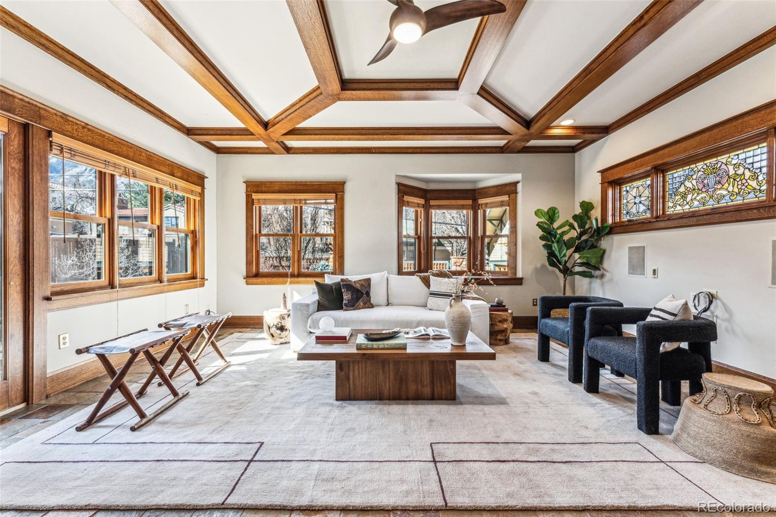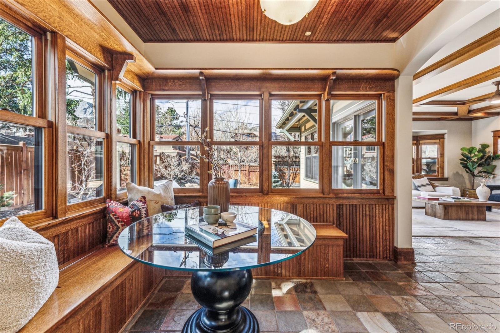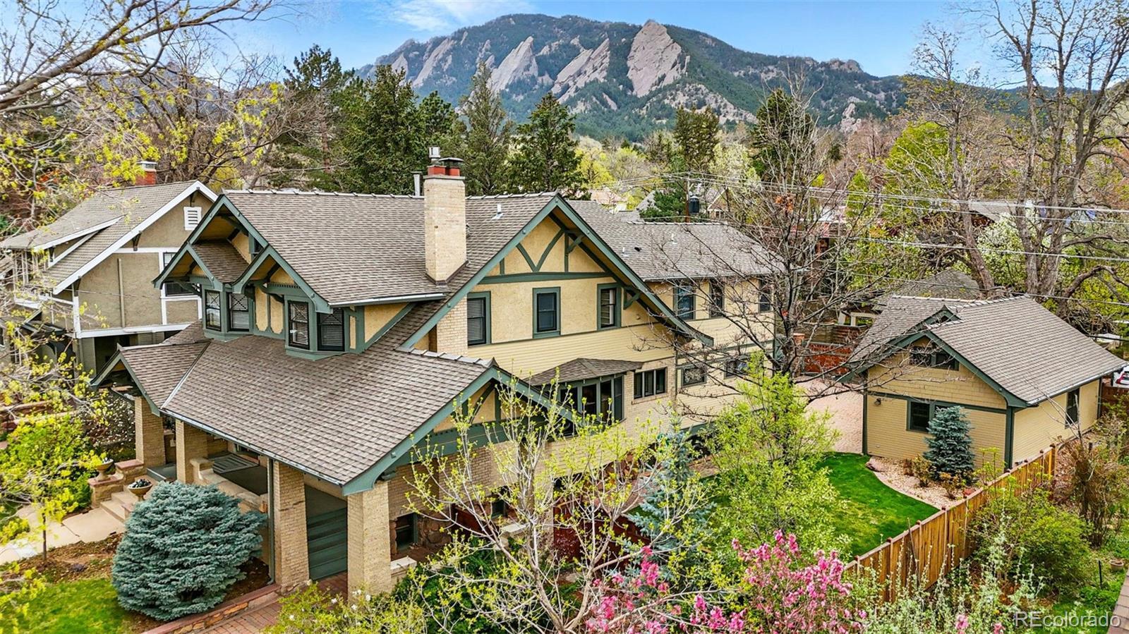 Set on a spacious triple lot with stunning Flatiron views, this 5,053 SF home perfectly blends historic architecture with sophisticated modern upgrades-offering the best of both worlds in one of Boulder's most walkable, scenic locations.Inside, original details like beamed ceilings, bay windows, hardwood floors, and a wood-burning fireplace pair effortlessly with updated kitchens and bathrooms for contemporary comfort. The heart of the home is the spacious living room, which opens directly to a west-facing backyard oasis-ideal for entertaining-with a built-in gas grill, outdoor bar, fire pit, and stone patio.The chef's kitchen features a breakfast nook, a butler's pantry, and seamless flow to the main living areas. Upstairs, find four light-filled bedrooms, including a private primary suite with in-room laundry. The finished attic offers flexible space with a cedar closet, built-ins, and a partially finished craft area. On the lower level, a separate guest retreat includes a bedroom, full bath, kitchenette, and gas fireplace-plus a speakeasy-style media room with exposed stone and a private entrance. Step outside to enjoy a beautifully landscaped backyard with mature trees, a water feature, basketball court, and multiple entertaining zones. The gated courtyard leads to a detached three-car garage with potential for flex space above, plus a porte-cochere and additional off-street parking. The electric gate for garage access from back alley, off street parking in front. Convenient location just minutes from CU Boulder, Chautauqua Park, downtown restaurants, and future Sundance Film Festival venues. Easy access to US-36, Hwy 93, and Denver International Airport. Blueprints and surveys from the 2000 renovation available upon request. Additional seasonal photos and more interiors available in Media.