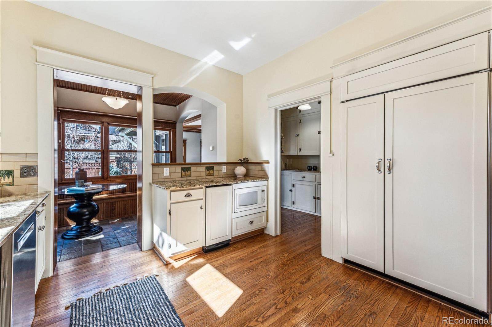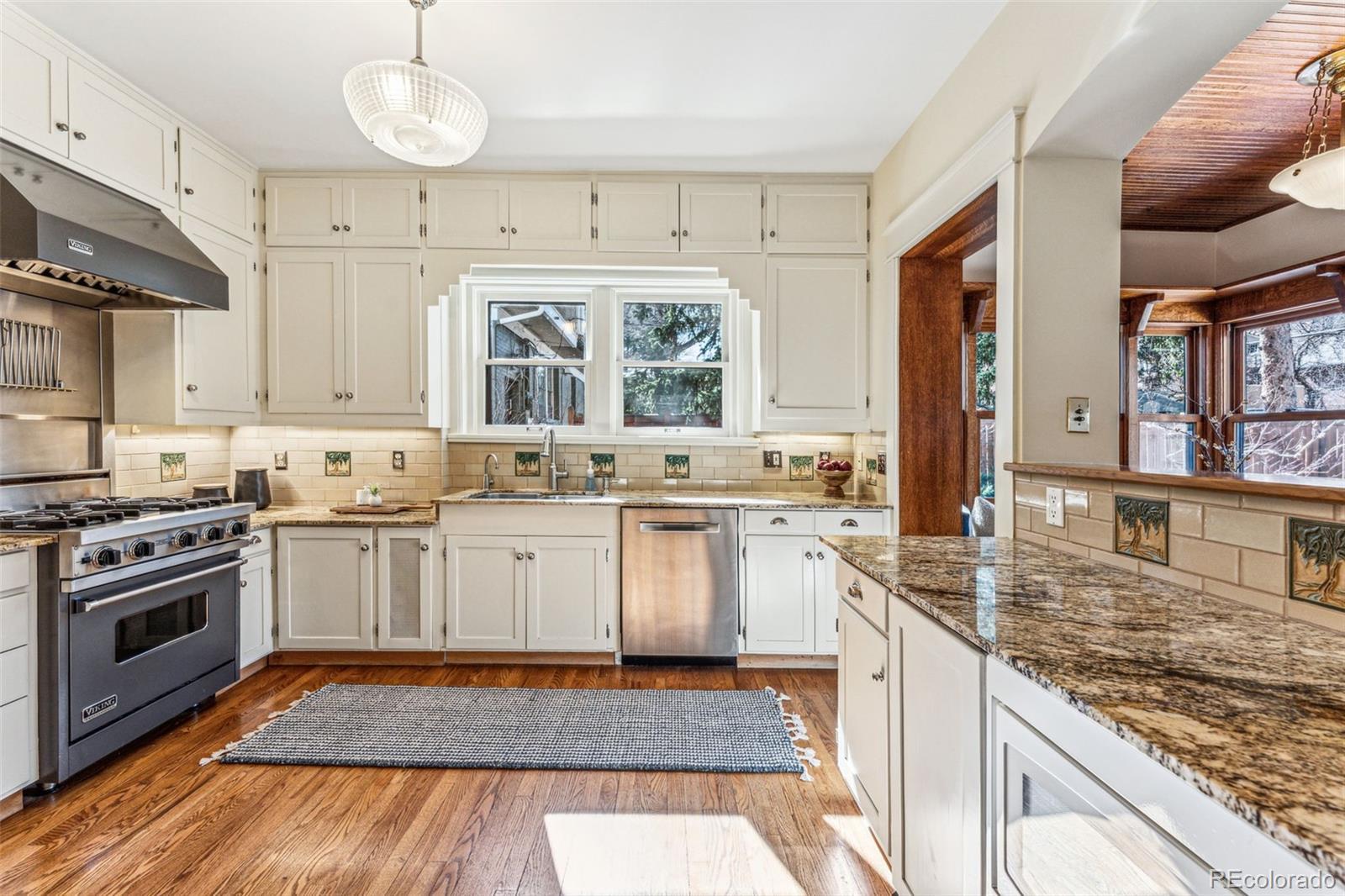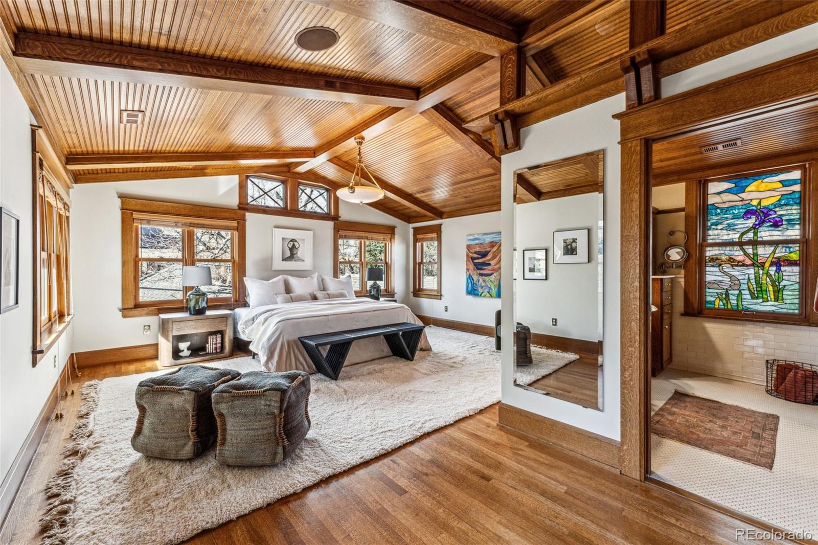 Set on a spacious triple lot with stunning Flatiron views, this 5,053 SF home perfectly blends historic architecture with sophisticated modern upgrades-offering the best of both worlds in one of Boulder's most walkable, scenic locations.Inside, original details like beamed ceilings, bay windows, hardwood floors, and a wood-burning fireplace pair effortlessly with updated kitchens and bathrooms for contemporary comfort. The heart of the home is the spacious living room, which opens directly to a west-facing backyard oasis-ideal for entertaining-with a built-in gas grill, outdoor bar, fire pit, and stone patio.The chef's kitchen features a breakfast nook, a butler's pantry, and seamless flow to the main living areas. Upstairs, find four light-filled bedrooms, including a private primary suite with in-room laundry. The finished attic offers flexible space with a cedar closet, built-ins, and a partially finished craft area. On the lower level, a separate guest retreat includes a bedroom, full bath, kitchenette, and gas fireplace-plus a speakeasy-style media room with exposed stone and a private entrance. Step outside to enjoy a beautifully landscaped backyard with mature trees, a water feature, basketball court, and multiple entertaining zones. The gated courtyard leads to a detached three-car garage with potential for flex space above, plus a porte-cochere and additional off-street parking. The electric gate for garage access from back alley, off street parking in front. Convenient location just minutes from CU Boulder, Chautauqua Park, downtown restaurants, and future Sundance Film Festival venues. Easy access to US-36, Hwy 93, and Denver International Airport. Blueprints and surveys from the 2000 renovation available upon request. Additional seasonal photos and more interiors available in Media.
