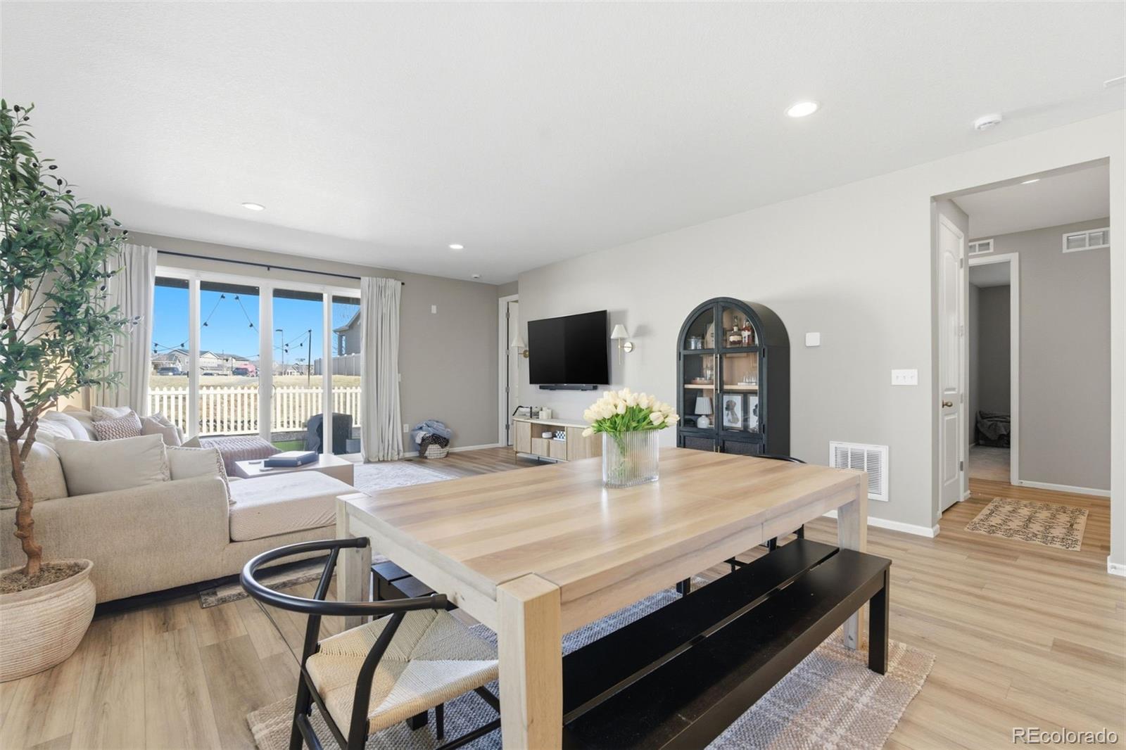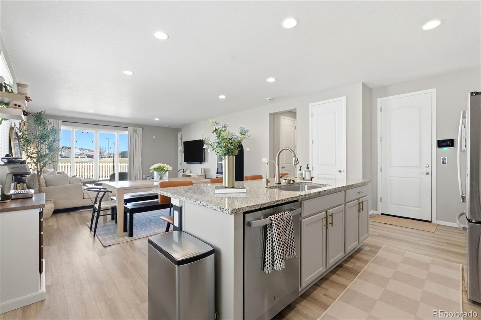 Welcome home to this beautifully designed ranch-style 2023 single-family residence in Henderson, where modern finishes meet a warm, inviting feel that instantly puts you at ease. With all living on the main level, this thoughtfully designed home offers 3 bedrooms, 2 bathrooms, and 1,742 finished square feet, providing effortless, single-level living that feels anything but builder-basic. The open-concept main living space is filled with natural light and flows seamlessly into a modern, entertainer-friendly kitchen featuring stainless steel appliances, a large island with breakfast seating, and elevated finishes that set it apart from typical new construction. A large sliding glass door connects the living area to the covered back patio, creating incredible indoor/outdoor living and making the space perfect for both everyday comfort and hosting. The main-floor primary suite offers a peaceful retreat with a spacious walk-in closet and an en-suite bath complete with a walk-in shower. Two additional bedrooms and a full bath provide flexibility for guests, a home office, or hobbies. Outside, enjoy a fully fenced, low-maintenance turf yard designed for easy living, along with a covered patio ideal for relaxing evenings or weekend gatherings. The attached 3-car garage is generously sized and includes ample room for storage, gear, and workspace. With a brand-new roof installed in January 2026 this home offers peace of mind and a truly low-stress lifestyle. An added bonus for the area: no metro district tax, helping keep ownership costs lower than many nearby communities. The HOA covers trash and recycling, simplifying day-to-day living. Conveniently located with easy highway access and nearby trails, this Henderson home is ideal for first-time buyers or empty nesters seeking comfort, functionality, and a welcoming place to call home.
