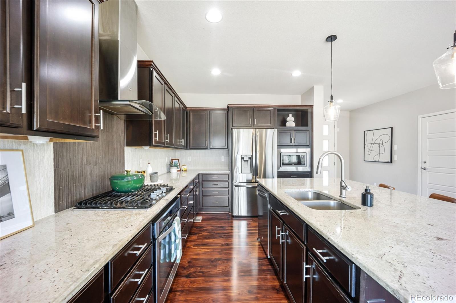 Beautiful 5-bedroom, 4-bath, 2-story home with a finished basement in the Stepping Stone community of Parker. Built in 2014 with approx. 3,500 finished sq. ft., it delivers the open floor plan and flexible spaces buyers want. On the main level, the open kitchen features stainless steel appliances, gas cooktop, large island, and ample cabinet and counter space for everyday cooking and entertaining. The kitchen flows into a dining area and family room with a gas fireplace. A main-level bedroom/flex space with adjacent 3/4 bath provides an option for guests, a dedicated home office, or multi-generational living. Upstairs, the primary suite is a retreat with a custom walk-in closet, large shower and dual sinks. You’ll also find three additional bedrooms, a hall bath with dual sinks, a versatile loft/flex space that works well as an office, playroom or homework area, and a laundry room near the bedrooms (washer/dryer included). The fully finished basement adds more space with a second rec room and a wet bar with dishwasher & microwave, perfect for movie nights, game days or hosting. The basement includes a built-in desk and powder bath. Outside, enjoy a fenced backyard with patio and gazebo, for grilling and play. An attached 2-car garage with 240-volt outlet for electric-vehicle charging, central air and forced-air heat round out the essentials. Solar panels provide a capped electric bill of approx. $110/month. Stepping Stone offers a clubhouse, pool, playgrounds, and hiking/biking trails, all within Douglas County RE-1 and near Prairie Crossing Elementary, Sierra Middle, and Chaparral High. You’re just minutes to I-25, E-470, Meridian and the Denver Tech Center, shopping, dining, and light rail—with a commutable drive to Buckley Space Force Base. Move-in ready, versatile, and set in one of Parker’s top communities—this is a home you have to see!