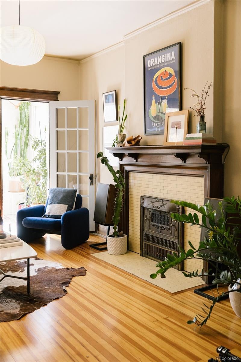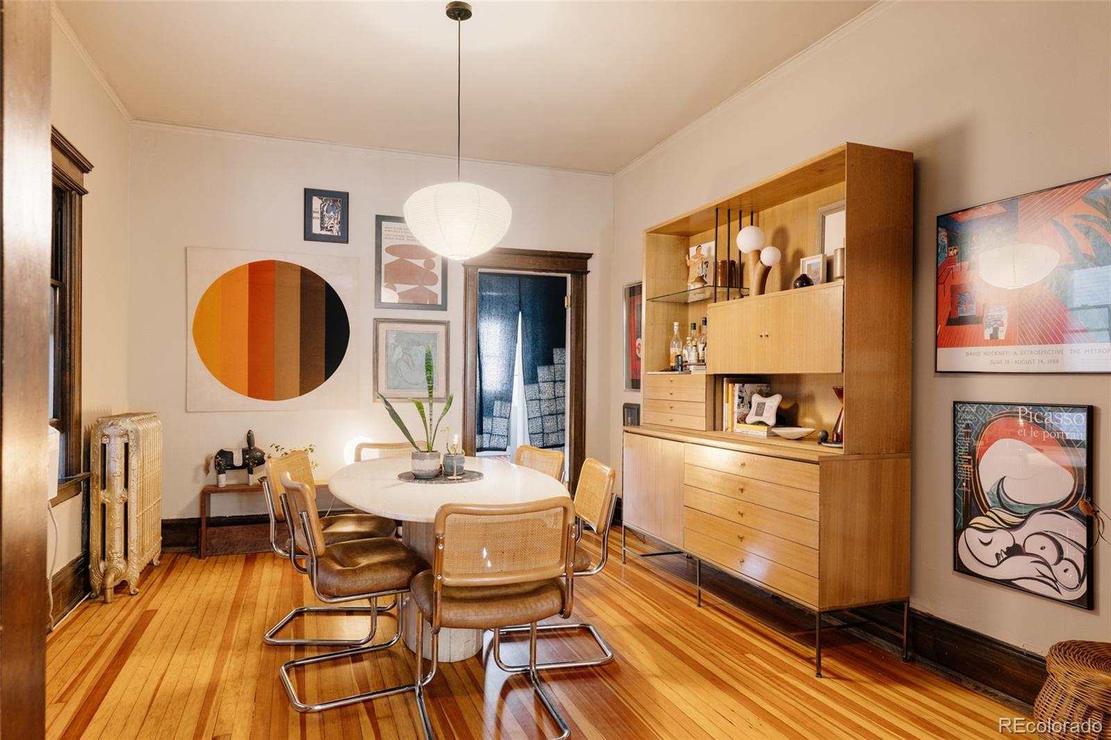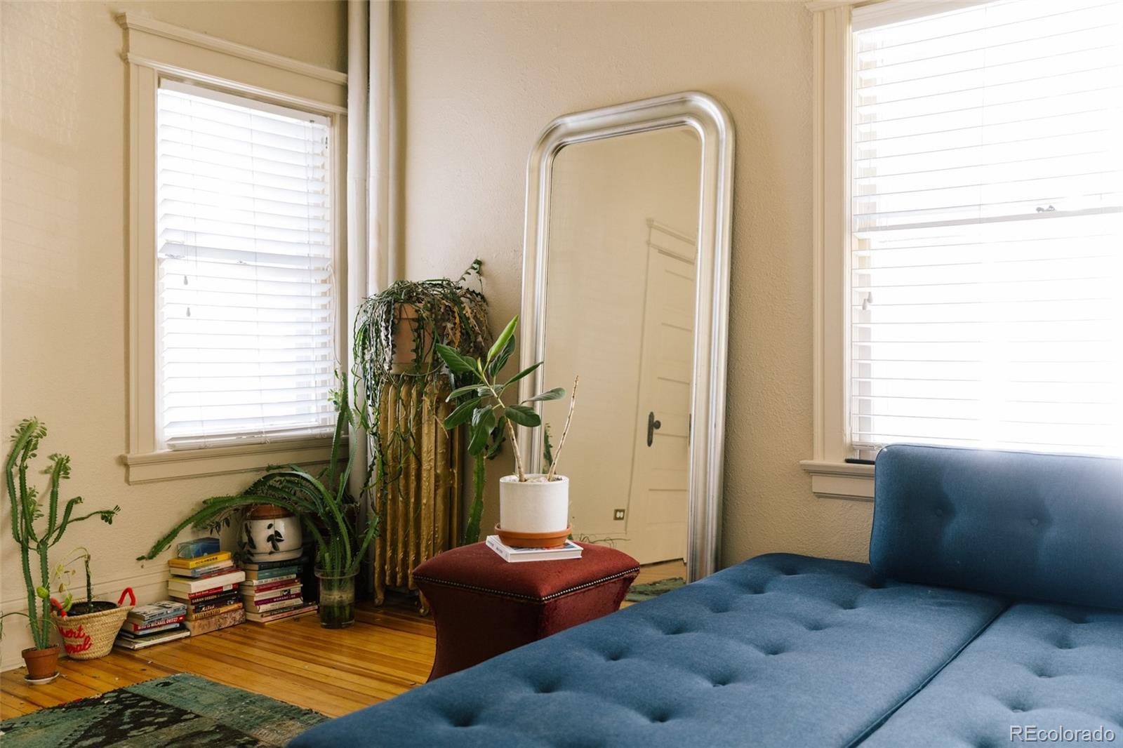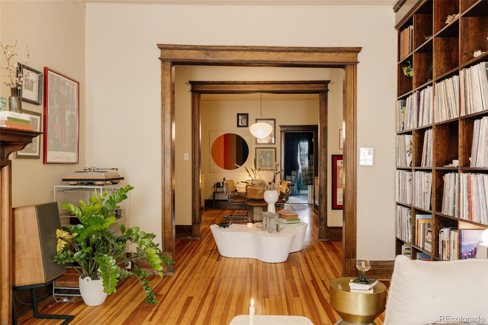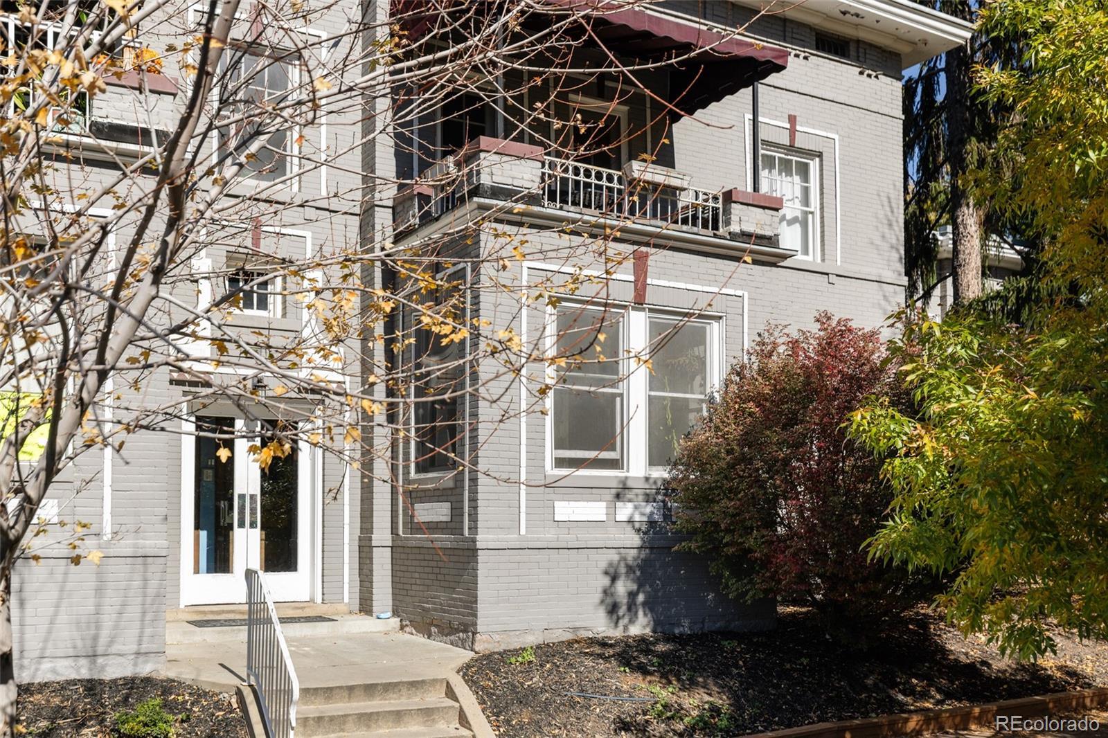 Soaring ceilings and timeless charm define this stunning home just around the corner from Cheesman Park. A seamless blend of early-century craftsmanship and sophisticated updates creates an old-world sanctuary with an unmistakably designer feel. Set within a stately brick building shaded by mature trees, the home welcomes you with a gracious foyer that immediately conveys a sense of scale and airiness. Original hardwood floors lead through expansive living and dining spaces designed for entertaining, showcasing period millwork, oversized windows, and a formal dining room ready to host large gatherings. The inviting living room flows into a delightful sunroom — an ideal spot for morning coffee, an artful reading nook, or a lush indoor garden retreat. The thoughtfully updated kitchen balances style and function with sleek cabinetry, stone countertops, and curated lighting, all while honoring the home’s original character. Two spacious bedrooms easily accommodate king-sized beds, while the vintage-inspired bath features a claw-foot tub and classic detailing. A flexible third room offers the perfect home office or creative studio, and both front and rear entries include practical mudroom-style storage. The building enhances everyday ease with a shared garden and additional storage areas, fostering a true sense of community. Located just a block and a half from Cheesman Park and moments from neighborhood cafés and beloved restaurants, this rare and romantic residence captures the best of Denver’s historic architecture and modern living.