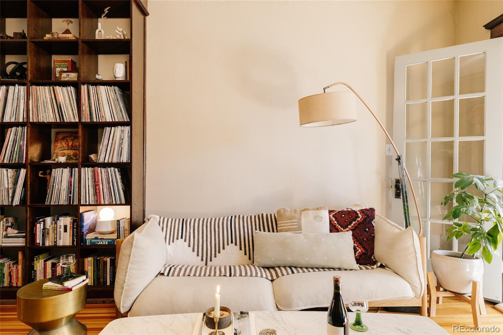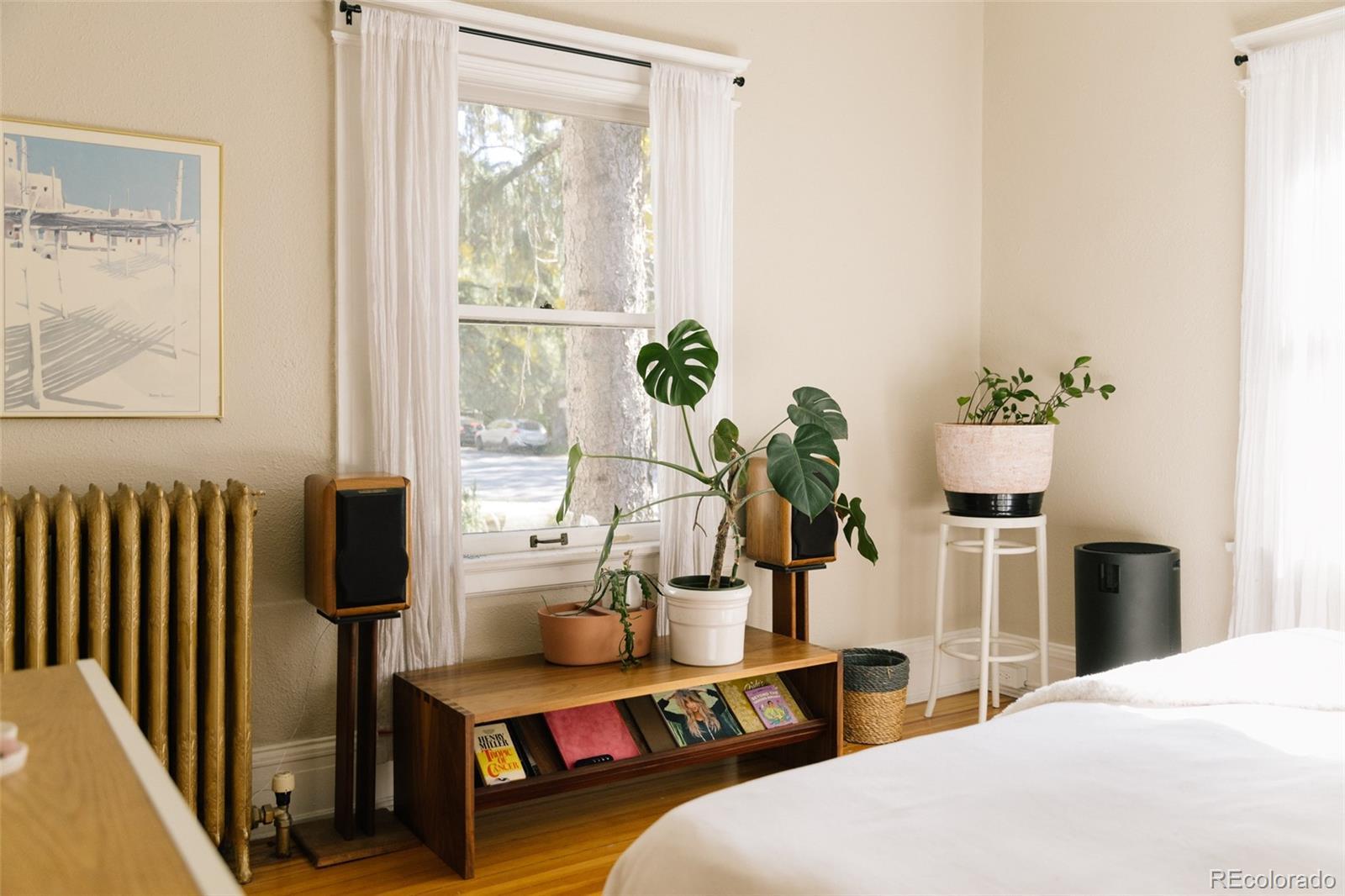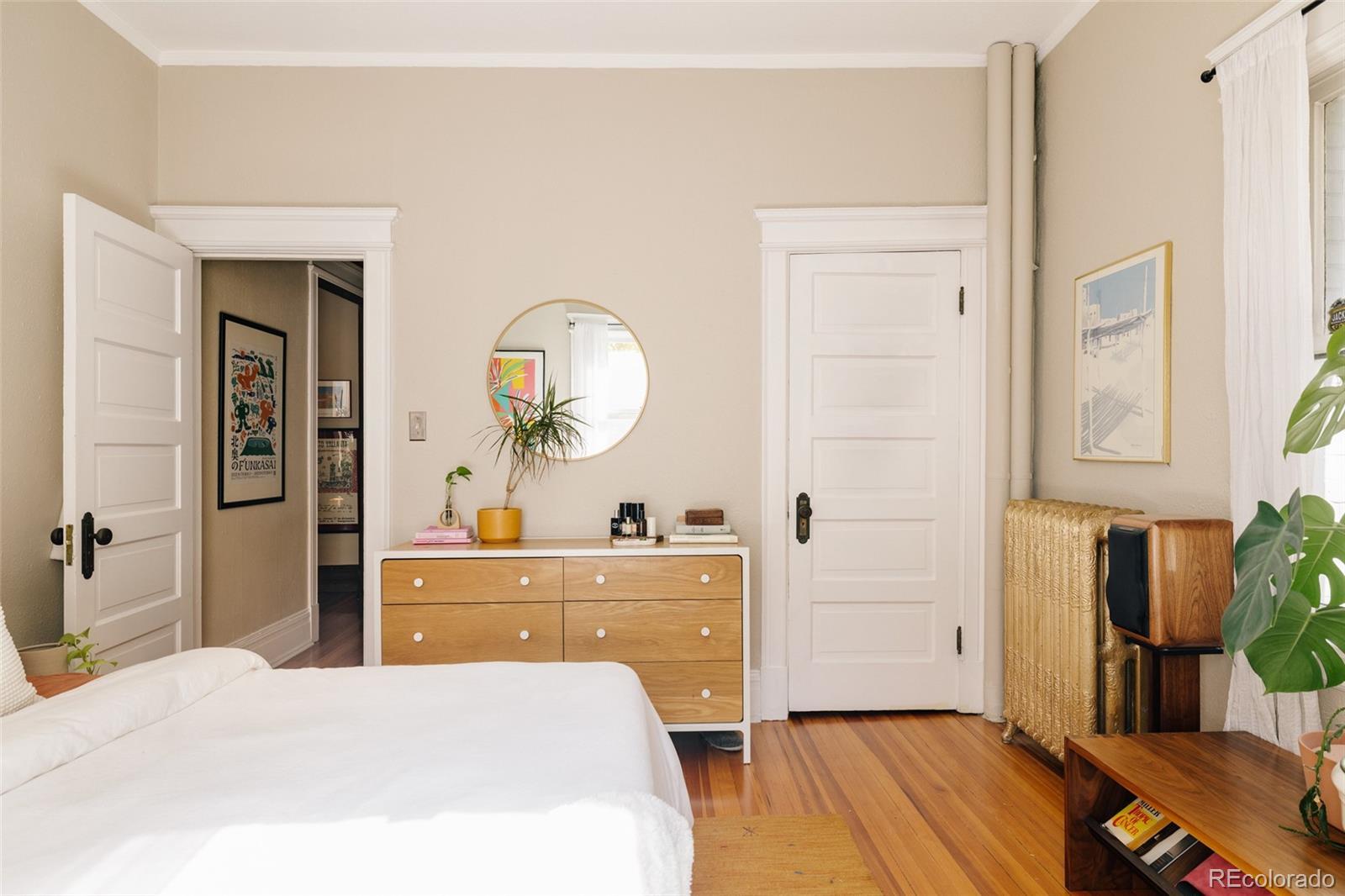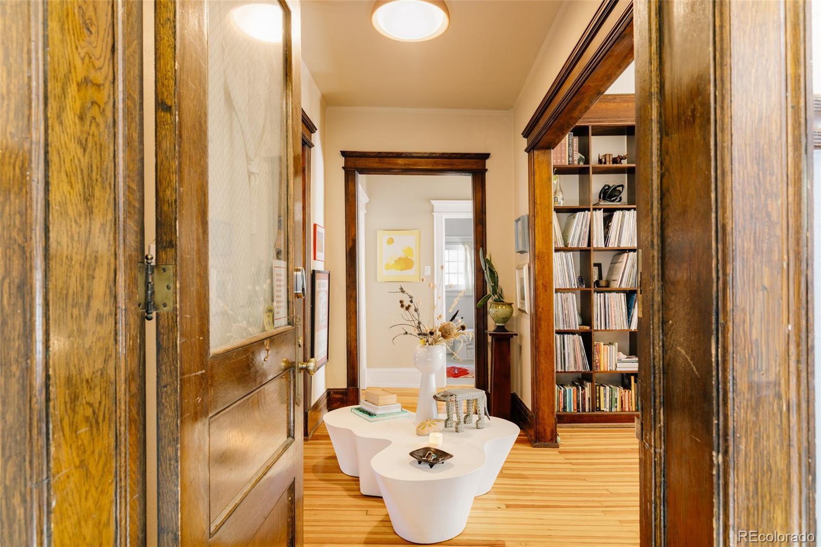 Soaring ceilings and timeless charm define this stunning home just around the corner from Cheesman Park. A seamless blend of early-century craftsmanship and sophisticated updates creates an old-world sanctuary with an unmistakably designer feel. Set within a stately brick building shaded by mature trees, the home welcomes you with a gracious foyer that immediately conveys a sense of scale and airiness. Original hardwood floors lead through expansive living and dining spaces designed for entertaining, showcasing period millwork, oversized windows, and a formal dining room ready to host large gatherings. The inviting living room flows into a delightful sunroom — an ideal spot for morning coffee, an artful reading nook, or a lush indoor garden retreat. The thoughtfully updated kitchen balances style and function with sleek cabinetry, stone countertops, and curated lighting, all while honoring the home’s original character. Two spacious bedrooms easily accommodate king-sized beds, while the vintage-inspired bath features a claw-foot tub and classic detailing. A flexible third room offers the perfect home office or creative studio, and both front and rear entries include practical mudroom-style storage. The building enhances everyday ease with a shared garden and additional storage areas, fostering a true sense of community. Located just a block and a half from Cheesman Park and moments from neighborhood cafés and beloved restaurants, this rare and romantic residence captures the best of Denver’s historic architecture and modern living.
