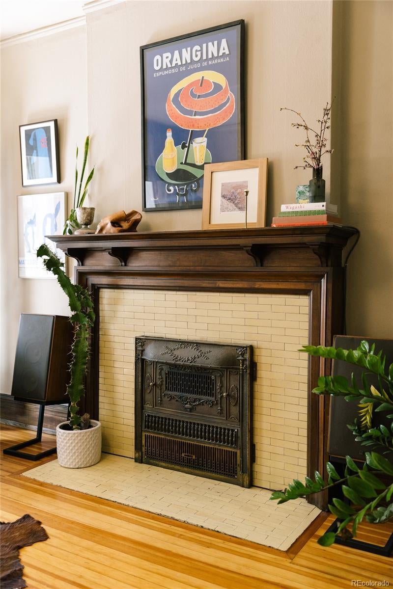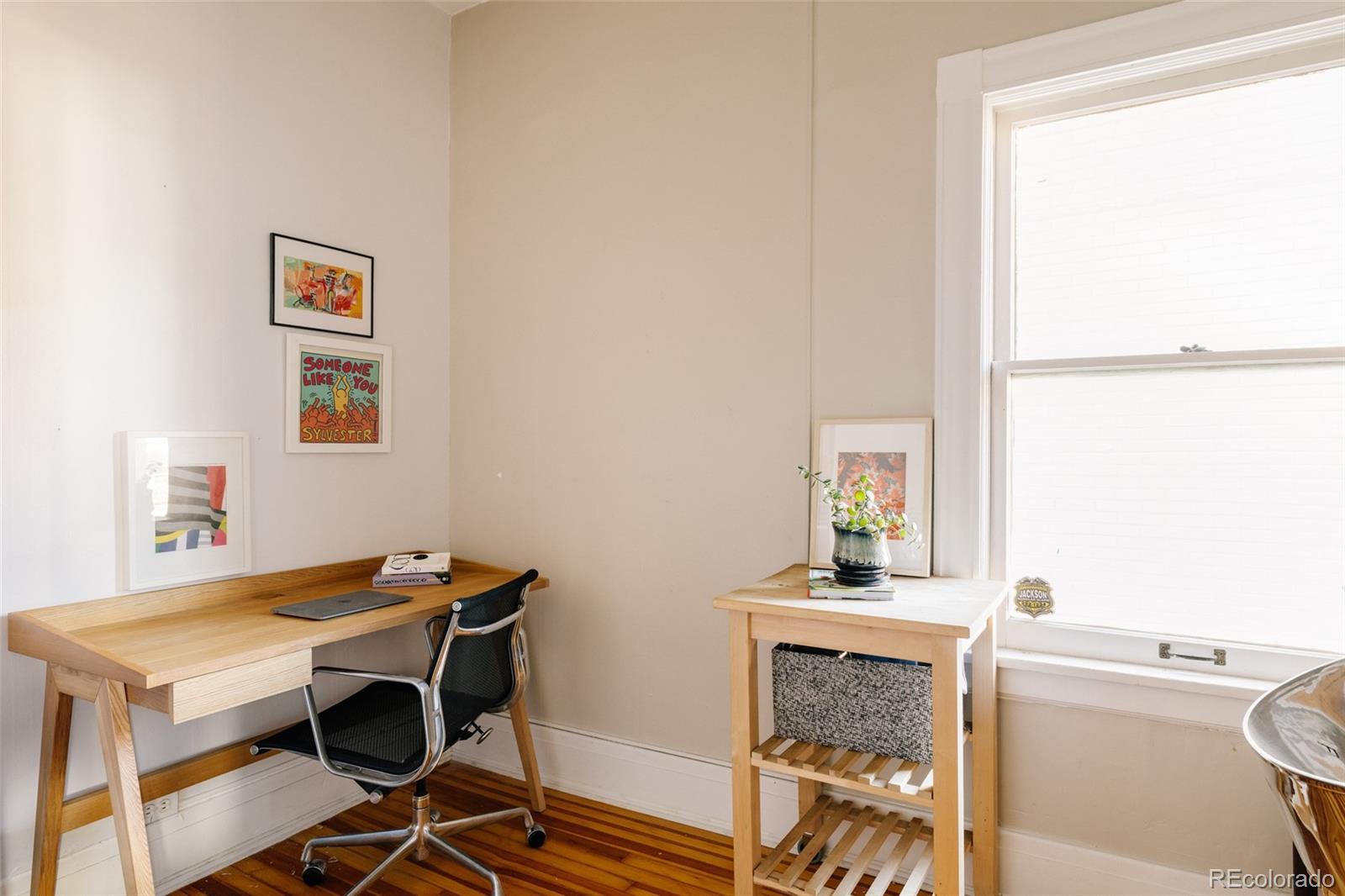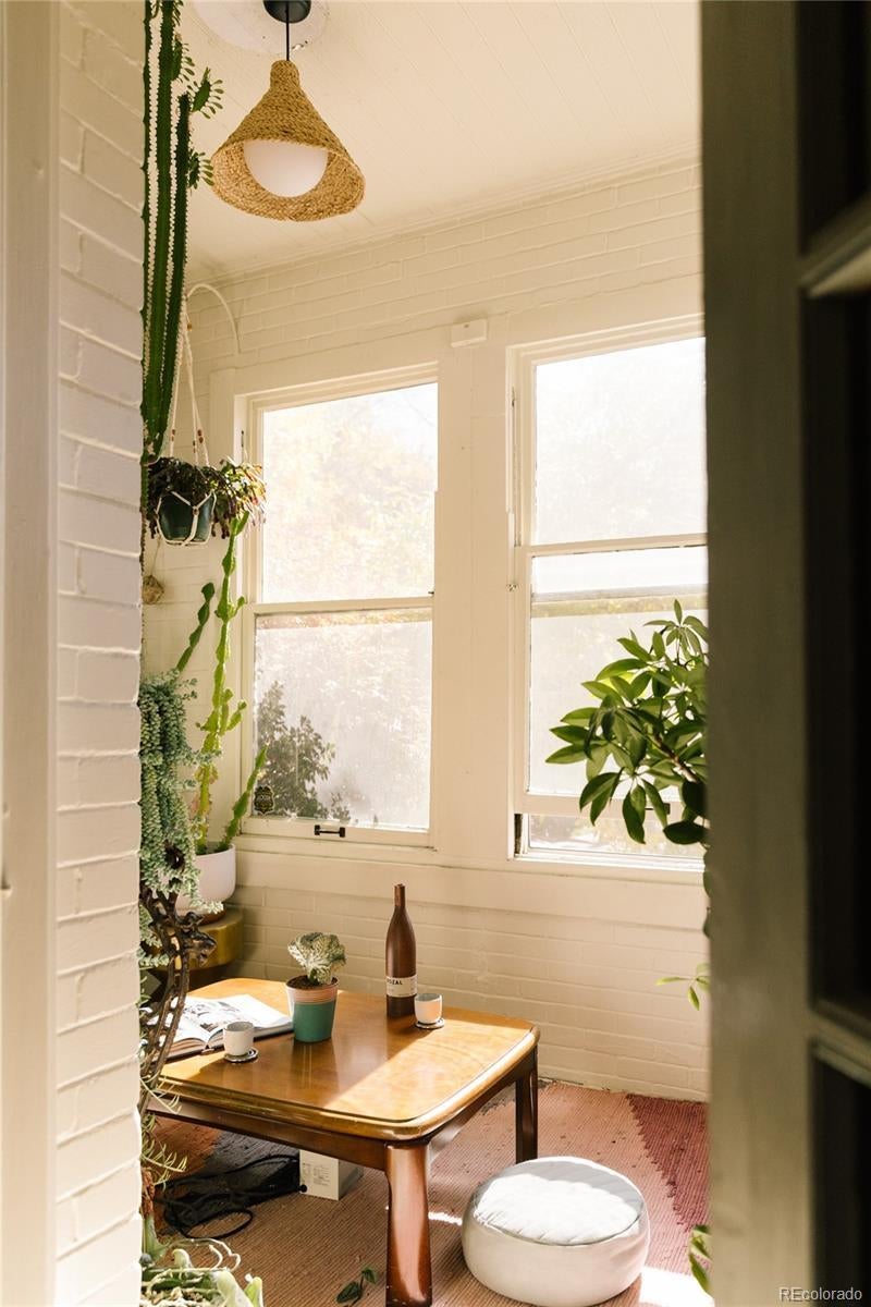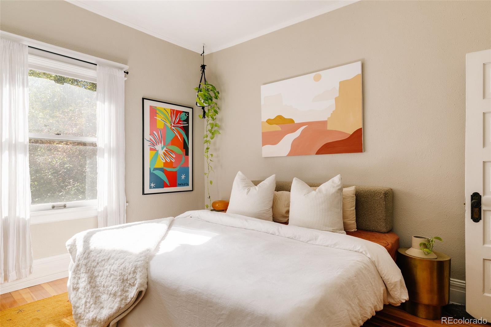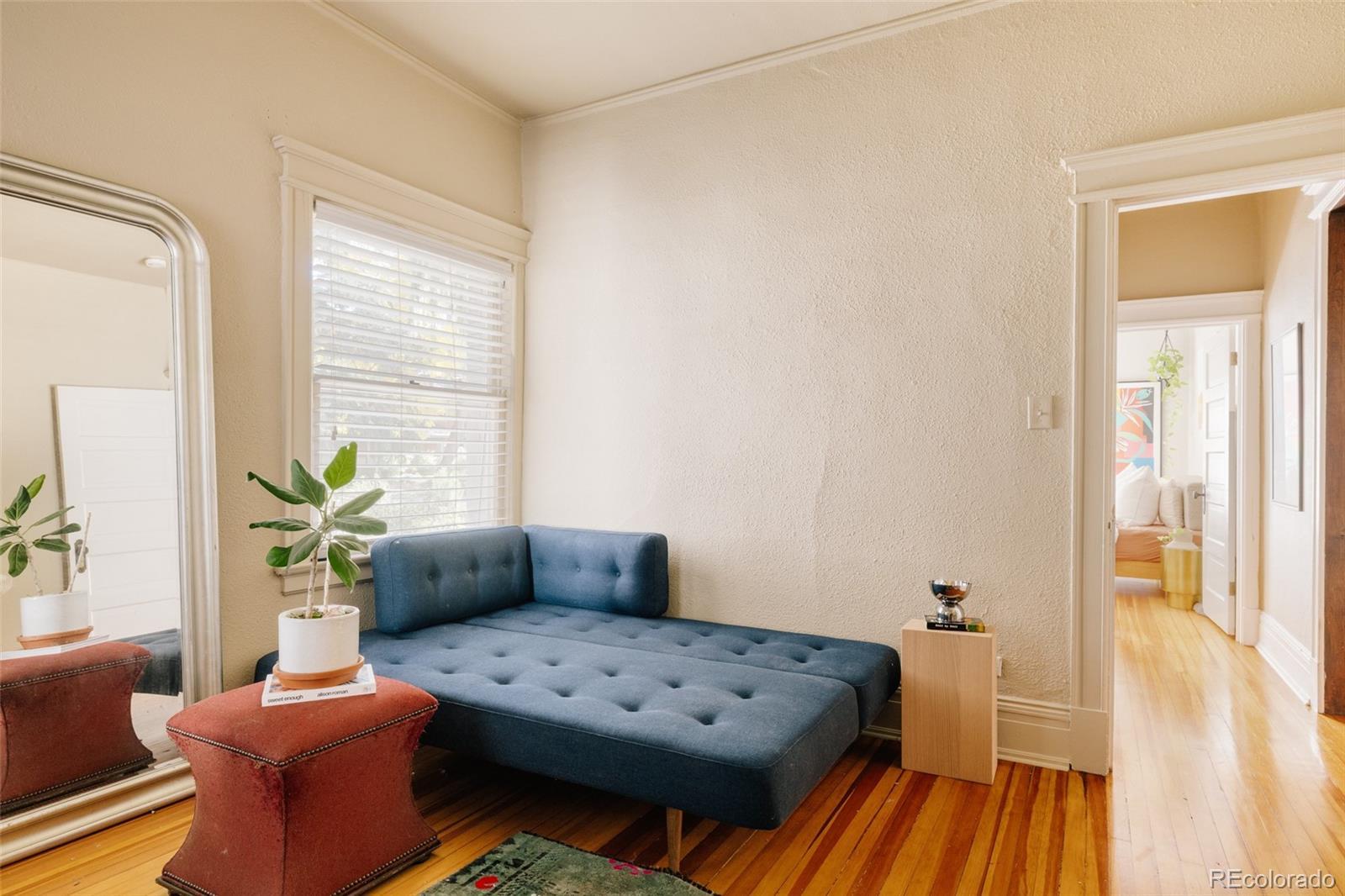 Soaring ceilings and timeless charm define this stunning home just around the corner from Cheesman Park. A seamless blend of early-century craftsmanship and sophisticated updates creates an old-world sanctuary with an unmistakably designer feel. Set within a stately brick building shaded by mature trees, the home welcomes you with a gracious foyer that immediately conveys a sense of scale and airiness. Original hardwood floors lead through expansive living and dining spaces designed for entertaining, showcasing period millwork, oversized windows, and a formal dining room ready to host large gatherings. The inviting living room flows into a delightful sunroom — an ideal spot for morning coffee, an artful reading nook, or a lush indoor garden retreat. The thoughtfully updated kitchen balances style and function with sleek cabinetry, stone countertops, and curated lighting, all while honoring the home’s original character. Two spacious bedrooms easily accommodate king-sized beds, while the vintage-inspired bath features a claw-foot tub and classic detailing. A flexible third room offers the perfect home office or creative studio, and both front and rear entries include practical mudroom-style storage. The building enhances everyday ease with a shared garden and additional storage areas, fostering a true sense of community. Located just a block and a half from Cheesman Park and moments from neighborhood cafés and beloved restaurants, this rare and romantic residence captures the best of Denver’s historic architecture and modern living.