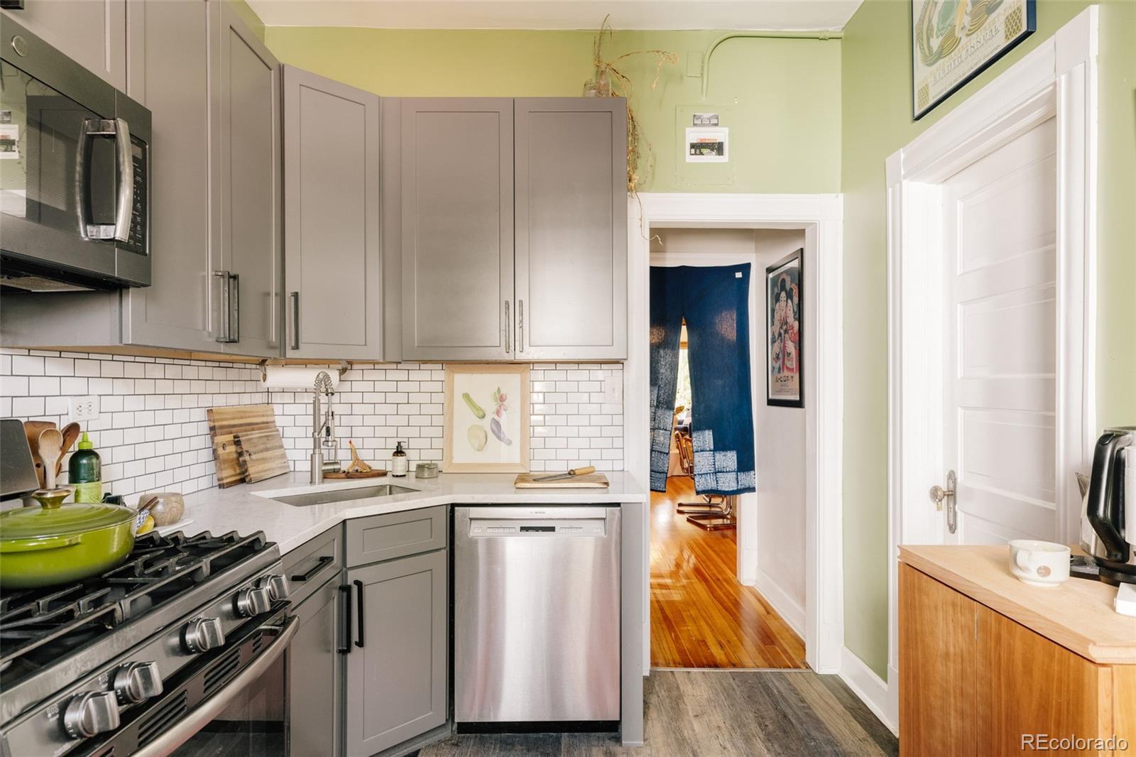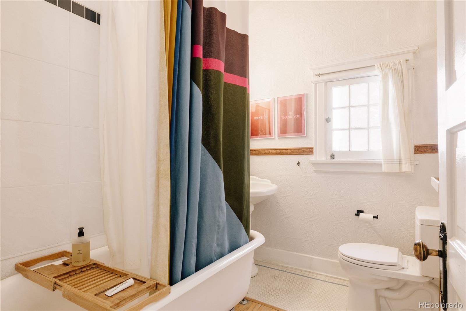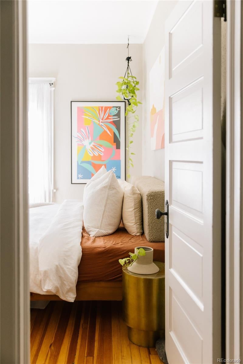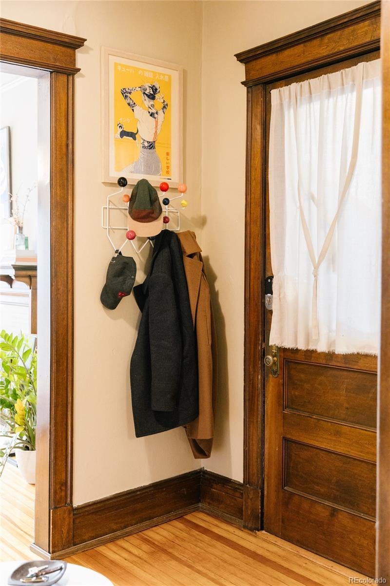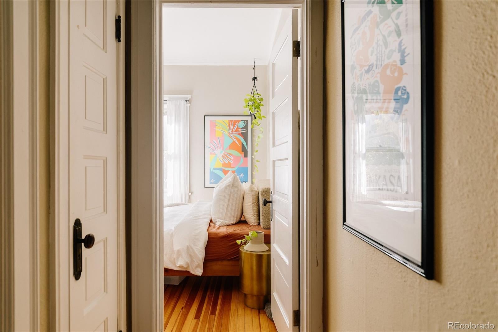 Soaring ceilings and timeless charm define this stunning home just around the corner from Cheesman Park. A seamless blend of early-century craftsmanship and sophisticated updates creates an old-world sanctuary with an unmistakably designer feel. Set within a stately brick building shaded by mature trees, the home welcomes you with a gracious foyer that immediately conveys a sense of scale and airiness. Original hardwood floors lead through expansive living and dining spaces designed for entertaining, showcasing period millwork, oversized windows, and a formal dining room ready to host large gatherings. The inviting living room flows into a delightful sunroom — an ideal spot for morning coffee, an artful reading nook, or a lush indoor garden retreat. The thoughtfully updated kitchen balances style and function with sleek cabinetry, stone countertops, and curated lighting, all while honoring the home’s original character. Two spacious bedrooms easily accommodate king-sized beds, while the vintage-inspired bath features a claw-foot tub and classic detailing. A flexible third room offers the perfect home office or creative studio, and both front and rear entries include practical mudroom-style storage. The building enhances everyday ease with a shared garden and additional storage areas, fostering a true sense of community. Located just a block and a half from Cheesman Park and moments from neighborhood cafés and beloved restaurants, this rare and romantic residence captures the best of Denver’s historic architecture and modern living.