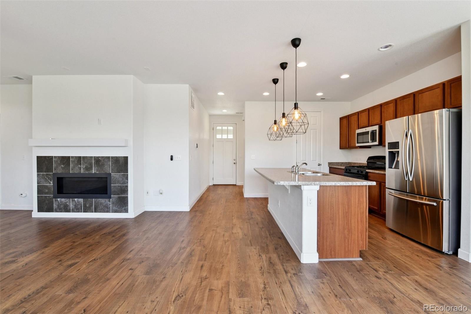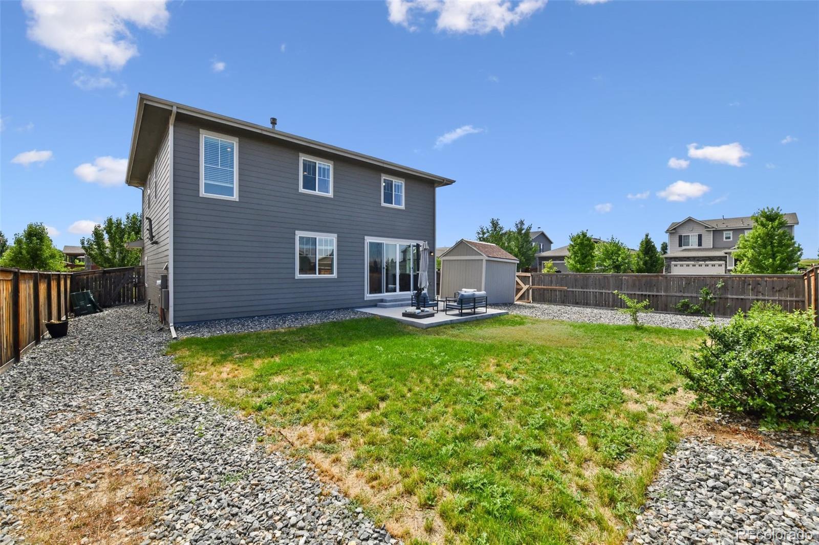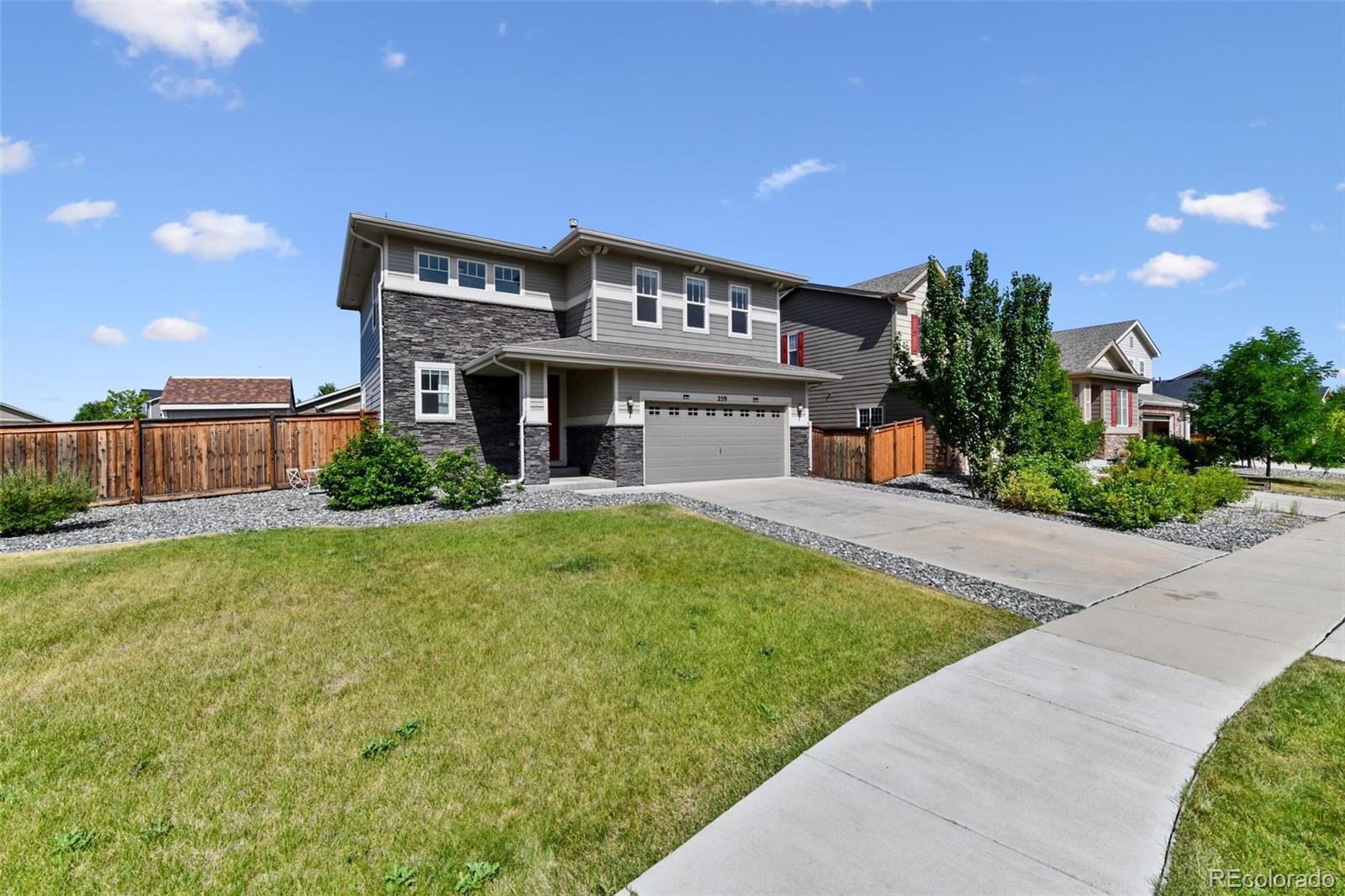 Discover this well-maintained Aurora residence, built in 2017, offering a harmonious blend of contemporary design and functional living. Situated on a corner lot, this home boasts great curb appeal with a big front, side, and back yard. Inside, you'll find new hardwood flooring throughout the home, which features an open layout perfect for entertaining. The generously proportioned kitchen includes a large center island, ample cabinetry, and sleek appliances, complemented by new custom cabinets at the butler's pantry. Dual expansive sliding glass doors connect the interior to a private patio, ideal for outdoor enjoyment. A convenient powder room is located on the main floor. Upstairs, a versatile loft space provides flexibility for various needs, alongside three spacious bedrooms and two full bathrooms. The primary suite is complete with a dual vanity, walk-in shower, and private water closet. Secondary bedrooms are bright and offer generous closet space, sharing a well-appointed full bathroom. The laundry room is also conveniently situated on the upper level. This home is situated in a well-maintained community with parks, a swimming pool, and a clubhouse. Its location offers easy access to major highways and is a short drive to shopping and dining.