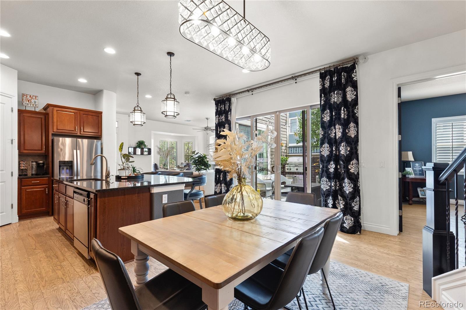 Welcome to this beautifully upgraded, end-unit, townhouse in the highly sought-after Ridgegate community of Lincoln Park. Elegance, comfort, and convenience come together in this sun-drenched home, thoughtfully enhanced with high-end finishes and stylish updates throughout. Step inside to find refinished hardwood floors, fresh interior paint, and designer light fixtures that set a warm, sophisticated tone. The main level flows seamlessly with an open-concept layout, cozy family room with fireplace and a gourmet kitchen featuring a gas range with hood, high-end appliances, a granite island, pantry, breakfast nook and a beverage coolers — perfect for entertaining. French doors lead to a dedicated den or office, ideal for remote work. Enjoy year-round indoor/outdoor living with a charming courtyard accessed directly from the kitchen. Upstairs, a spacious loft area offers flexibility for a second office, playroom, or media space. The luxurious primary suite is a true retreat, complete with a cozy fireplace, private balcony, custom walk-in closet system, and a spa-like 5-piece bath. Two additional bedrooms each feature ensuite bathrooms and sizable closets. Additional highlights include: New stair railings, custom window treatments & plantation shutters, upstairs hardwood flooring, included washer & dryer, convenient upper-level laundry and a spacious 3-car attached garage with storage. Live just moments from top-rated hospitals, upscale shopping, fine dining, and the Lone Tree Arts Center. Outdoor enthusiasts will love the quick access to the Bluffs Regional Park Trail, just a short walk away. This home is the perfect blend of style, function, and location—schedule your showing today!