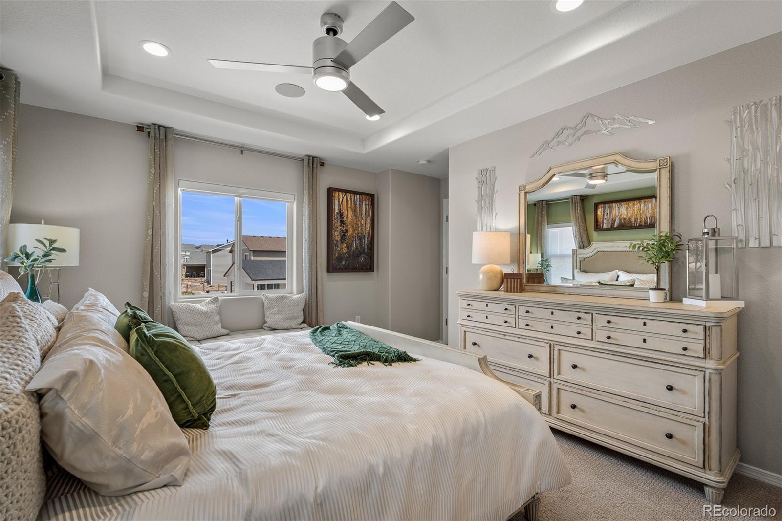Absolutely PERFECT HOME with THE BEST Mountain Views in all of Gold Hill Mesa! Enter into a GREAT ROOM boasting a gorgeous kitchen at the heart of the home, with a huge quartz center island, gas stove, a large pantry and stainless-steel appliances. The KITCHEN is surrounded by a large living room, w/separate dining area, and EXTRA WINDOWS that create superior lighting. The UPGRADED BLIND/SHUTTERS give an elegant and classy look to the entire home. The shutters fully open to allow picturesque views of the Mountains throughout the house. The tasteful stained-glass windows in the living room add a touch of sparkle. The cozy FIREPLACE adds atmosphere and warmth on cool evenings. LUXURY VINYL FLOORING throughout the main level. The entire house has 9' CEILINGS including the basement and upper levels. The spacious upper Master Bedroom has a private WALK-OUT BALCONY with breathtaking views of Pikes Peak. The upgraded tiled Master bath features a glass SPA SHOWER with a rain head fixture, quartz countertop and an expansive walk-in closet. The 2 large secondary bedrooms also have walk in closets. The FINISHED BASEMENT includes a recreation room, bedroom, full bath and extra storage. The home was built on ONE OF THE LARGEST LOTS in Gold Hill, across the street from Mayflower Park, so the mountain views from the home are wide open magnificent! The extra windows bring the beauty inside. Sit on the lovely front porch, ENJOY THE VIEWS and watch the HOA take care of the large MAINTENANCE FREE YARD! The private fenced back patio comes with garden beds, and more views. The 2 CAR attached garage is fully finished and includes EXTRA STORAGE space. Home has CENTRAL AIR. The elegant finishes, the large lot, the park, the beautiful mountain views, the 9' ceilings and all of the extra windows make this home feel very LIGHT, BRIGHT AND OPEN. The neighborhood community center includes a GYM, several parks and hosts Music on the Mesa CONCERTS throughout the summer. Come see!