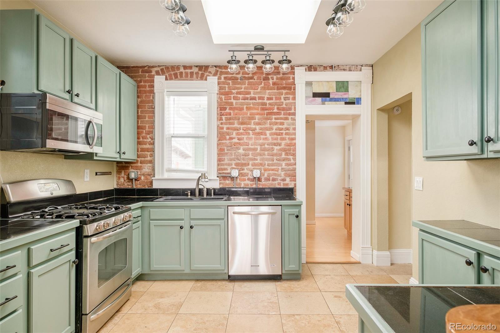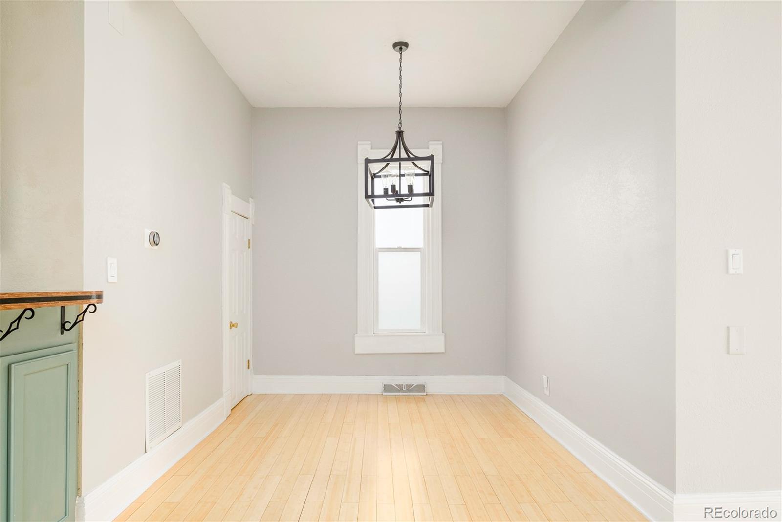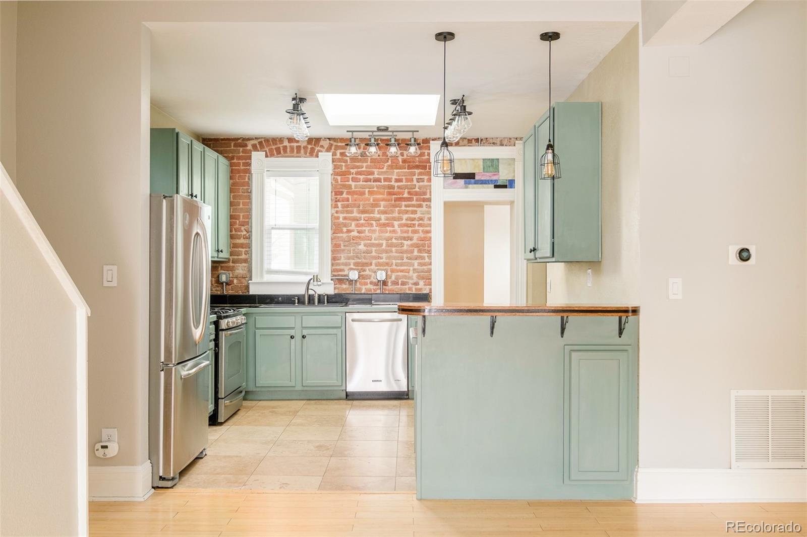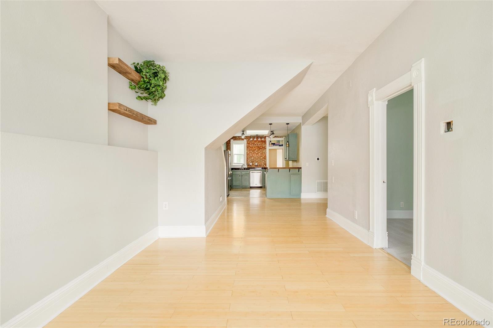 Beaming with charm and urban sophistication, this LoHi home offers an effortless balance of timeless character and modern comfort. A gated front yard sets a welcoming tone before entering a bright, spacious living area filled with abundant natural light from large windows. The dining space, accented by a classic light fixture, flows seamlessly into a luminous kitchen boasting stainless steel appliances, cozy exposed brick and generous cabinetry. Three main-floor bedrooms provide flexible living options, while the upstairs primary suite presents a secluded retreat with vaulted ceilings and an en-suite bath featuring dual vanities and a walk-in shower. An additional office offers potential to become a bedroom, enhancing versatility. Everyday convenience is elevated by a dedicated laundry area with a stackable washer and dryer set. Outside, a private, fenced-in patio creates an intimate setting for entertaining or quiet relaxation — perfectly complementing LoHi’s vibrant lifestyle.