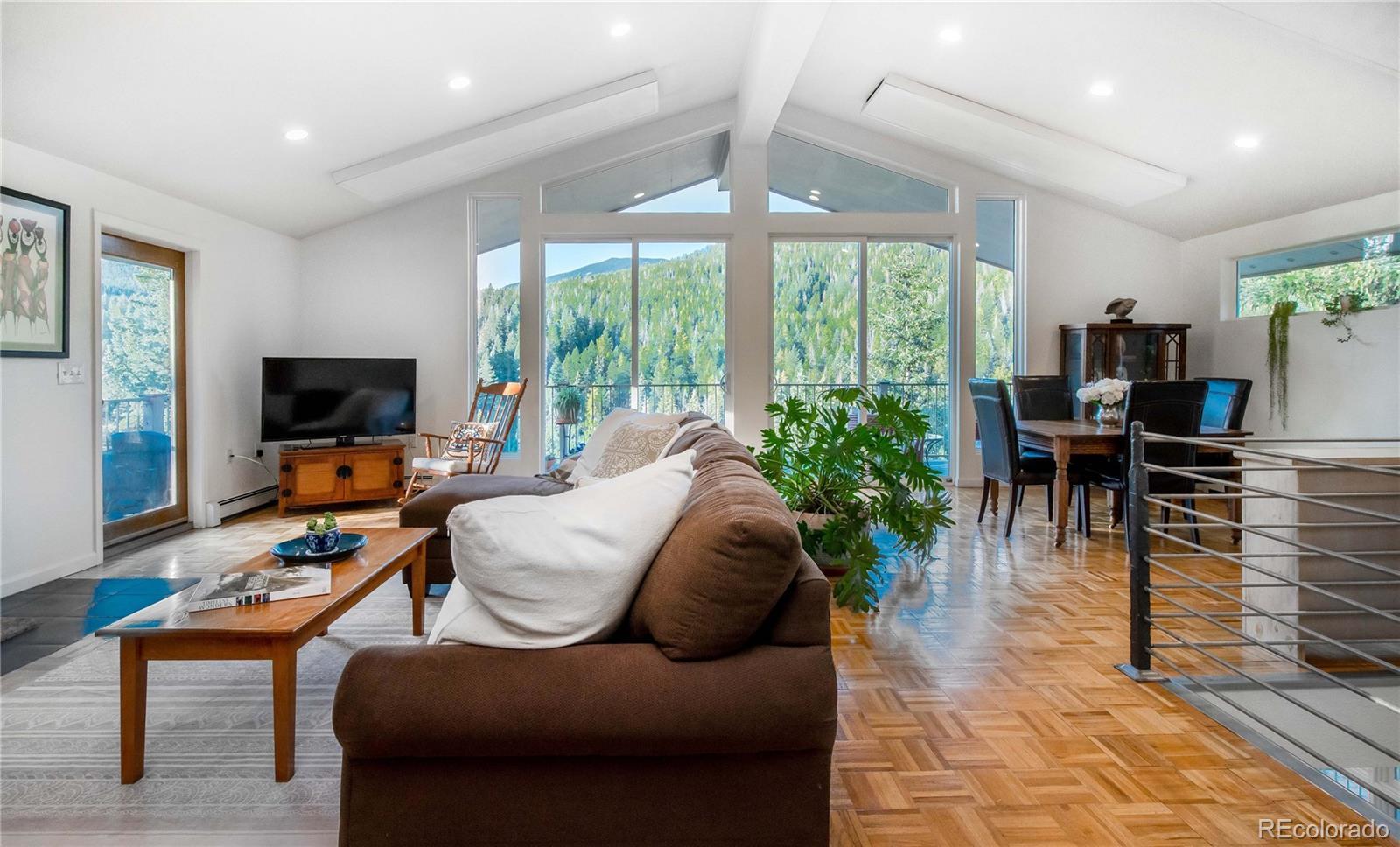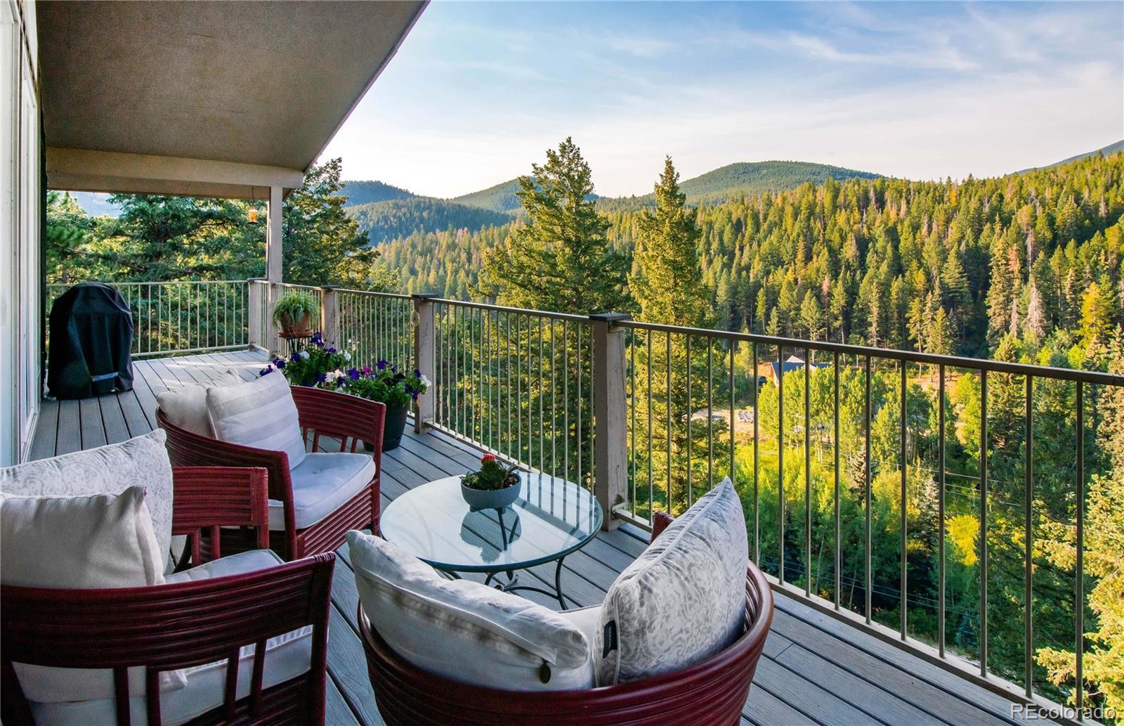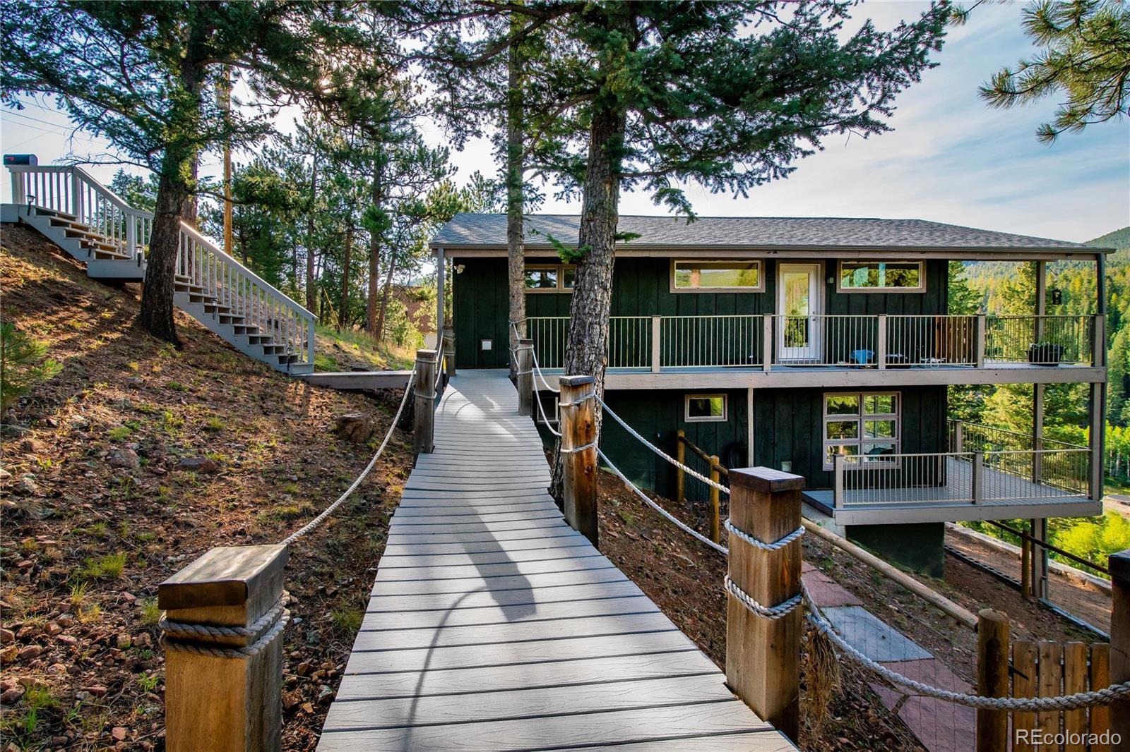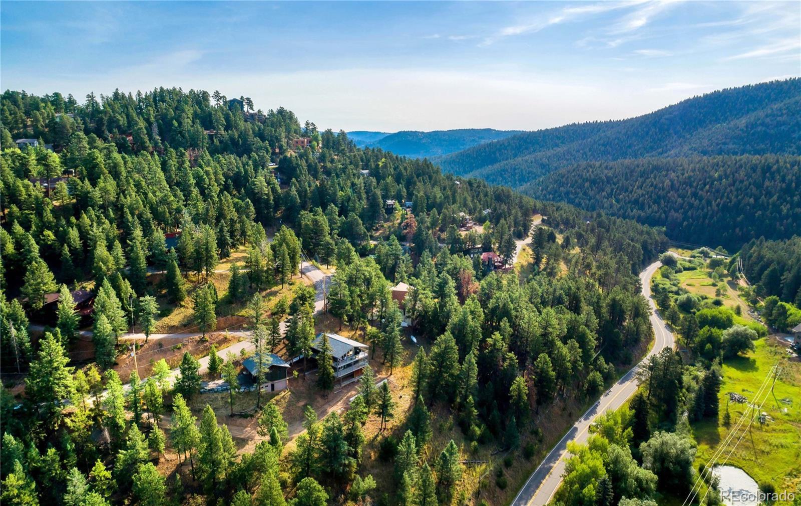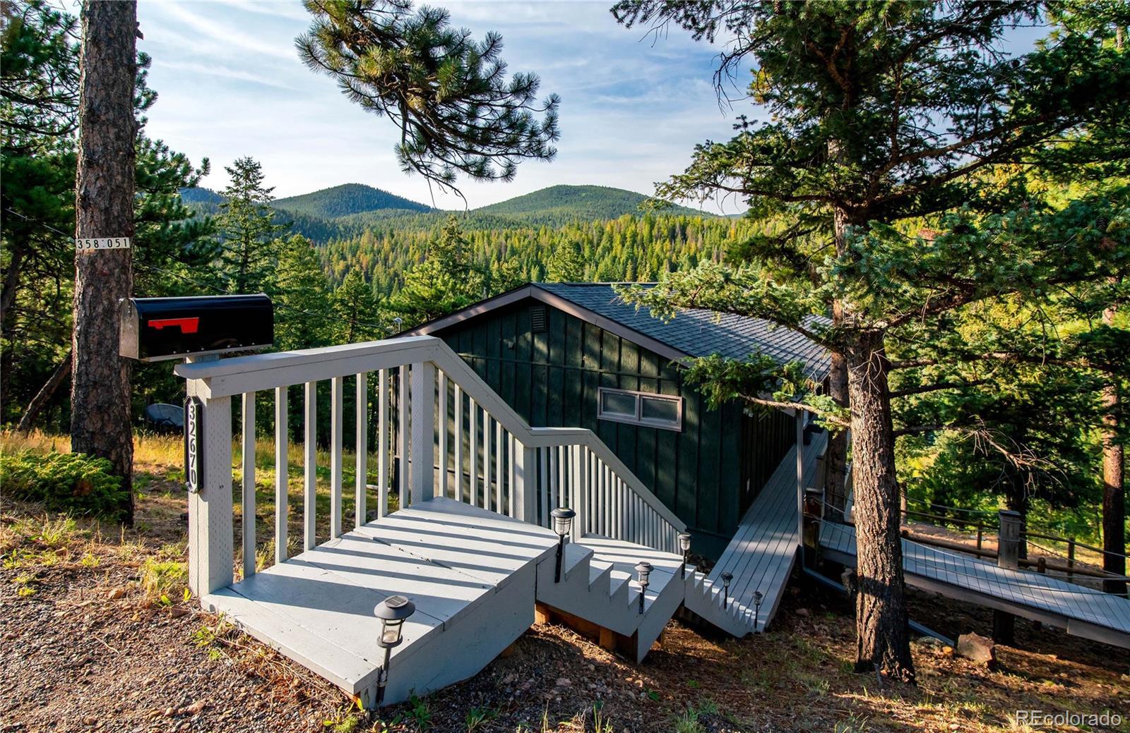 Be captivated by the most impressive views at a price point accessible to anyone, offering you an incredible opportunity to own a piece of mountain paradise in Evergreen, CO! Upon entering the home, you're immediately taken aback by the breathtaking scenery of the national forest visible through the wall of windows in the great room. Slide open the tall doors to step onto a partially wrap-around deck—perfect for soaking in the serene sounds of Cub Creek and the stunning natural surroundings. The open-plan design seamlessly integrates the dining area, living room, and recently remodeled kitchen under soaring vaulted ceilings, complemented by elegant wood parquet floors and a large wood-burning stove. The primary suite is conveniently located on the main floor, while the lower level includes a family room with views, ample light, and a walkout to the lower deck with a convenient doggie door to the fenced dog run. You’ll also find two additional bedrooms (one non-conforming), laundry, and a full bathroom. A detached oversized two-car garage, with extra storage below, is accessible via a charming bridge. The home offers multiple heating options—radiant ceiling heat, a new boiler, passive solar, and a wood-burning stove—making winter living affordable. Located just 5 minutes from both Maxwell Falls Trailheads and National Forest trails, 12 minutes from downtown Evergreen, and 16 minutes from Aspen Park, this home embodies the essence of mountain living! Check out www.LiveInEvergreenCO.com for more pictures, video and information!