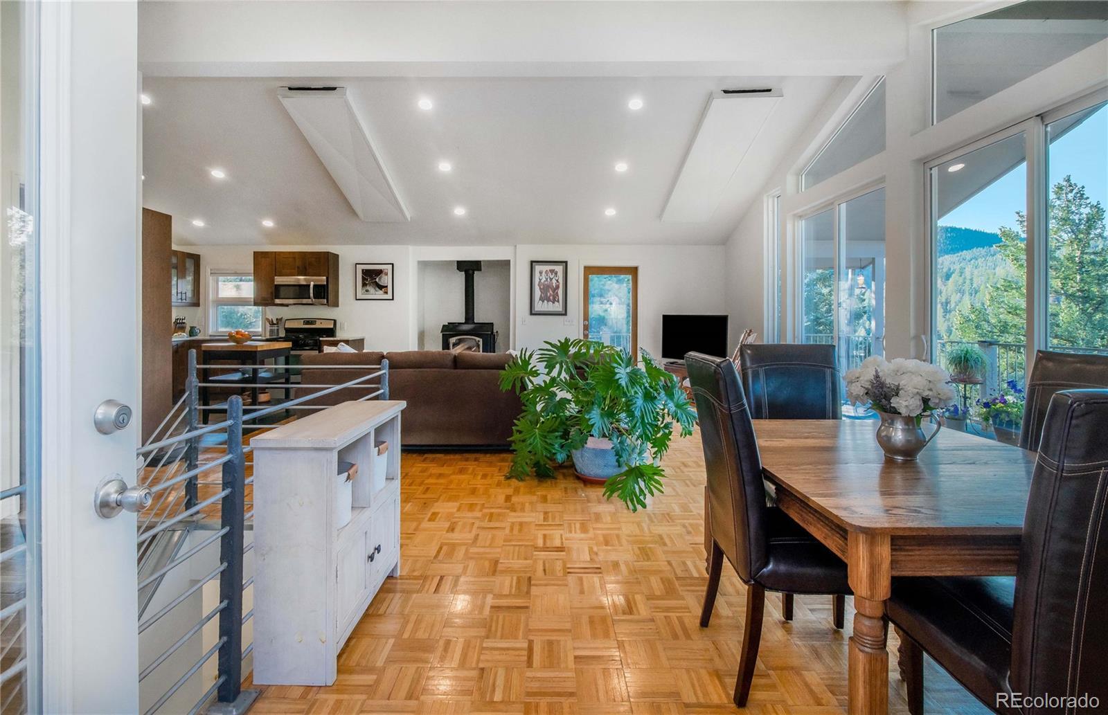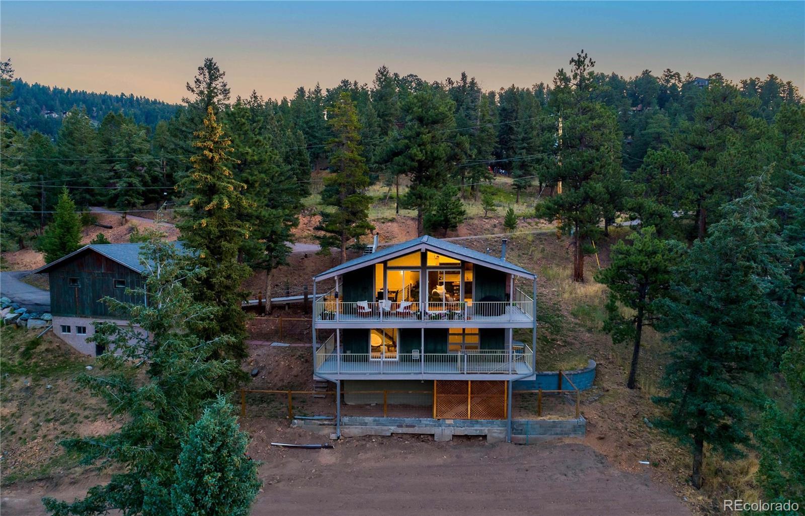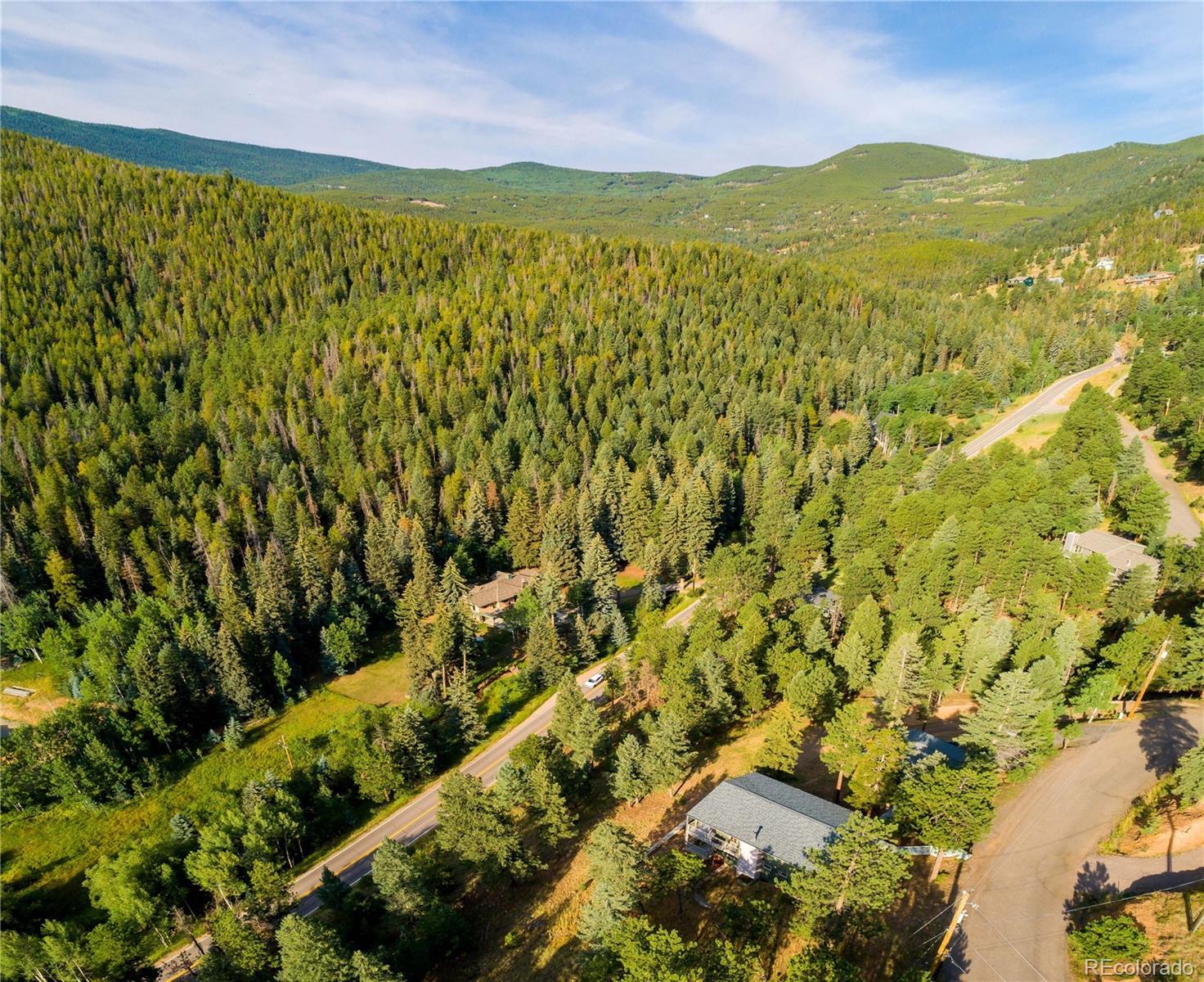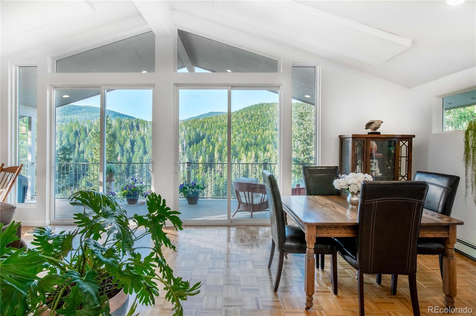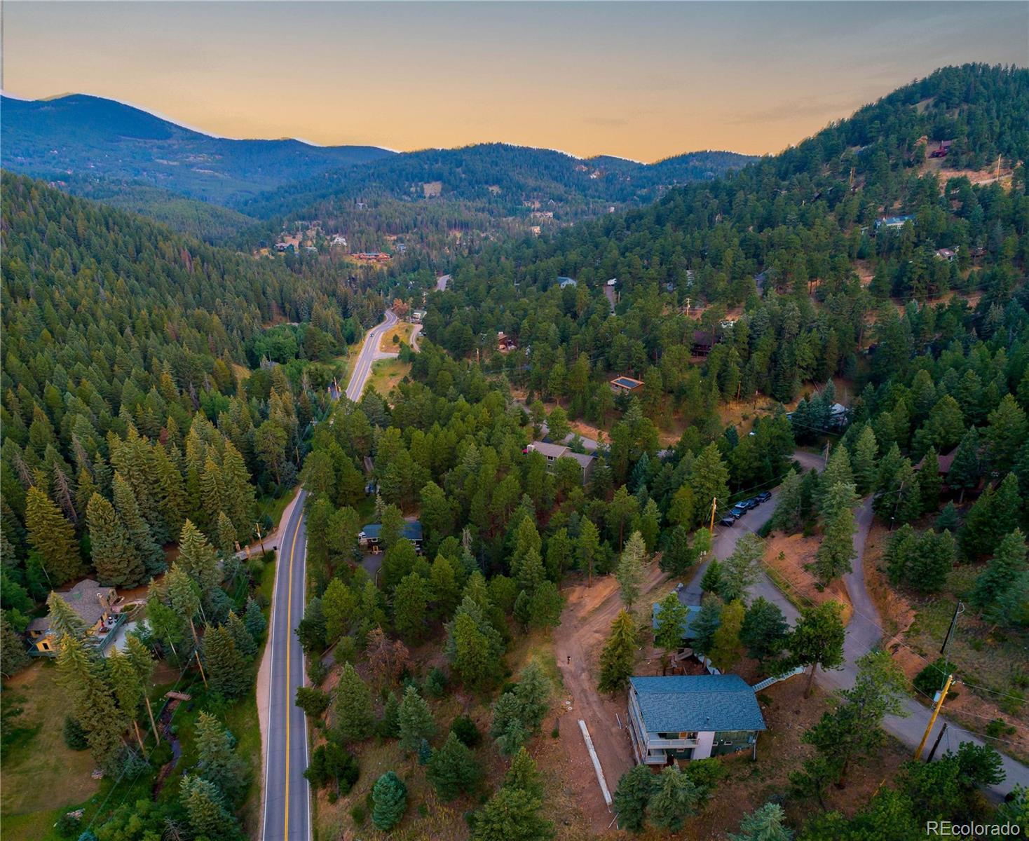 Be captivated by the most impressive views at a price point accessible to anyone, offering you an incredible opportunity to own a piece of mountain paradise in Evergreen, CO! Upon entering the home, you're immediately taken aback by the breathtaking scenery of the national forest visible through the wall of windows in the great room. Slide open the tall doors to step onto a partially wrap-around deck—perfect for soaking in the serene sounds of Cub Creek and the stunning natural surroundings. The open-plan design seamlessly integrates the dining area, living room, and recently remodeled kitchen under soaring vaulted ceilings, complemented by elegant wood parquet floors and a large wood-burning stove. The primary suite is conveniently located on the main floor, while the lower level includes a family room with views, ample light, and a walkout to the lower deck with a convenient doggie door to the fenced dog run. You’ll also find two additional bedrooms (one non-conforming), laundry, and a full bathroom. A detached oversized two-car garage, with extra storage below, is accessible via a charming bridge. The home offers multiple heating options—radiant ceiling heat, a new boiler, passive solar, and a wood-burning stove—making winter living affordable. Located just 5 minutes from both Maxwell Falls Trailheads and National Forest trails, 12 minutes from downtown Evergreen, and 16 minutes from Aspen Park, this home embodies the essence of mountain living! Check out www.LiveInEvergreenCO.com for more pictures, video and information!