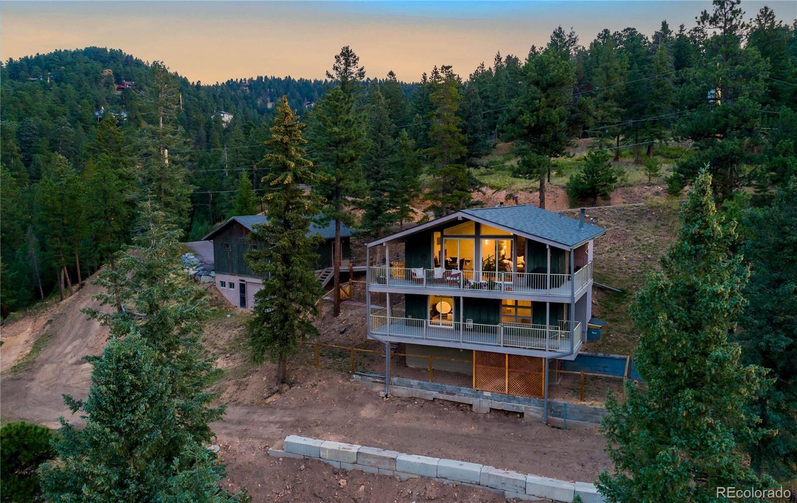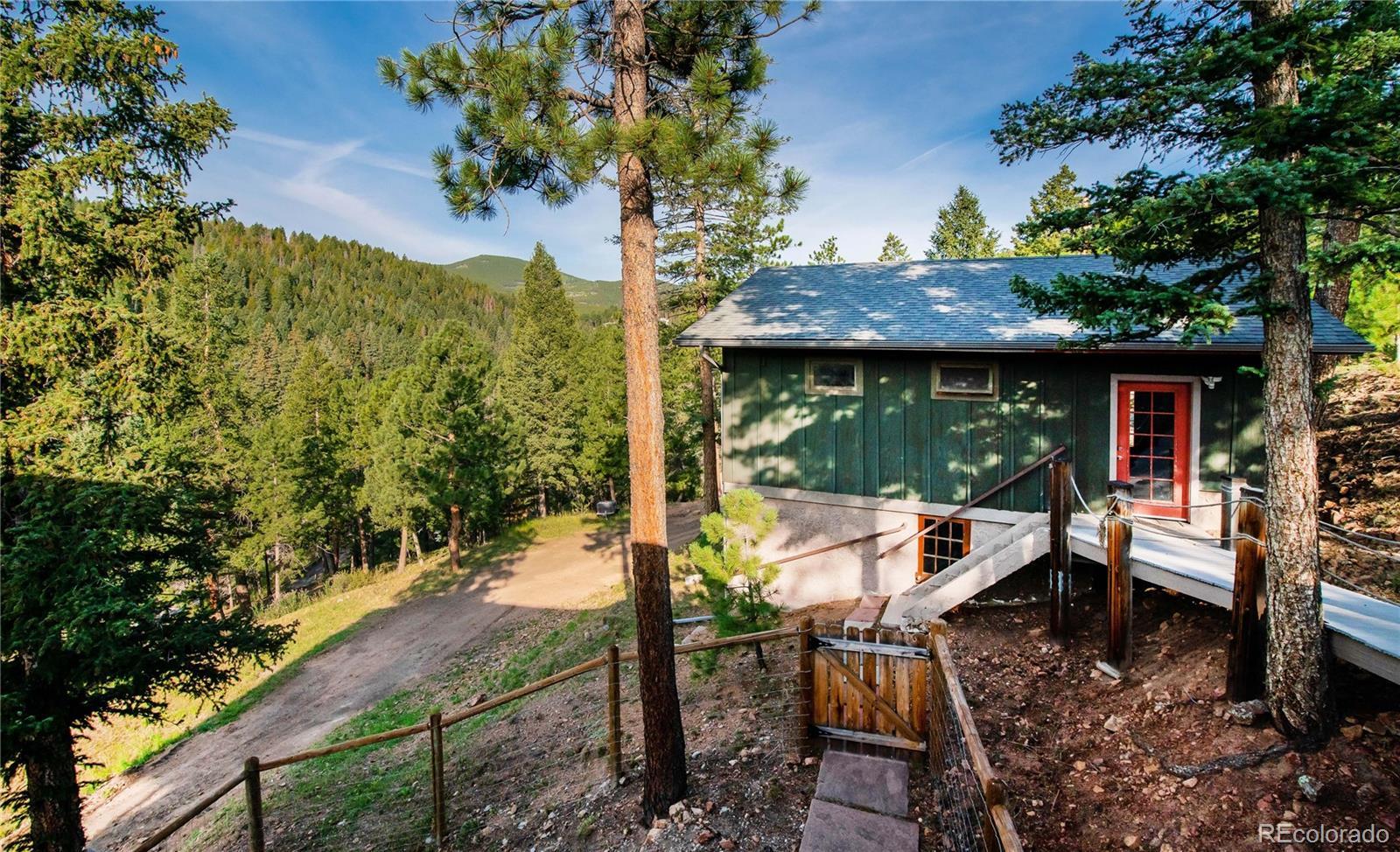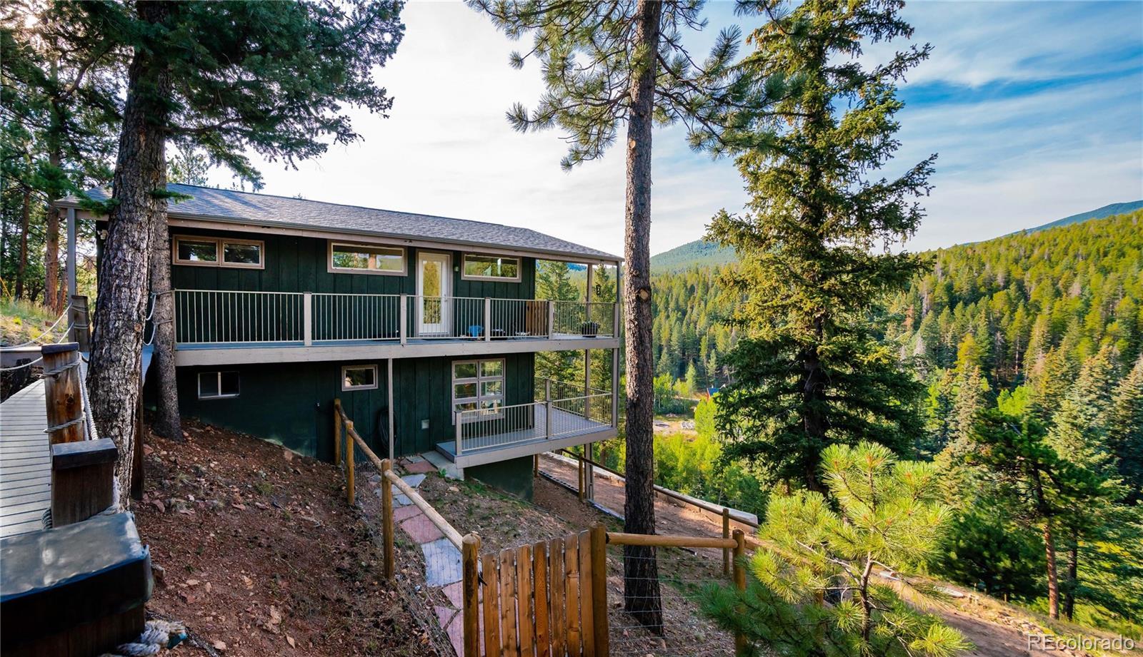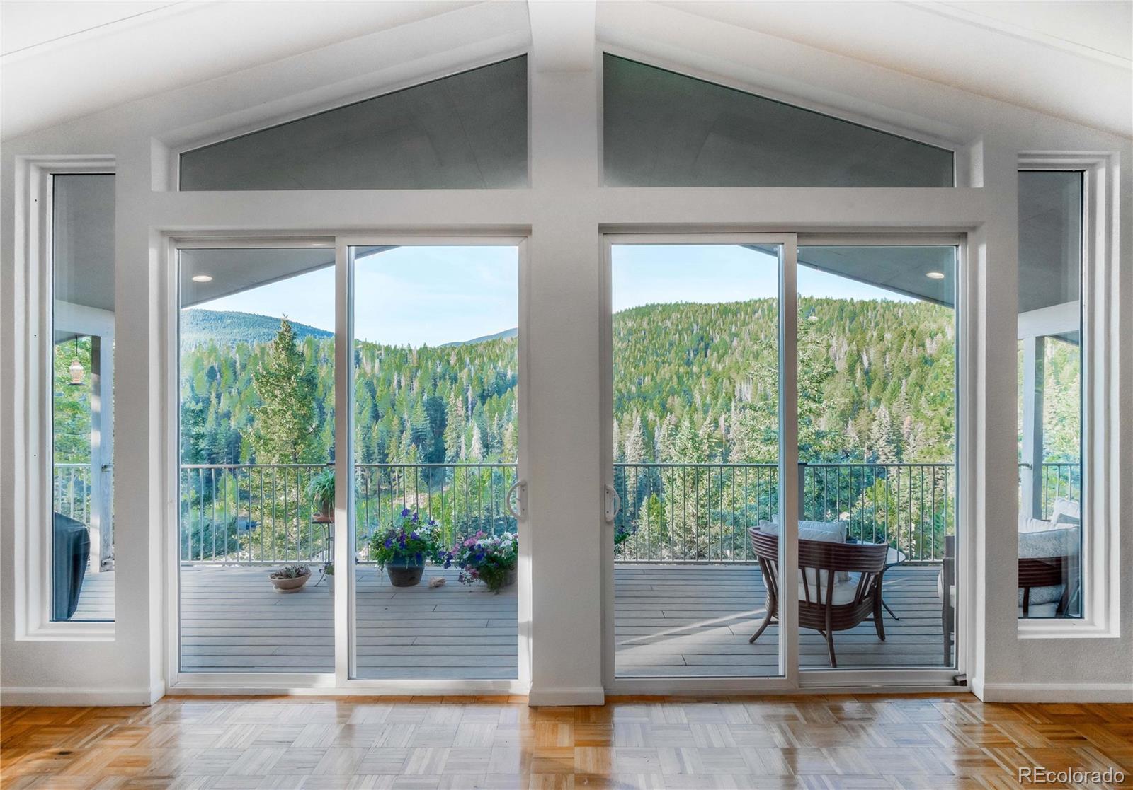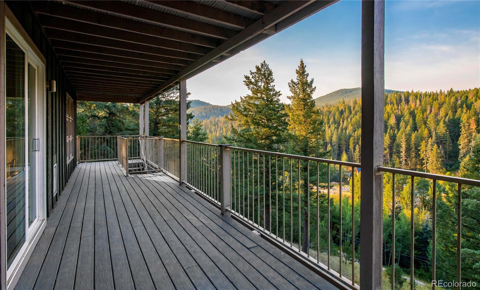 Be captivated by the most impressive views at a price point accessible to anyone, offering you an incredible opportunity to own a piece of mountain paradise in Evergreen, CO! Upon entering the home, you're immediately taken aback by the breathtaking scenery of the national forest visible through the wall of windows in the great room. Slide open the tall doors to step onto a partially wrap-around deck—perfect for soaking in the serene sounds of Cub Creek and the stunning natural surroundings. The open-plan design seamlessly integrates the dining area, living room, and recently remodeled kitchen under soaring vaulted ceilings, complemented by elegant wood parquet floors and a large wood-burning stove. The primary suite is conveniently located on the main floor, while the lower level includes a family room with views, ample light, and a walkout to the lower deck with a convenient doggie door to the fenced dog run. You’ll also find two additional bedrooms (one non-conforming), laundry, and a full bathroom. A detached oversized two-car garage, with extra storage below, is accessible via a charming bridge. The home offers multiple heating options—radiant ceiling heat, a new boiler, passive solar, and a wood-burning stove—making winter living affordable. Located just 5 minutes from both Maxwell Falls Trailheads and National Forest trails, 12 minutes from downtown Evergreen, and 16 minutes from Aspen Park, this home embodies the essence of mountain living! Check out www.LiveInEvergreenCO.com for more pictures, video and information!
