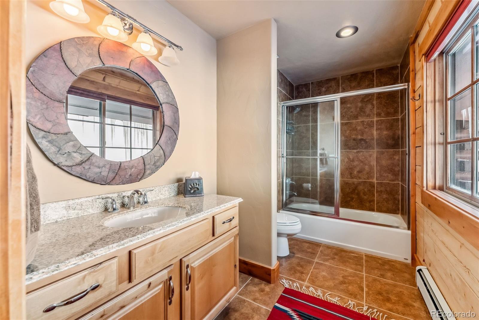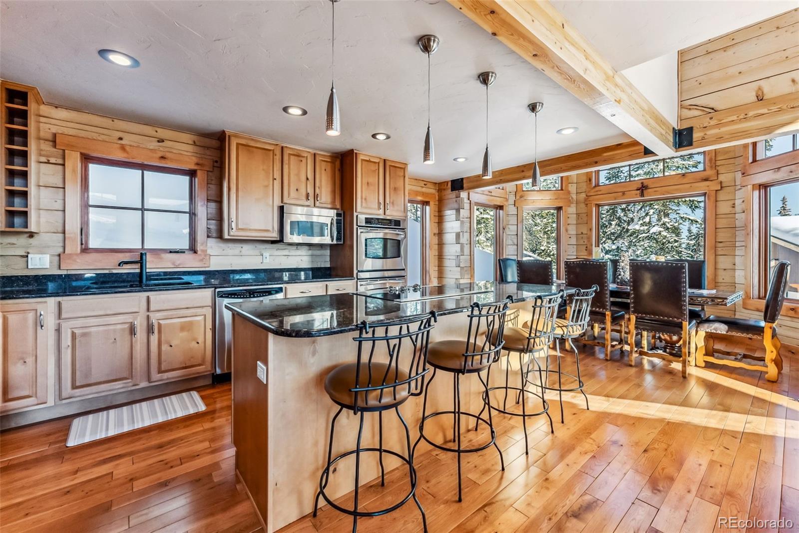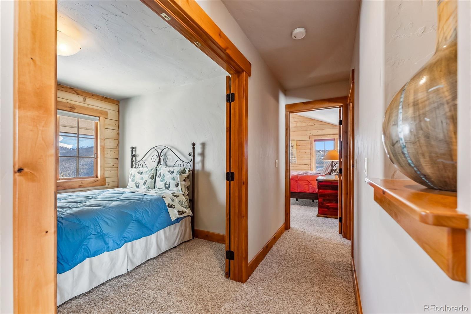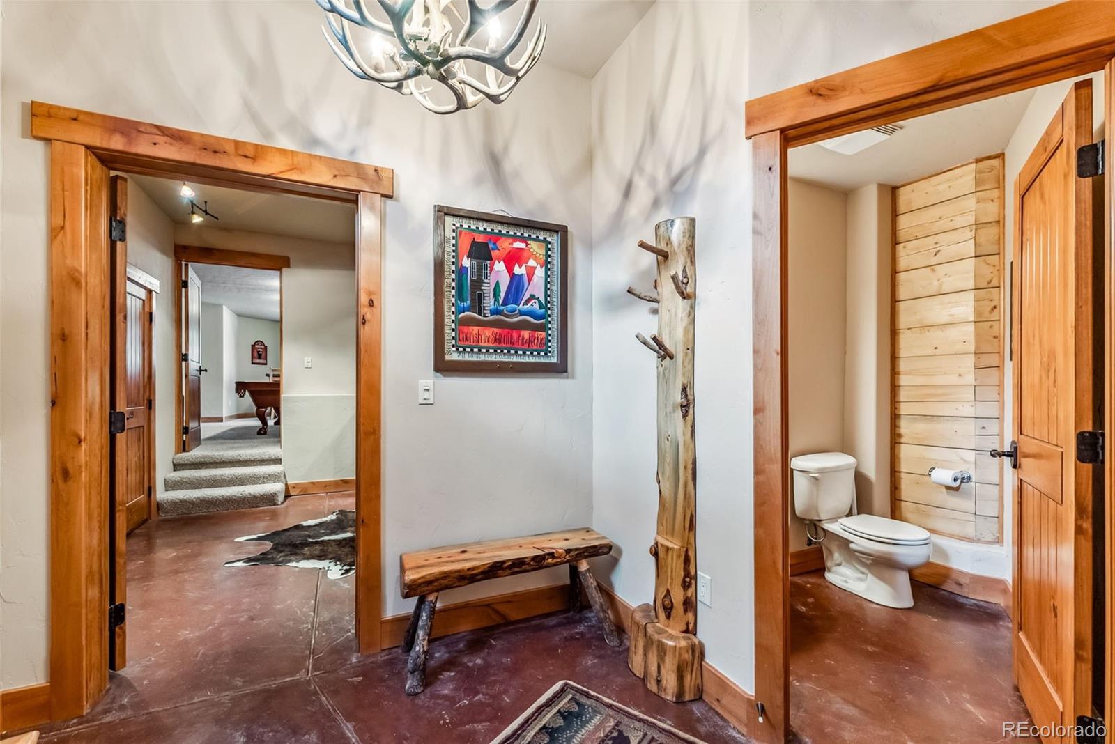 Stunning log home that is located in the North Star Village Subdivision and just minutes to main street Breckenridge. Home has many great features including a large Great Room with high ceilings and a wall of windows that take in the magnificent views of the Continental Divide and natural light all day long. Kitchen has double oven, electric cooktop, huge walk-in pantry and large island that creates additional seating. Floor to ceiling stone gas fireplace complements the log walls and solid wood floors for that true log cabin in the woods you have been looking for. Large walk-out deck on this level creates additional room for entertaining. Spacious dining area completes the Great Room. Additionally on this level is a half bath and a laundry room with a storage closet. Primary bedroom with 2 separate walk-in closets, gas fireplace, private balcony and 5 piece bath on main level. Upper level has 2 large bedrooms (one with a private bathroom) and a study/office or a non-conforming 4th bedroom/kids play room. Lower level/ground level has a 2 car garage, a spacious Recreation Room with pool table and bar, private family room and walk-in wine cellar with an area for wine tasting. Beautifully treed lot. This home is completely furnished. Turn-Key. On the Shuttle Bus Route.