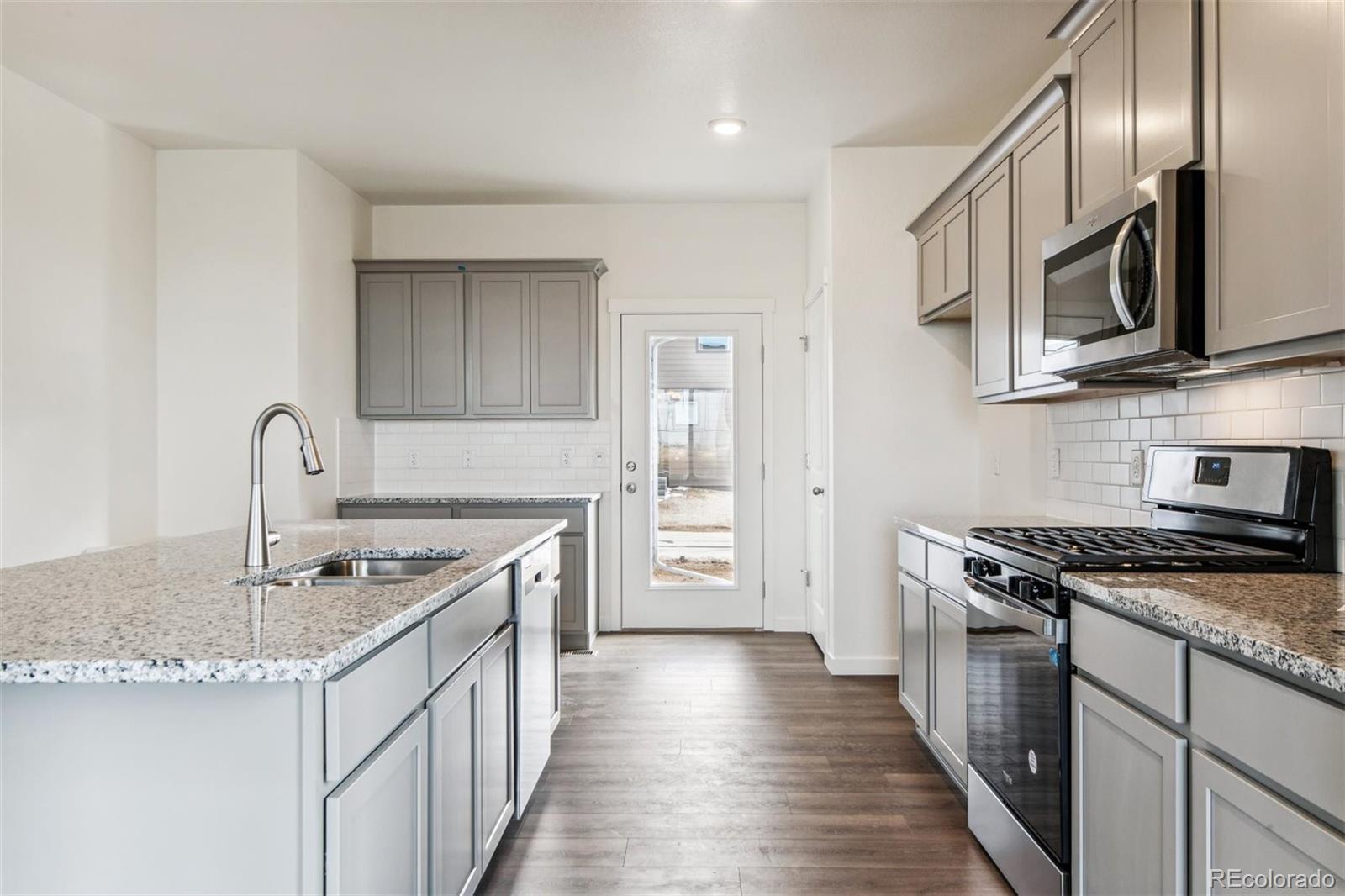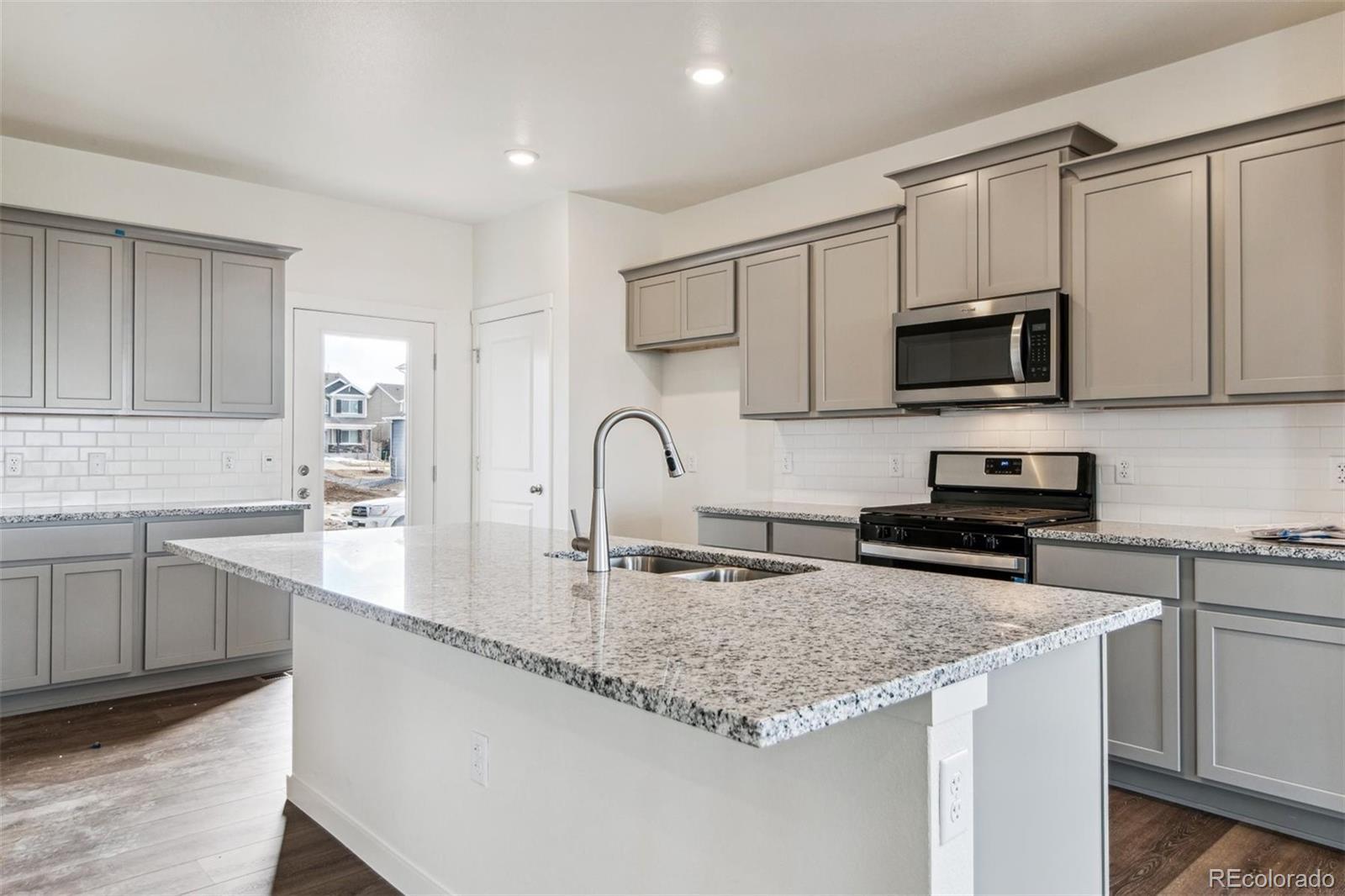 Gorgeous Elbert home to include 4 Bedrooms, 2.5 Bath, 2 car garage and an open floor plan with expansive 9 ft. ceilings on the main floor. Spacious kitchen includes eat in breakfast bar (expansive counter/cabinet space), pantry, gas stainless steel range, dishwasher, microwave, quartz counters w/undermount sink & chrome pull out faucet, gorgeous cabinets w/crown molding, and beautiful luxury vinyl plank on most of the main level and all wet areas. This home offers an extensive list of features including an 8' front door, 2 panel interior doors, A/C, tankless water heater, 8' tall garage doors with Smart Openers, Smart thermostat, Smart lighting and more. Several onsite Parks, Picnic Area, Playground and walking paths throughout the Community. ***Estimated Delivery Date: February. Photos are representative and not of actual property***