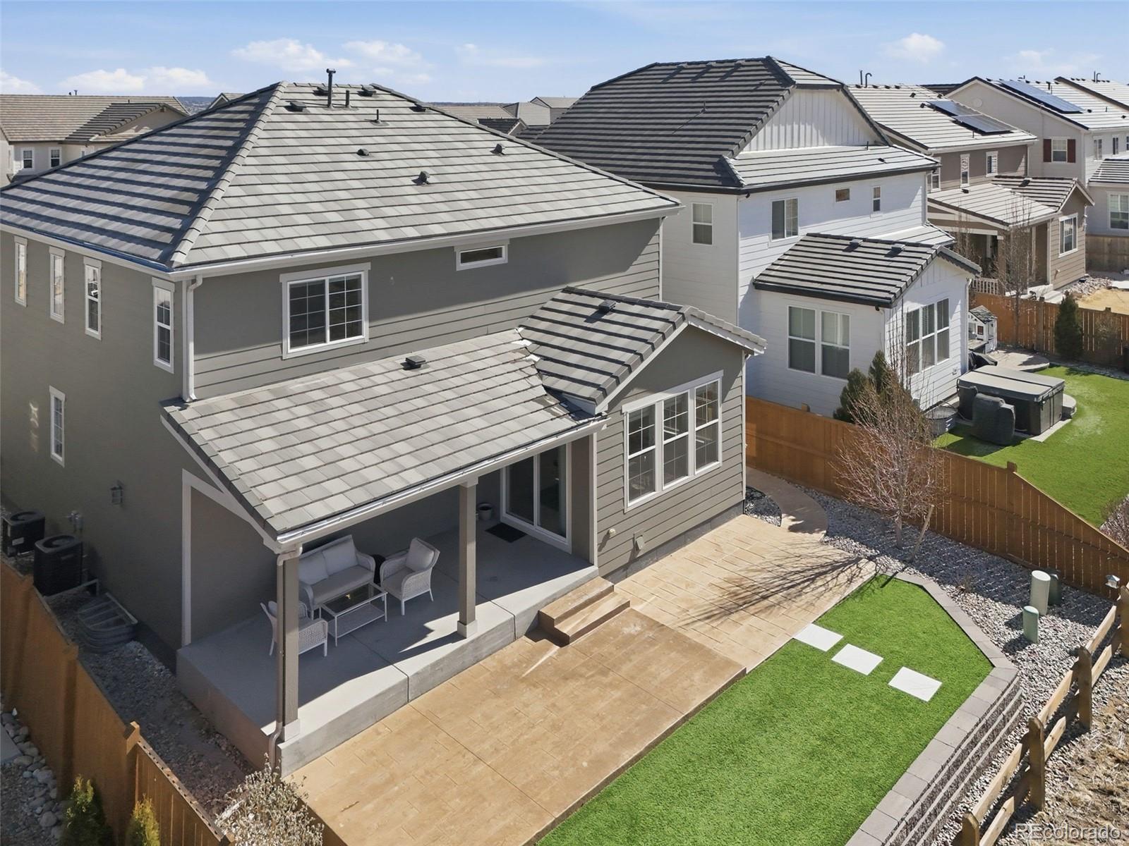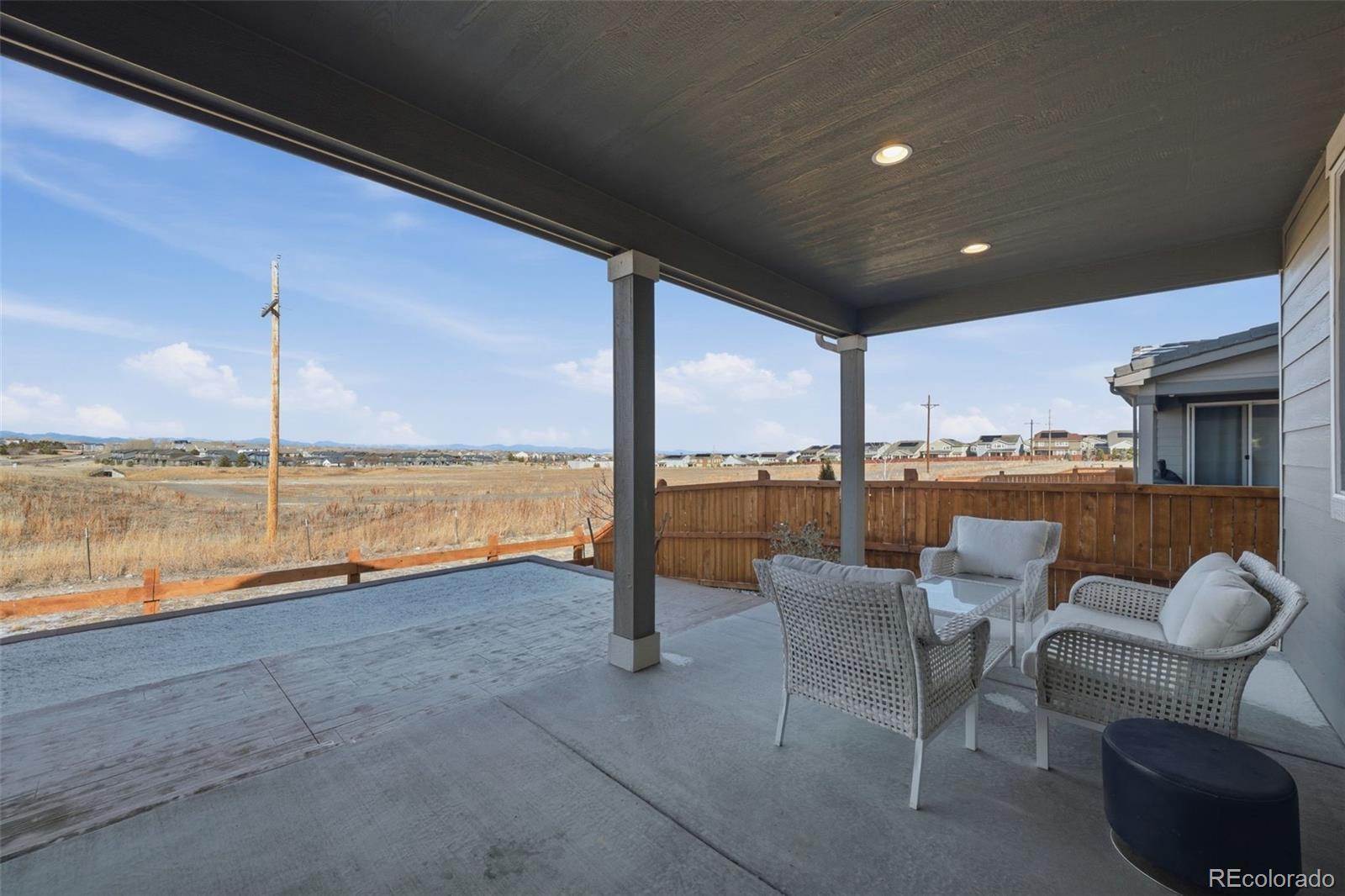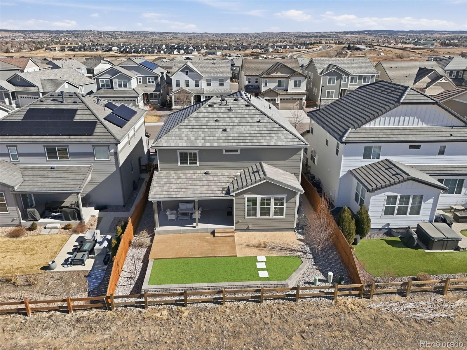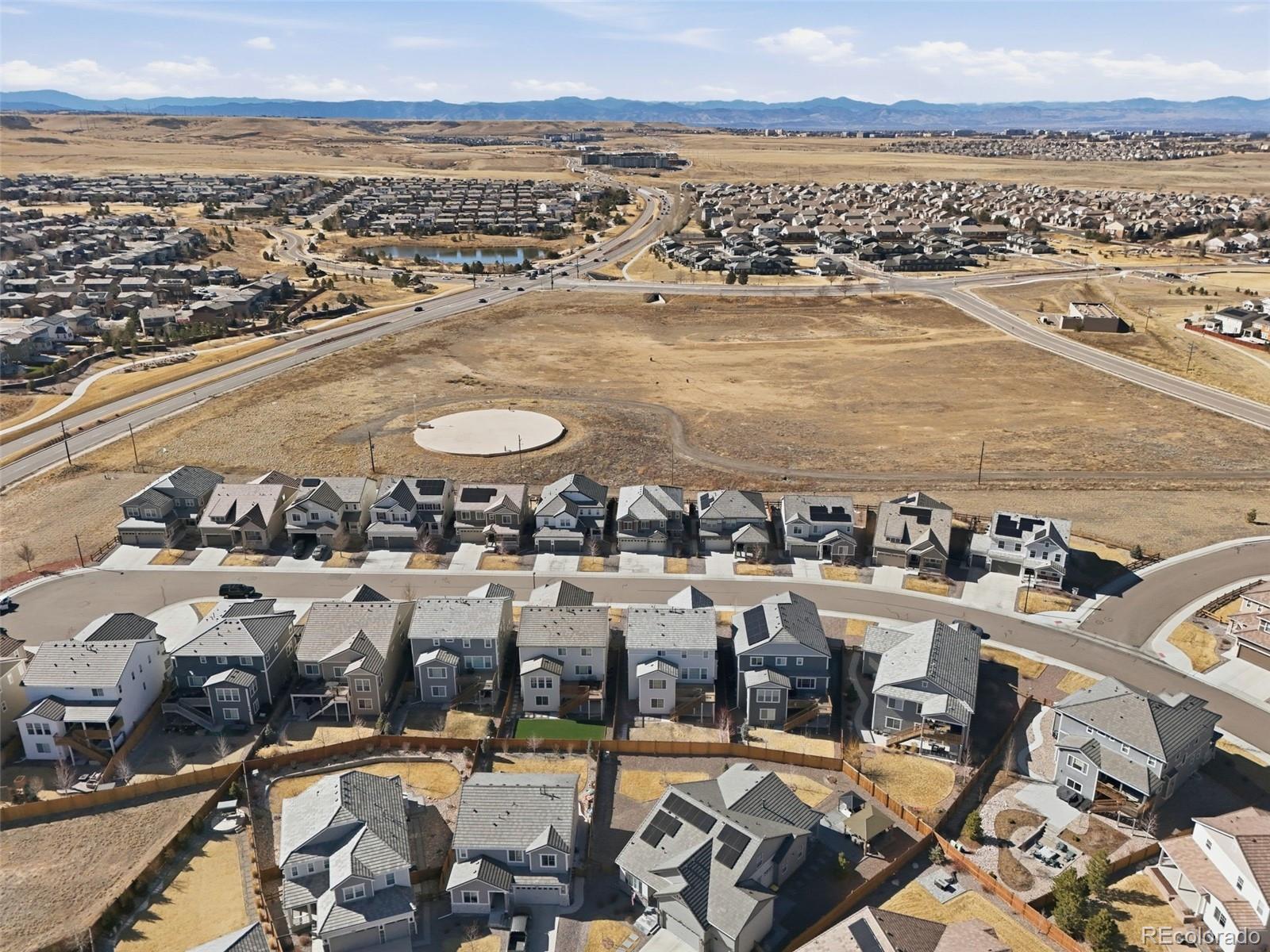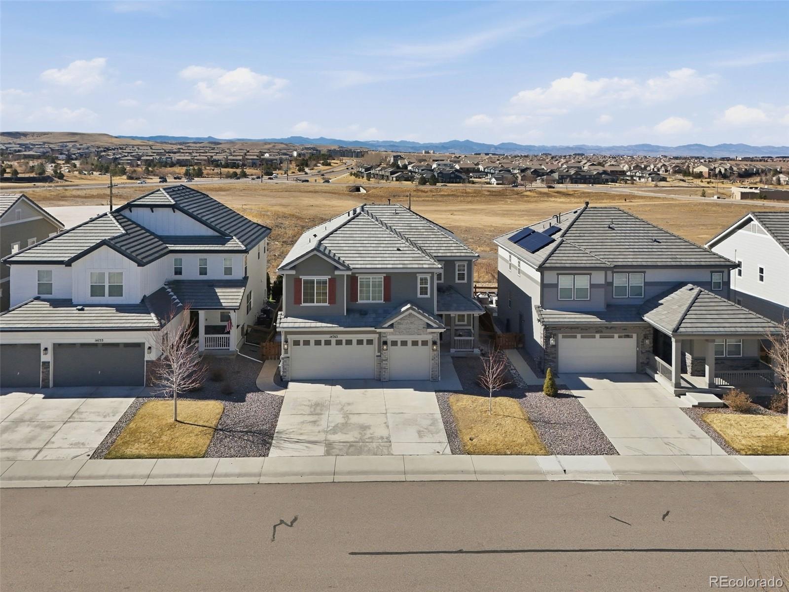 Ideally situated with stunning Front Range and mountain views backing to open space, this two-story residence in sought-after Meridian offers an exceptional setting, combined with luxury finishes and modern touches. The light and bright open floor plan features beautiful LVP floors, high 10’ ceilings, and a neutral palette to complement the functional layout of the main living spaces. The gourmet kitchen is equipped with an oversized center island, a stainless steel appliance suite, quartz countertops, upgraded shaker 42” cabinetry, and a walk-in pantry. Enjoy hosting dinner parties or intimate family meals in the formal dining space, drenched in natural light and offering unparalleled westerly facing views. Outside, the partially covered patio is ready for summer BBQs while overlooking low-maintenance professional landscaping and a turf yard. Upstairs, the private living quarters include a bonus loft, three generously sized secondary bedrooms, a full bath, laundry, and the owner’s suite. This serene retreat features tre-ceilings, a sizeable walk-in closet, and a spa-like ensuite bath with a huge walk-in glass-and-tile shower. Additional features of this turnkey residence include a main-floor home office, an attached 3-car garage, and a full, unfinished, plumbed basement ready for future expansion or ample storage. Meridian is an established family-friendly community with an outdoor pool, parks, a playground, and miles of trails. Ideally situated within minutes of award-winning Douglas County schools, and endless shopping, dining, and entertainment in Downtown Parker, Park Meadows, and DTC, this residence stands out as a unique opportunity in a premier neighborhood.