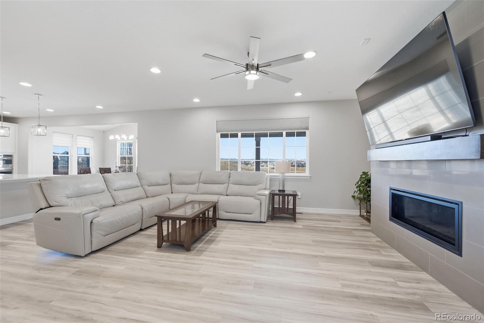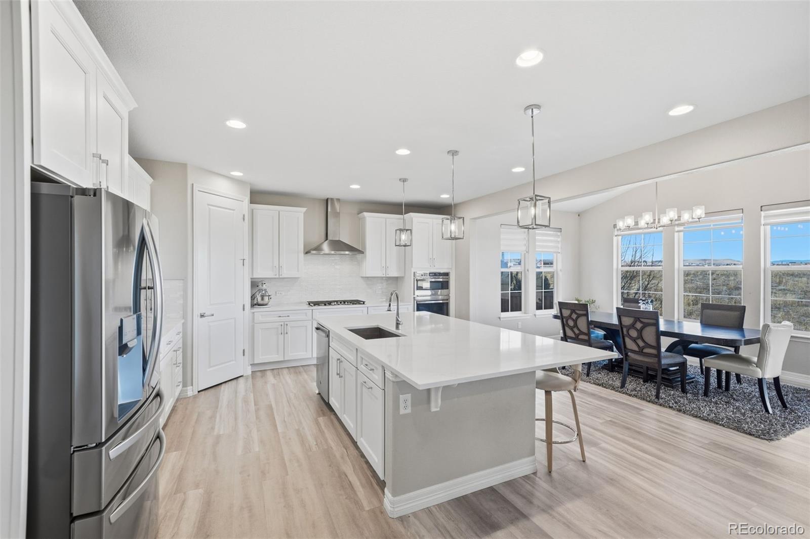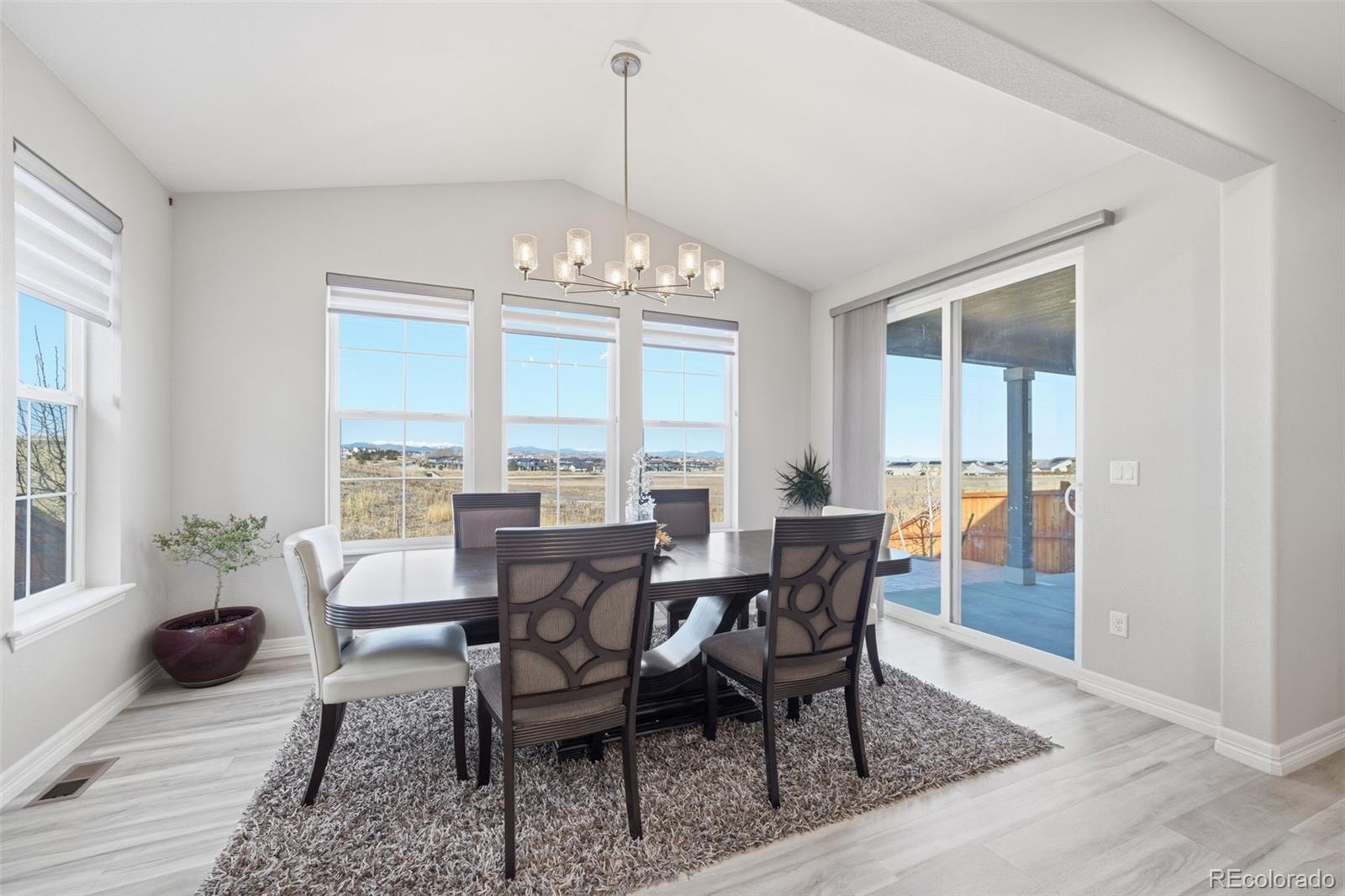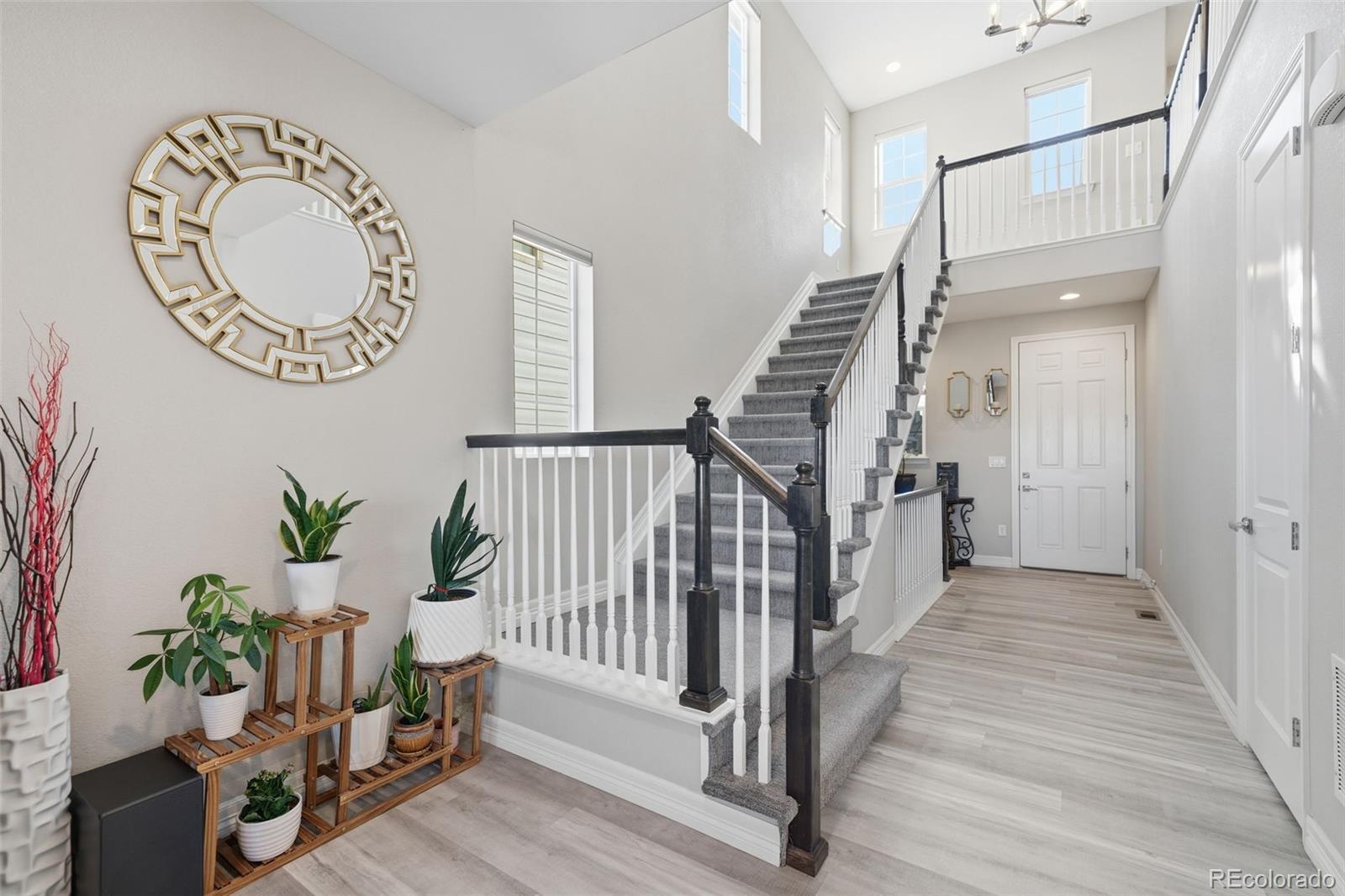 Ideally situated with stunning Front Range and mountain views backing to open space, this two-story residence in sought-after Meridian offers an exceptional setting, combined with luxury finishes and modern touches. The light and bright open floor plan features beautiful LVP floors, high 10’ ceilings, and a neutral palette to complement the functional layout of the main living spaces. The gourmet kitchen is equipped with an oversized center island, a stainless steel appliance suite, quartz countertops, upgraded shaker 42” cabinetry, and a walk-in pantry. Enjoy hosting dinner parties or intimate family meals in the formal dining space, drenched in natural light and offering unparalleled westerly facing views. Outside, the partially covered patio is ready for summer BBQs while overlooking low-maintenance professional landscaping and a turf yard. Upstairs, the private living quarters include a bonus loft, three generously sized secondary bedrooms, a full bath, laundry, and the owner’s suite. This serene retreat features tre-ceilings, a sizeable walk-in closet, and a spa-like ensuite bath with a huge walk-in glass-and-tile shower. Additional features of this turnkey residence include a main-floor home office, an attached 3-car garage, and a full, unfinished, plumbed basement ready for future expansion or ample storage. Meridian is an established family-friendly community with an outdoor pool, parks, a playground, and miles of trails. Ideally situated within minutes of award-winning Douglas County schools, and endless shopping, dining, and entertainment in Downtown Parker, Park Meadows, and DTC, this residence stands out as a unique opportunity in a premier neighborhood.