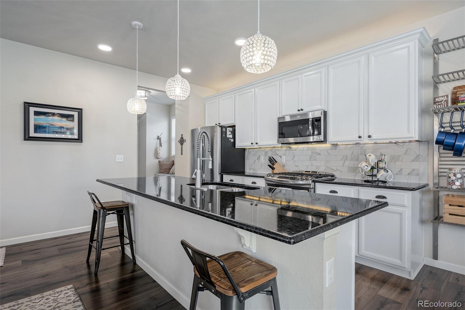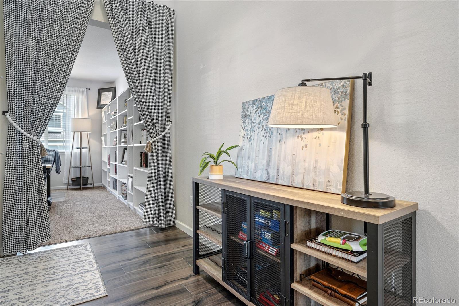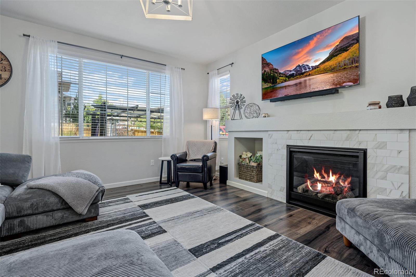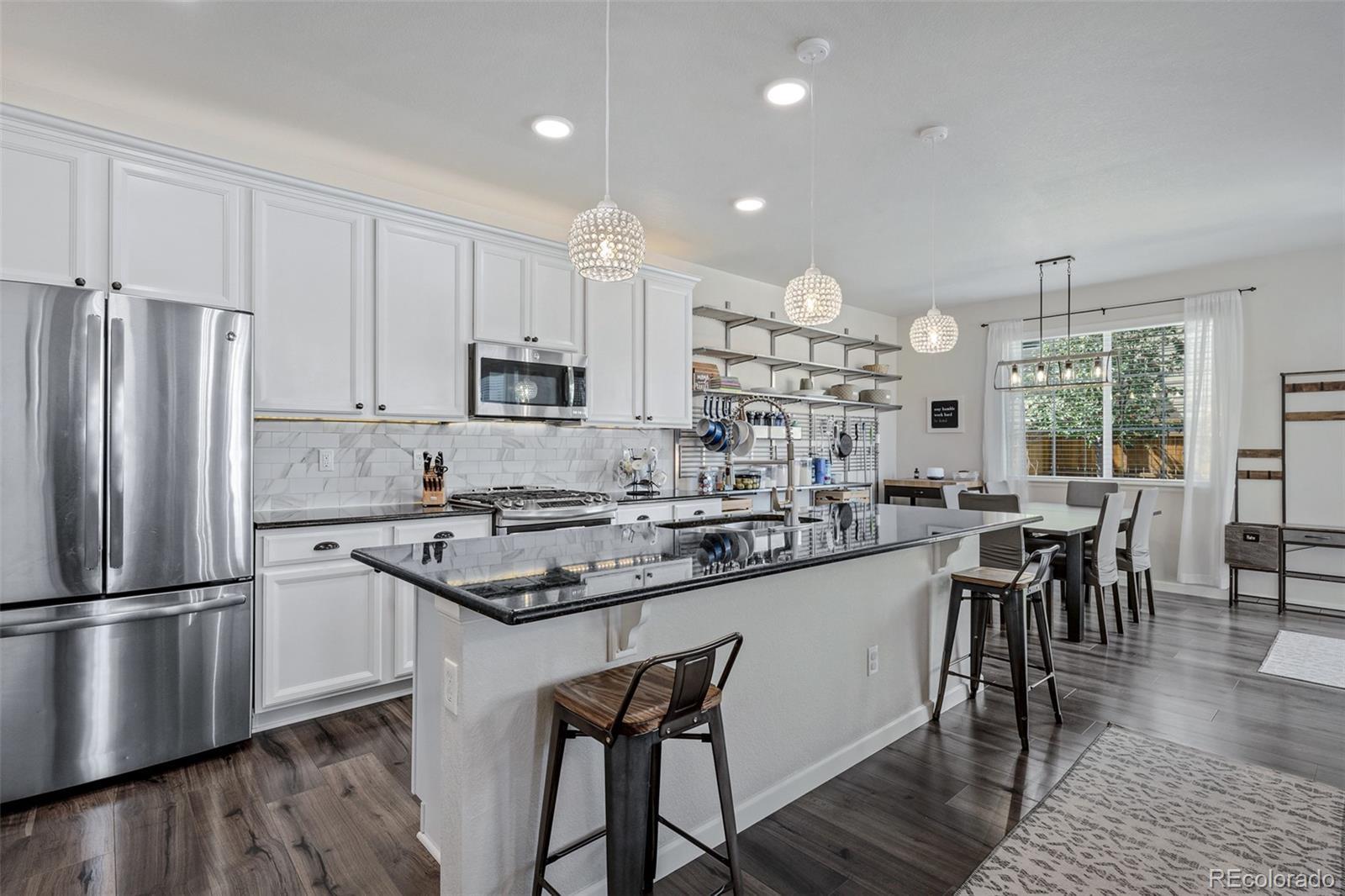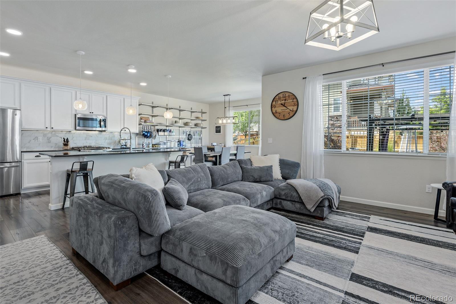Stunning 5-Bedroom Home in The Meadows – Castle Rock. Welcome to this impeccably maintained and beautifully upgraded home nestled in the highly sought-after Meadows neighborhood of Castle Rock. Boasting 5 spacious bedrooms and 5 bathrooms, this residence offers the perfect blend of functionality and modern convenience. Step inside to discover an open-concept layout flooded with natural light, luxury vinyl plank flooring on the main level and stairs, and newer carpet in the bedrooms. The gourmet kitchen features granite countertops, stainless steel appliances, upgraded sink faucets, and smart lighting, seamlessly flowing into the large living with and dining areas—ideal for entertaining or everyday comfort. Unique switchback ceiling lighting allows for customizable ambiance—daylight or soft glow—all from the same fixture. The main floor office is ideal for remote work, complete with built-in bookshelves and stylish finishes. Upstairs, enjoy a large laundry room with stubs for a utility sink, and generously sized bedrooms with thoughtful upgrades throughout. The finished basement offers a large bedroom and bathroom along with a versatile entertainment room and kitchenette with refrigerator, microwave, dishwasher, and sink--perfect for guests, movie nights, or multi-generational living. Outside, the beautifully landscaped backyard invites relaxation with a wraparound stamped concrete patio, ideal for gatherings or quiet evenings. The 2-car garage features interlocking floor tiles for a clean, polished look. Additional highlights include: Radon mitigation system, Upgraded lighting fixtures throughout, close proximity to parks, restaurants, retail, medical facilities, and quick access to I-25 for easy commuting. This home truly has it all—style, space, and smart upgrades in a vibrant community. Don’t miss your chance to experience it in person!