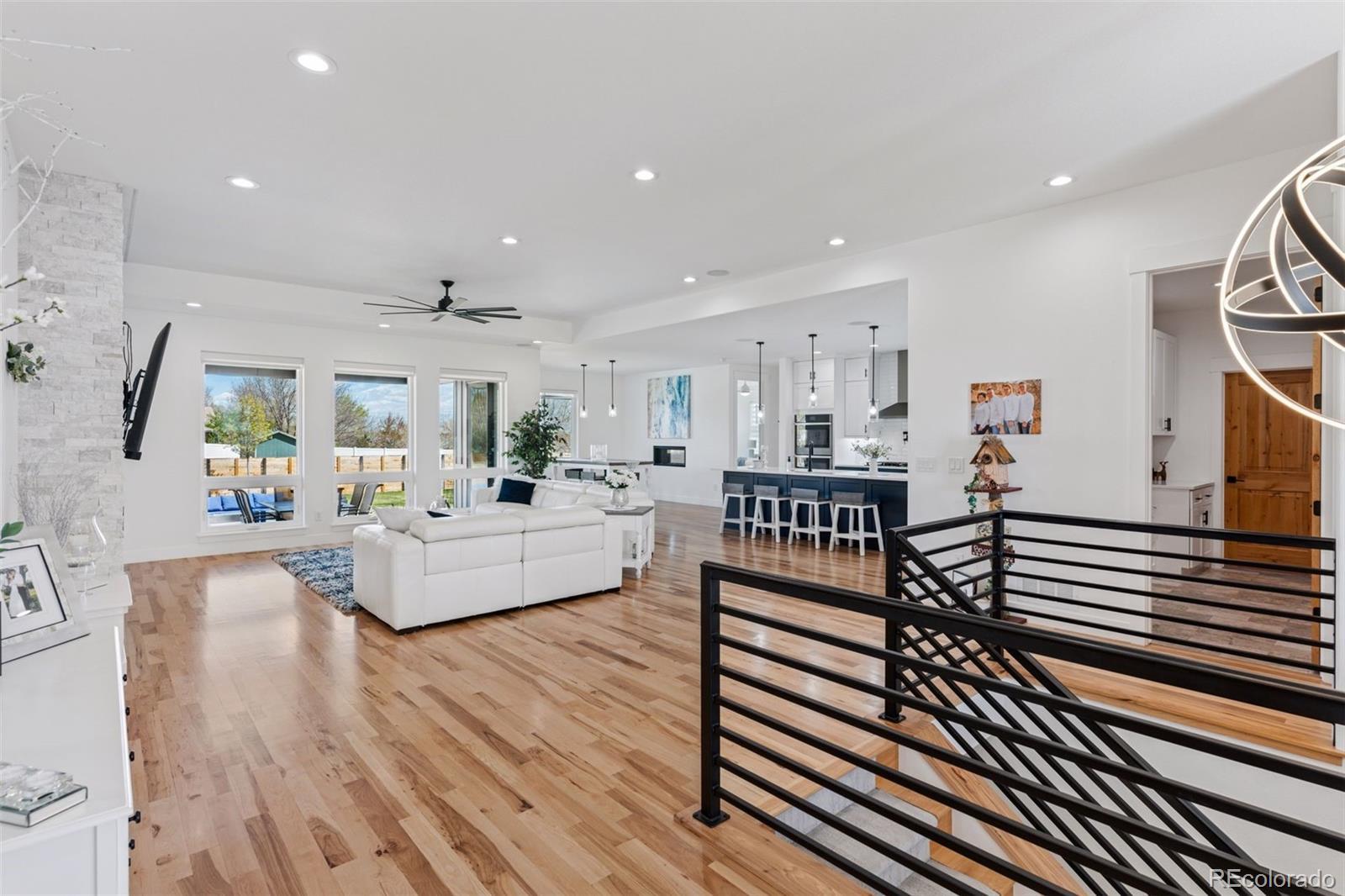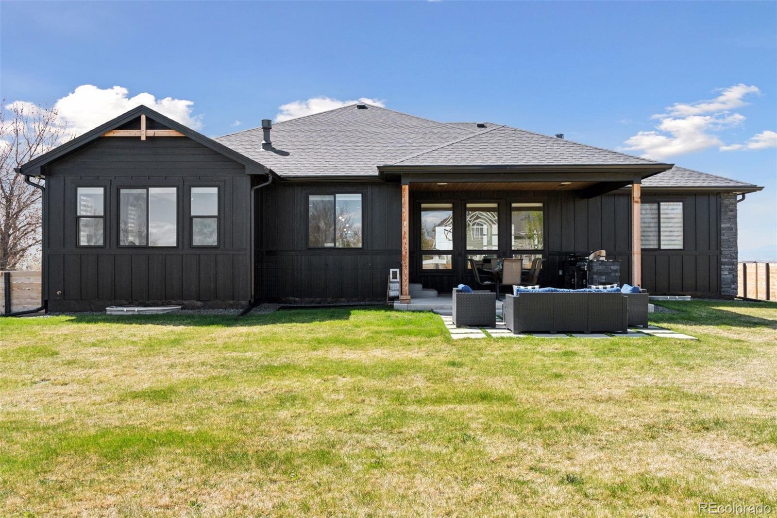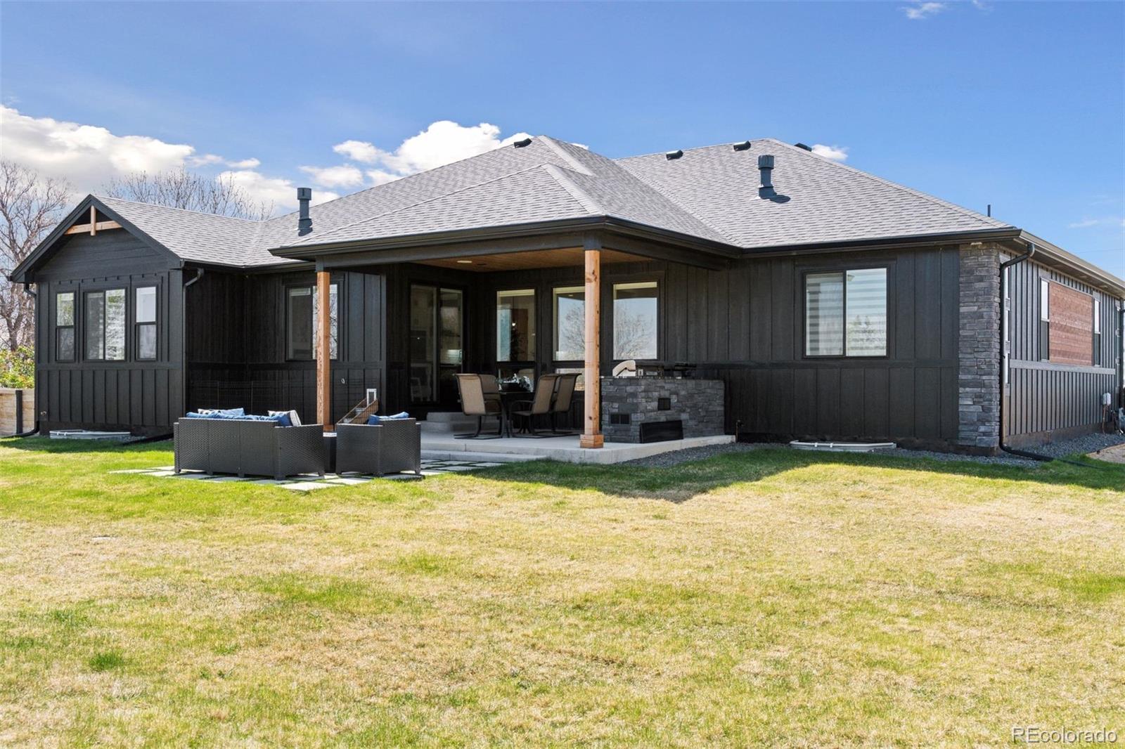 One of a kind Colorado custom home with no HOA or metro tax district plus a view! Tucked in a tranquil setting between the charming town of Berthoud and the majestic front range of the Rocky Mountains, this custom residence offers the best of both worlds—small-town charm and sweeping natural beauty. Encompassing over 5,000 square feet of meticulously curated space, this architectural masterpiece rests on a generous lot, offering freedom and privacy in an idyllic setting. From golden-hour sunsets shimmering over nearby Lake Carter to serene mornings looking upon the gorgeous mountains, this home invites nature in at every turn. Step inside to experience a seamless blend of sophistication and warmth. Soaring ceilings, rich hickory hardwood floors, and a striking white stone fireplace set the tone for elegant yet effortless living. Designed for connection and comfort, the open-concept floor plan features five spacious bedrooms and four well-appointed bathrooms, offering space for both lavish entertaining and quiet retreat. At the heart of the home, the chef’s kitchen is a showpiece of form and function—outfitted with premium slate appliances, custom cabinetry, quartz countertops, and an oversized island perfect for gathering. The primary suite is your personal sanctuary, where spa-inspired finishes, a statement chandelier, and serene design details evoke the ambiance of a boutique resort. Every corner of this home reflects exceptional craftsmanship: beautifully tiled bathrooms, a custom wet bar for effortless hosting, and a whole-home Sonos sound system that elevates everyday living. Step outside and discover seamless indoor-outdoor living. A cozy front porch welcomes you, while the covered back patio opens to a breathtaking outdoor kitchen and expansive concrete entertaining terrace—ideal for al fresco dining, summer, and evenings under the stars. This is more than a home it’s a statement. A place where luxury, nature, and everyday ease meet in harmony