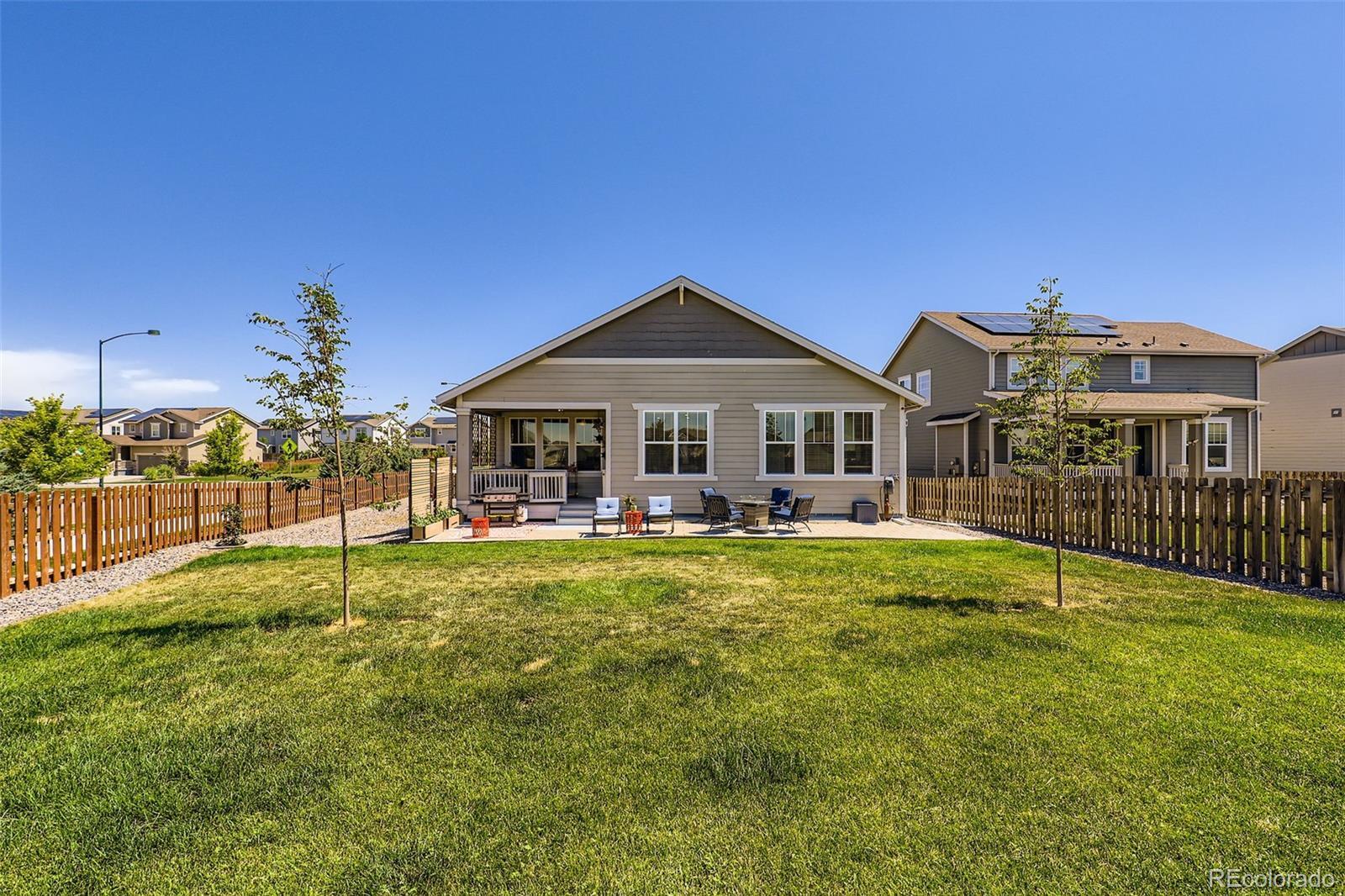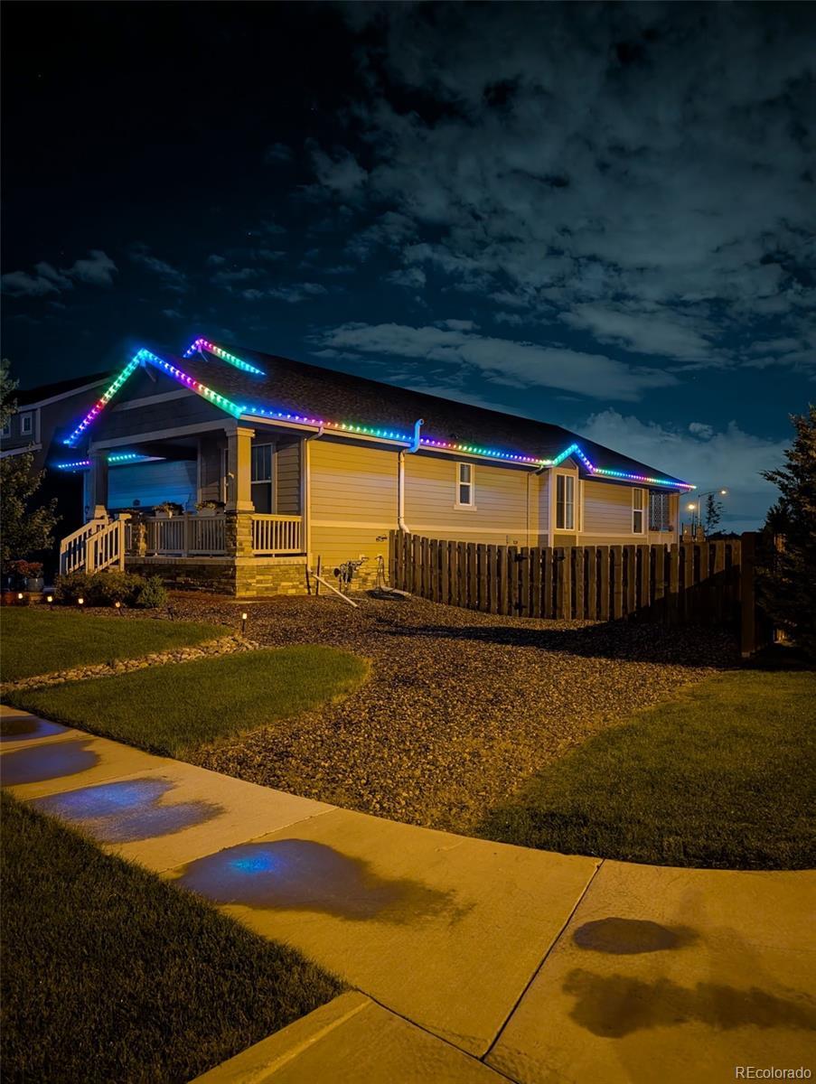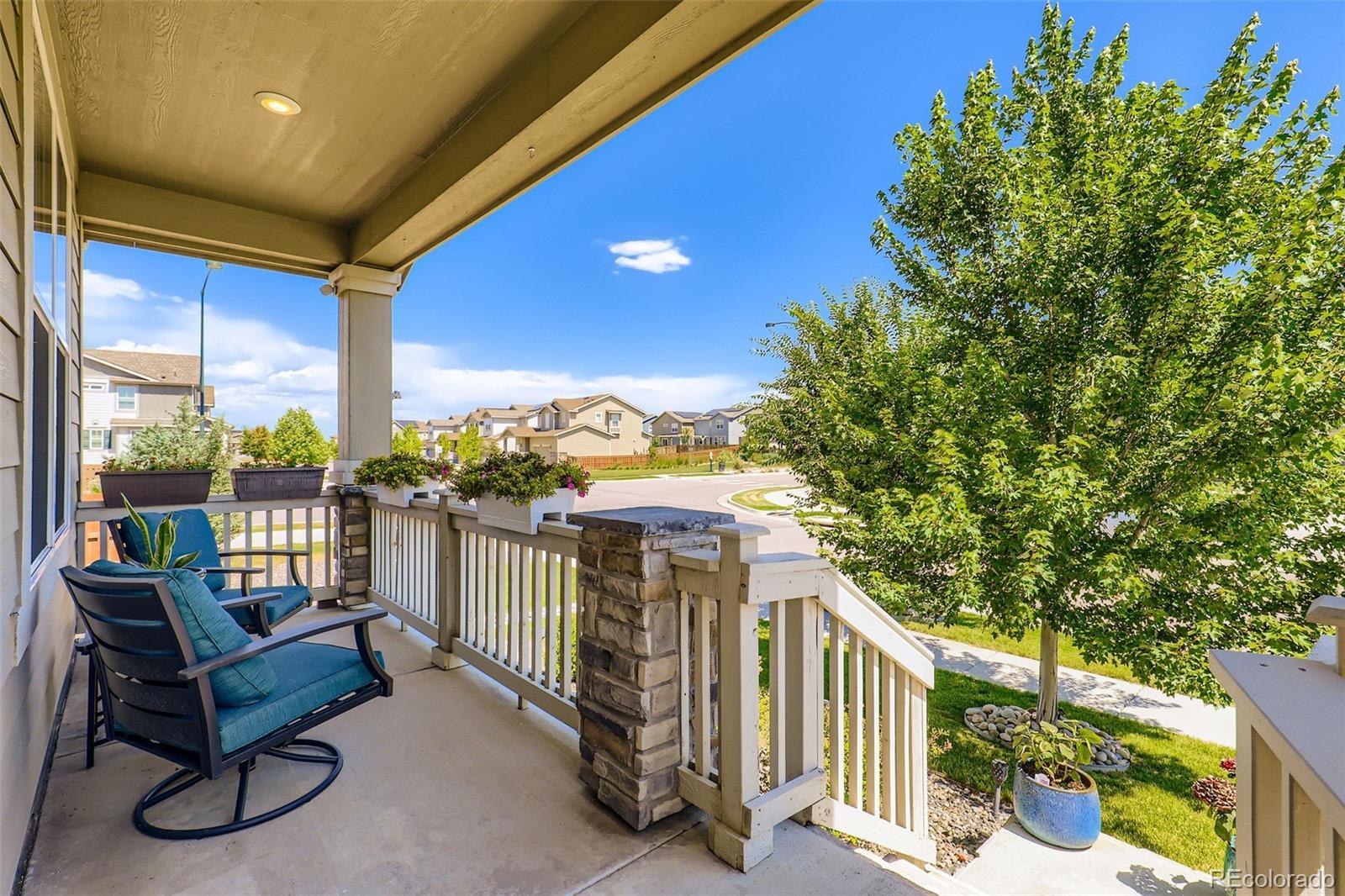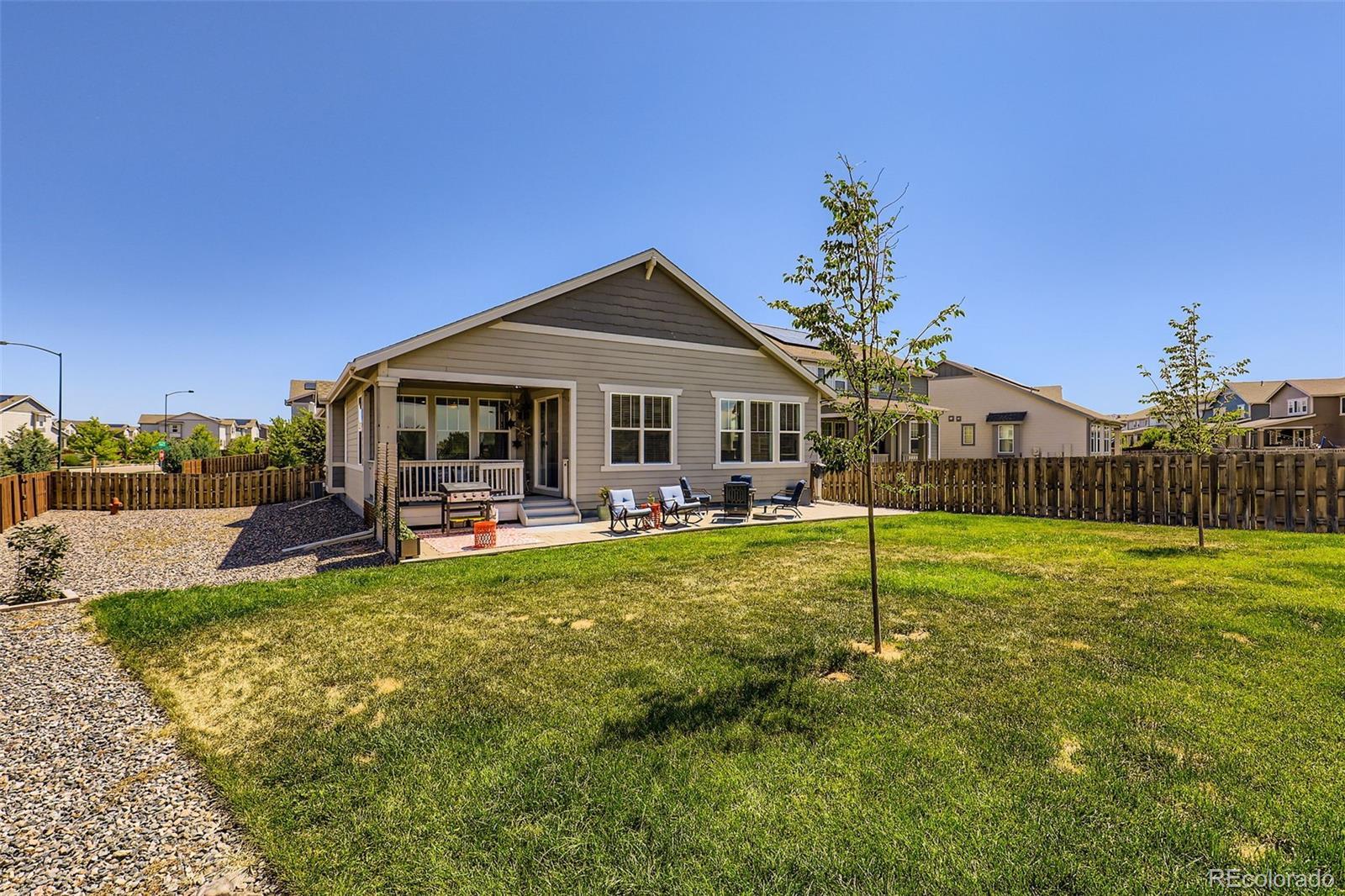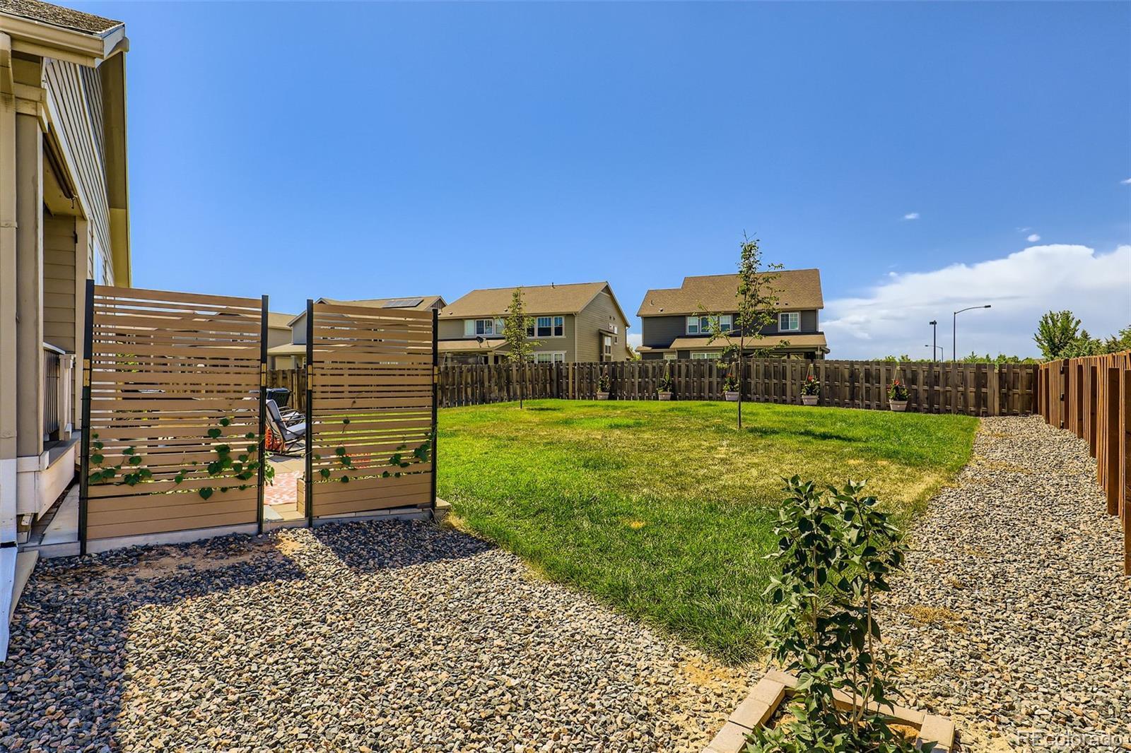 Simple yet sophisticated! Situated on a large corner lot, this property is turnkey and ready for you to unpack your bags. Located on the quiet north end of the Turnberry community in Commerce City's Reunion area, it has easy access to I-76 and Colorado 2. Walkable to the Buffalo Ridge Rec Center and a short drive to either prairie center or Reunion Marketplace. A block from Turnberry Elementary and its fields. This home boasts great outdoor living with both front and back porches. The large back lawn with 5 ft shadowbox fences are very dog friendly. You'll see from both inside and out that this home has been lovingly maintained. At the front of the home are two bedrooms and a full bathroom. Off of the garage is a mudroom and laundry room, great for seasonal entry. The main room is your open concept kitchen, dining room and living room, with granite counters and island. The primary suite is modern, with large bath and walk-in closet. The stairs to the basement are open off the living room, but this space remains unfinished. There are two egress windows on the south end, should you choose to add bedrooms here in the future. This space can be great for storage, or future expansion to your needs. Do not miss the high shelves in the garage, perfect for seasonal storage. On top of all that, an owned SunNova solar power system for low utility bills and an Everlight lighting system to spread seasonal joy! This home is easy to show and ready for its next chapter! Call to schedule a showing today!