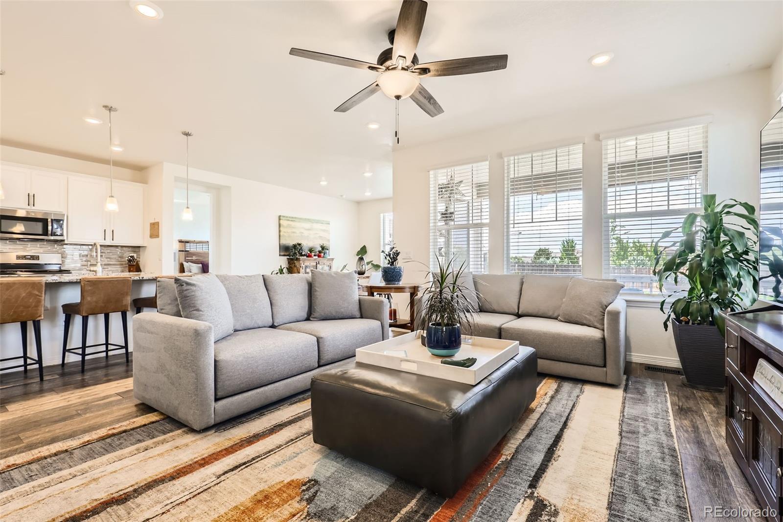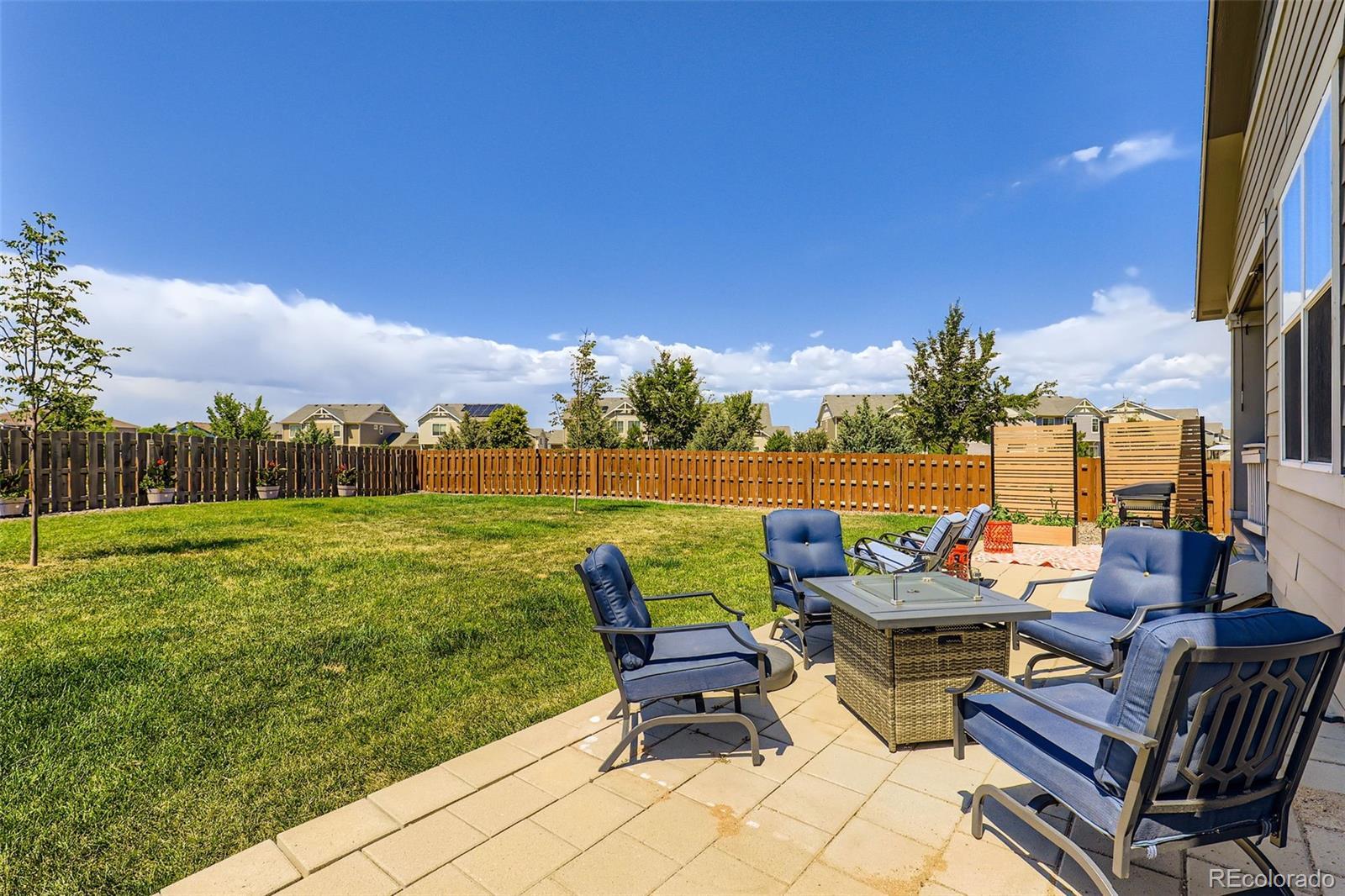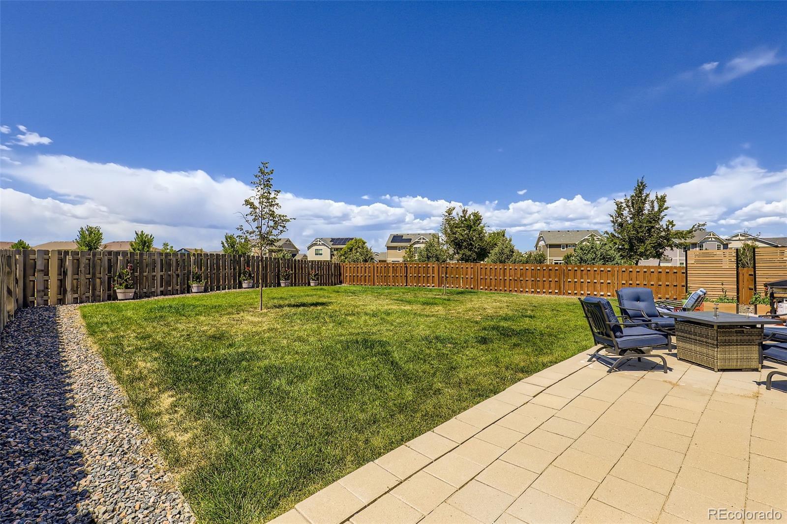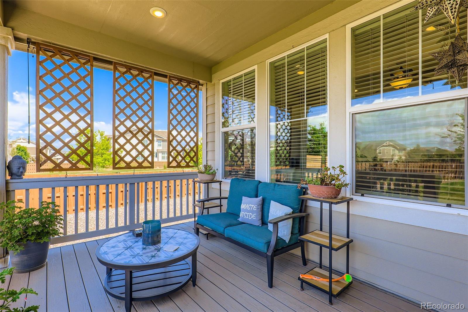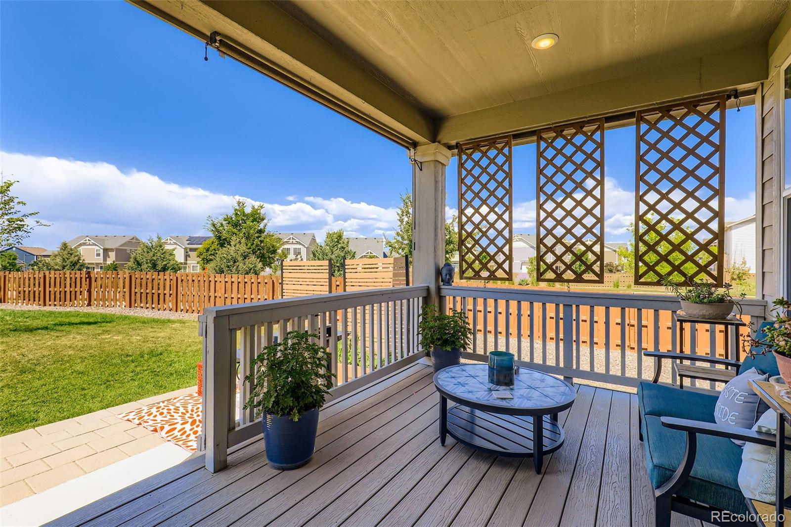 Simple yet sophisticated! Situated on a large corner lot, this property is turnkey and ready for you to unpack your bags. Located on the quiet north end of the Turnberry community in Commerce City's Reunion area, it has easy access to I-76 and Colorado 2. Walkable to the Buffalo Ridge Rec Center and a short drive to either prairie center or Reunion Marketplace. A block from Turnberry Elementary and its fields. This home boasts great outdoor living with both front and back porches. The large back lawn with 5 ft shadowbox fences are very dog friendly. You'll see from both inside and out that this home has been lovingly maintained. At the front of the home are two bedrooms and a full bathroom. Off of the garage is a mudroom and laundry room, great for seasonal entry. The main room is your open concept kitchen, dining room and living room, with granite counters and island. The primary suite is modern, with large bath and walk-in closet. The stairs to the basement are open off the living room, but this space remains unfinished. There are two egress windows on the south end, should you choose to add bedrooms here in the future. This space can be great for storage, or future expansion to your needs. Do not miss the high shelves in the garage, perfect for seasonal storage. On top of all that, an owned SunNova solar power system for low utility bills and an Everlight lighting system to spread seasonal joy! This home is easy to show and ready for its next chapter! Call to schedule a showing today!
