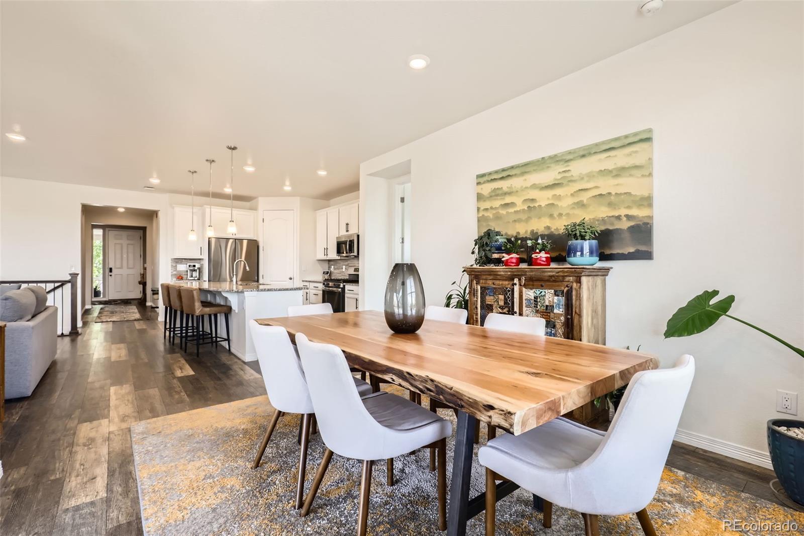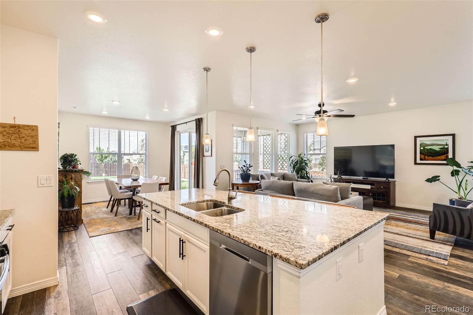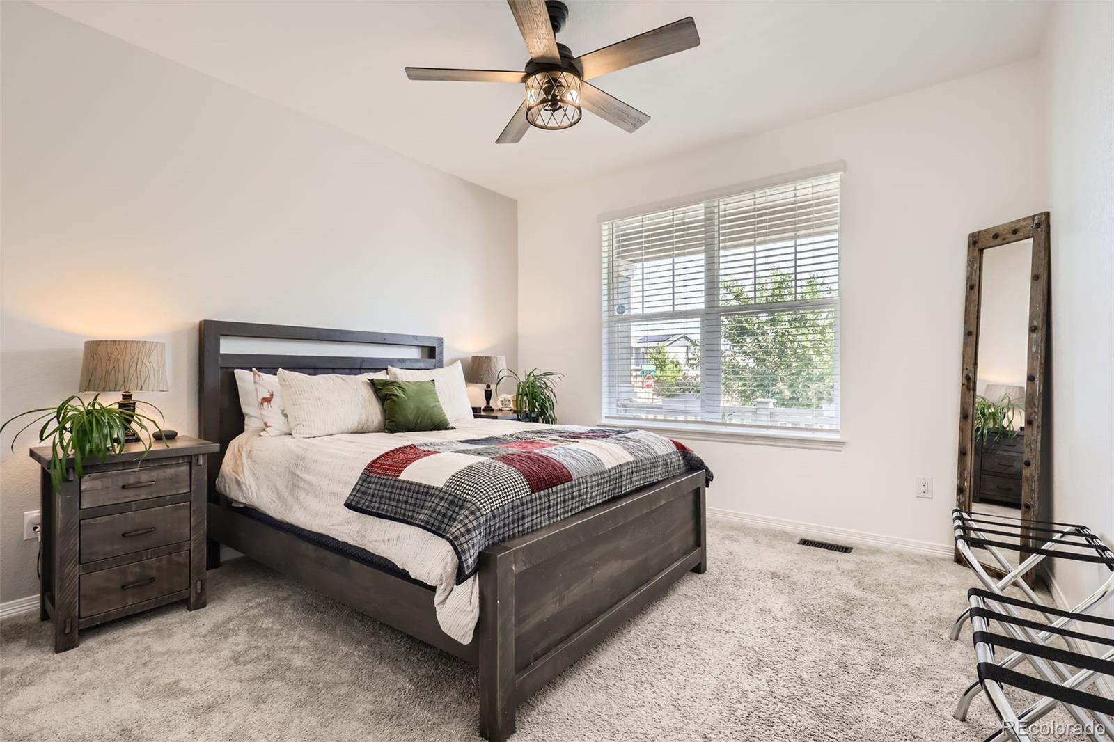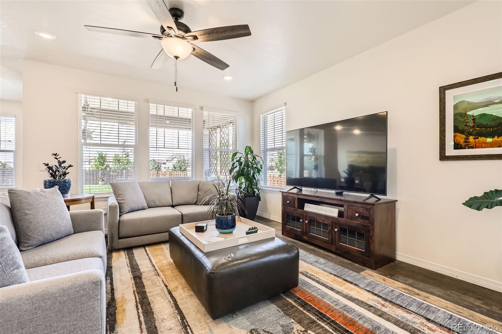 Simple yet sophisticated! Situated on a large corner lot, this property is turnkey and ready for you to unpack your bags. Located on the quiet north end of the Turnberry community in Commerce City's Reunion area, it has easy access to I-76 and Colorado 2. Walkable to the Buffalo Ridge Rec Center and a short drive to either prairie center or Reunion Marketplace. A block from Turnberry Elementary and its fields. This home boasts great outdoor living with both front and back porches. The large back lawn with 5 ft shadowbox fences are very dog friendly. You'll see from both inside and out that this home has been lovingly maintained. At the front of the home are two bedrooms and a full bathroom. Off of the garage is a mudroom and laundry room, great for seasonal entry. The main room is your open concept kitchen, dining room and living room, with granite counters and island. The primary suite is modern, with large bath and walk-in closet. The stairs to the basement are open off the living room, but this space remains unfinished. There are two egress windows on the south end, should you choose to add bedrooms here in the future. This space can be great for storage, or future expansion to your needs. Do not miss the high shelves in the garage, perfect for seasonal storage. On top of all that, an owned SunNova solar power system for low utility bills and an Everlight lighting system to spread seasonal joy! This home is easy to show and ready for its next chapter! Call to schedule a showing today!