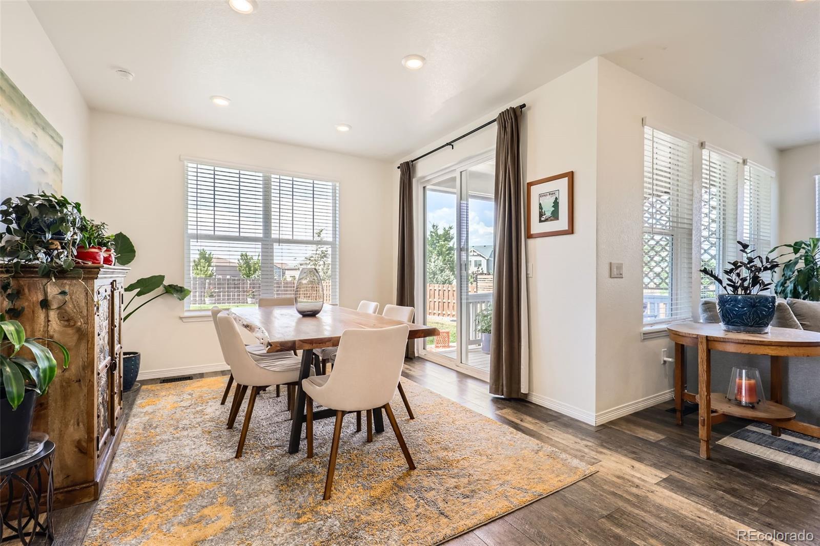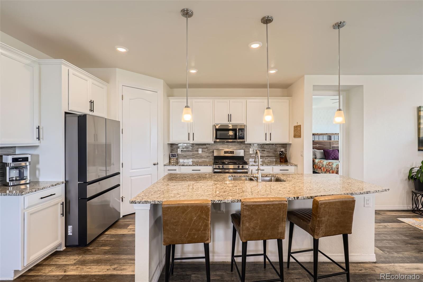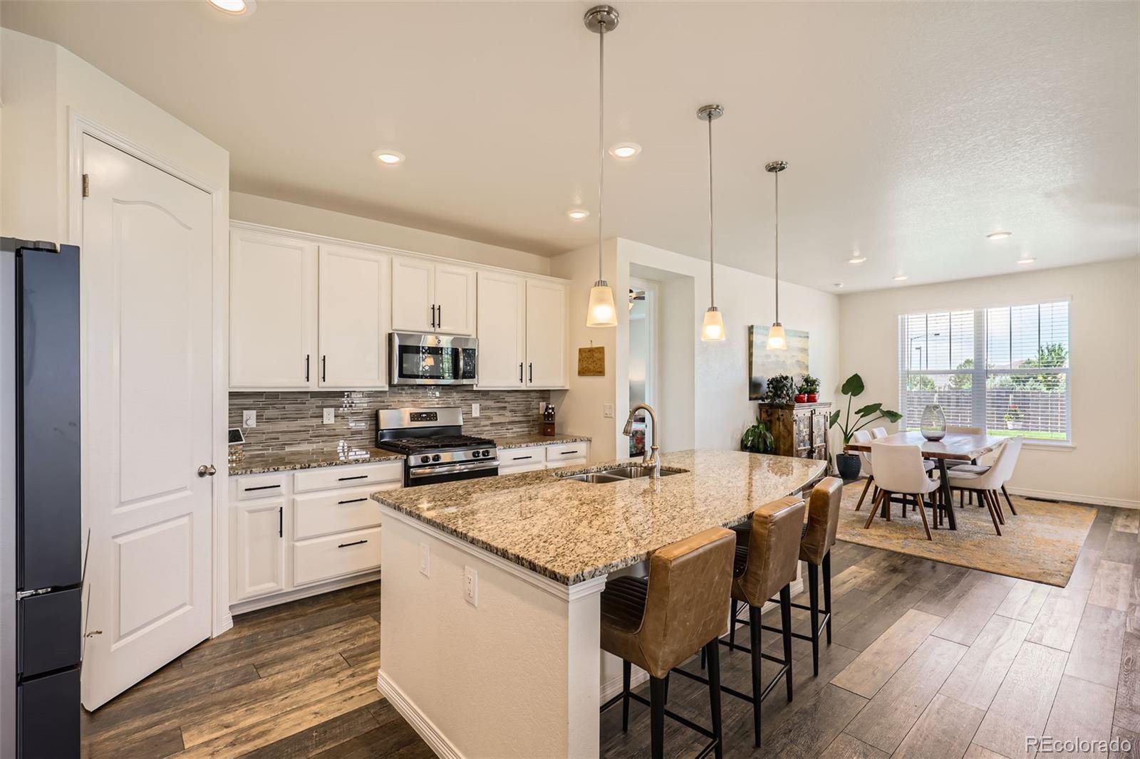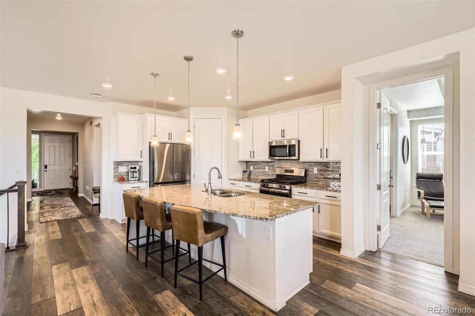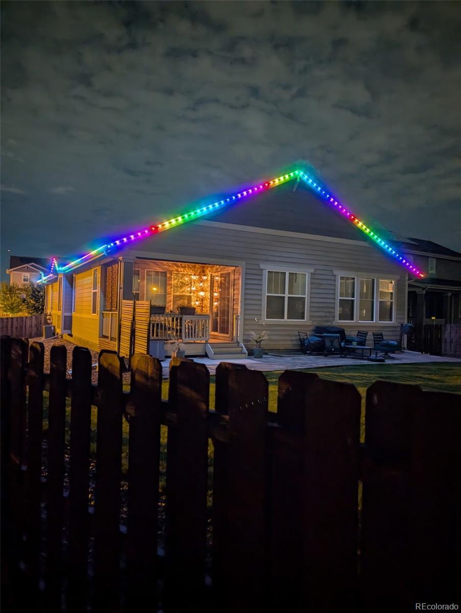 Simple yet sophisticated! Situated on a large corner lot, this property is turnkey and ready for you to unpack your bags. Located on the quiet north end of the Turnberry community in Commerce City's Reunion area, it has easy access to I-76 and Colorado 2. Walkable to the Buffalo Ridge Rec Center and a short drive to either prairie center or Reunion Marketplace. A block from Turnberry Elementary and its fields. This home boasts great outdoor living with both front and back porches. The large back lawn with 5 ft shadowbox fences are very dog friendly. You'll see from both inside and out that this home has been lovingly maintained. At the front of the home are two bedrooms and a full bathroom. Off of the garage is a mudroom and laundry room, great for seasonal entry. The main room is your open concept kitchen, dining room and living room, with granite counters and island. The primary suite is modern, with large bath and walk-in closet. The stairs to the basement are open off the living room, but this space remains unfinished. There are two egress windows on the south end, should you choose to add bedrooms here in the future. This space can be great for storage, or future expansion to your needs. Do not miss the high shelves in the garage, perfect for seasonal storage. On top of all that, an owned SunNova solar power system for low utility bills and an Everlight lighting system to spread seasonal joy! This home is easy to show and ready for its next chapter! Call to schedule a showing today!