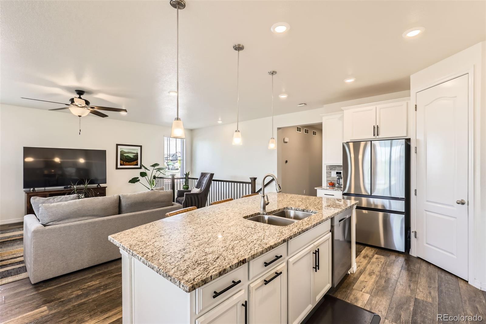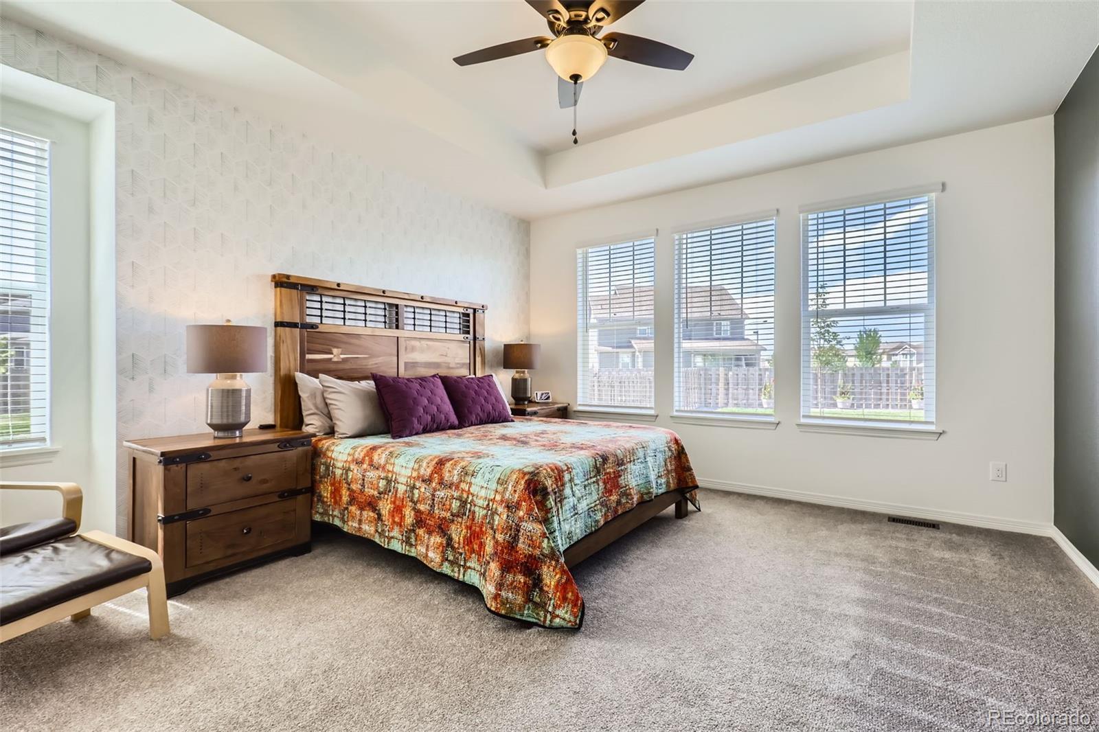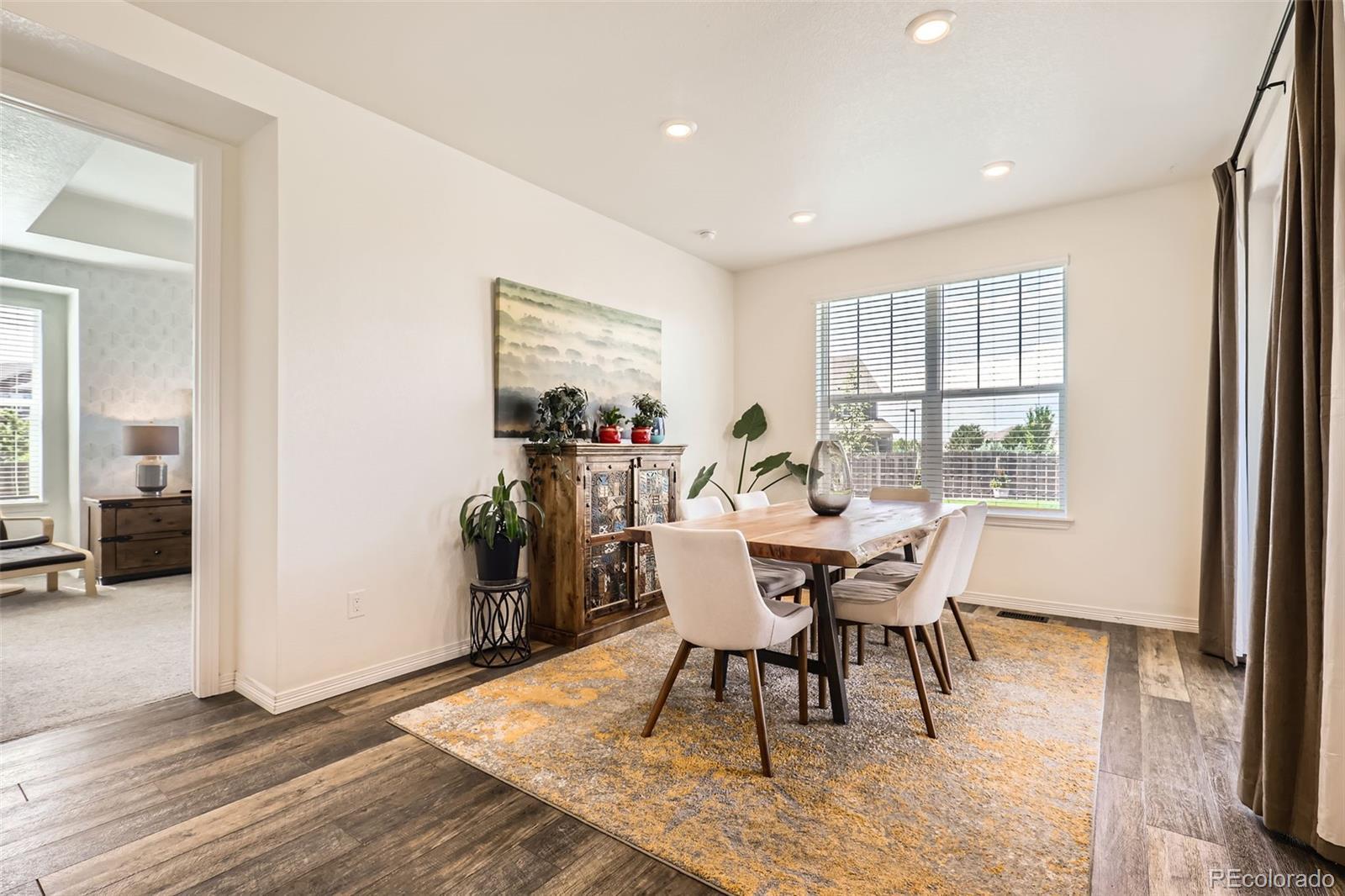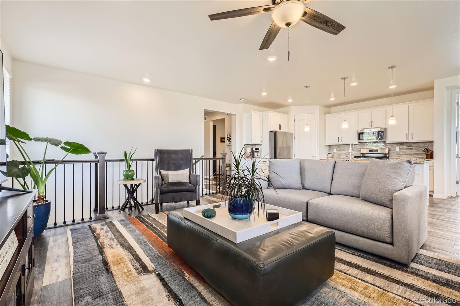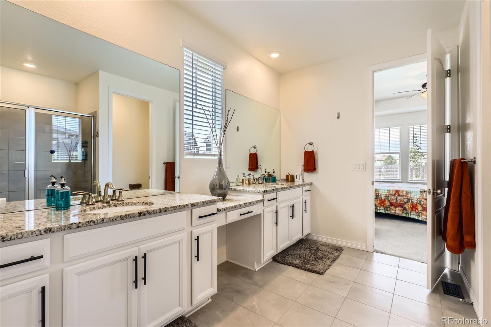 Simple yet sophisticated! Situated on a large corner lot, this property is turnkey and ready for you to unpack your bags. Located on the quiet north end of the Turnberry community in Commerce City's Reunion area, it has easy access to I-76 and Colorado 2. Walkable to the Buffalo Ridge Rec Center and a short drive to either prairie center or Reunion Marketplace. A block from Turnberry Elementary and its fields. This home boasts great outdoor living with both front and back porches. The large back lawn with 5 ft shadowbox fences are very dog friendly. You'll see from both inside and out that this home has been lovingly maintained. At the front of the home are two bedrooms and a full bathroom. Off of the garage is a mudroom and laundry room, great for seasonal entry. The main room is your open concept kitchen, dining room and living room, with granite counters and island. The primary suite is modern, with large bath and walk-in closet. The stairs to the basement are open off the living room, but this space remains unfinished. There are two egress windows on the south end, should you choose to add bedrooms here in the future. This space can be great for storage, or future expansion to your needs. Do not miss the high shelves in the garage, perfect for seasonal storage. On top of all that, an owned SunNova solar power system for low utility bills and an Everlight lighting system to spread seasonal joy! This home is easy to show and ready for its next chapter! Call to schedule a showing today!