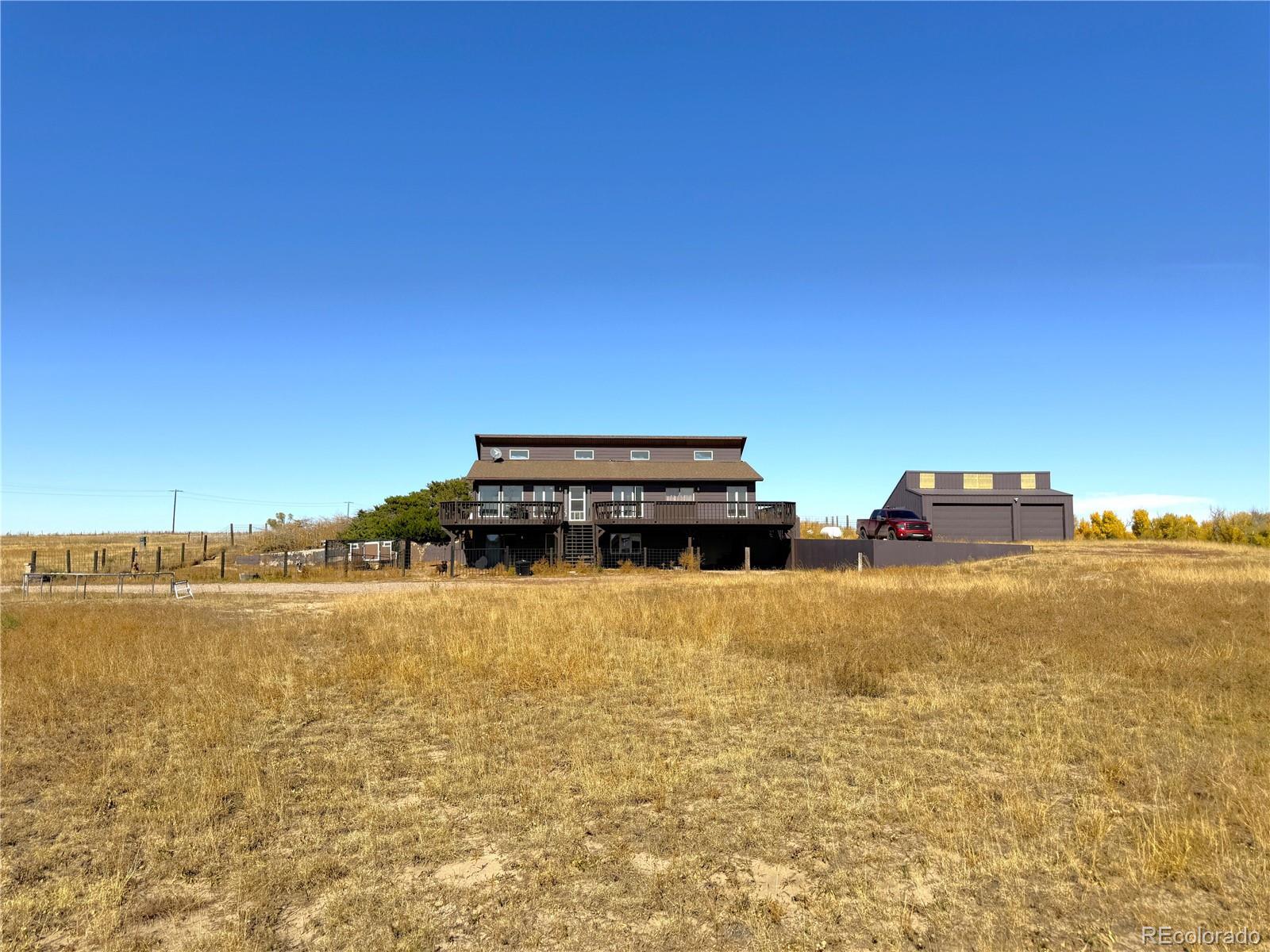 Country Charm on 16.5± Acres! Looking for wide open spaces, peaceful surroundings, and room to grow? This 16.5± acre property just west of Limon, Colorado offers it all — endless views, quiet country living, and beautiful fall colors painting the landscape. Set above the Big Sandy Creek bottom, this 3-bedroom, 2.5-bath home features a bright, open layout with vaulted ceilings and tall windows that fill the space with natural light. The main-level master suite includes a 5-piece bath, oversized walk-in closet, and access to a wraparound deck — perfect for watching sunrises and vibrant autumn evenings. The walk-out basement adds great living space with a family room, wet bar, two bedrooms, and a full bath. A one-car attached garage plus a detached two-car garage, loafing shed, and corrals make this property ideal for animals, hobbies, or a small homestead. This home has been well-loved and is ready for its next chapter. Bring your ideas, your animals, and your country dreams to this little slice of heaven!