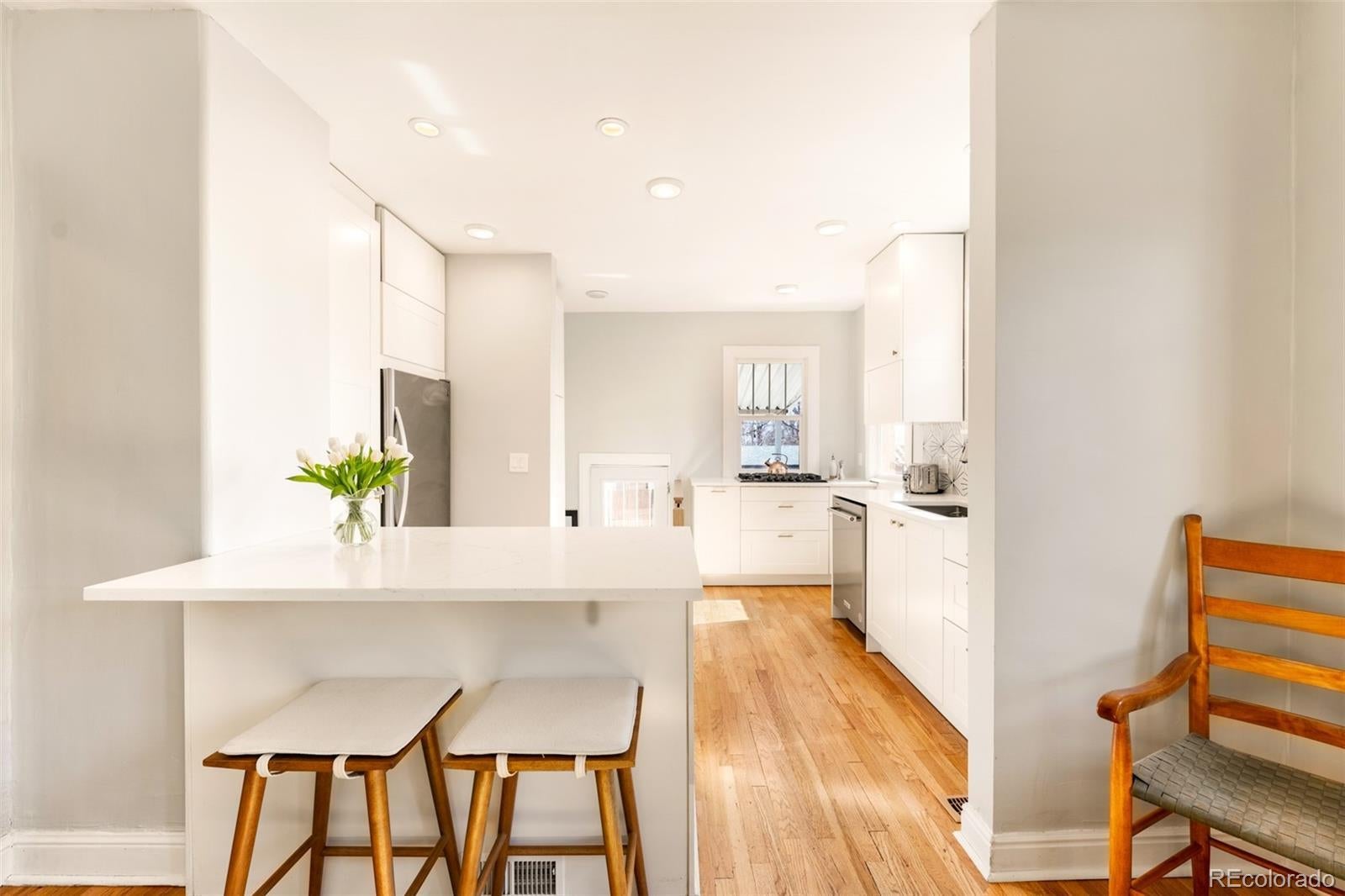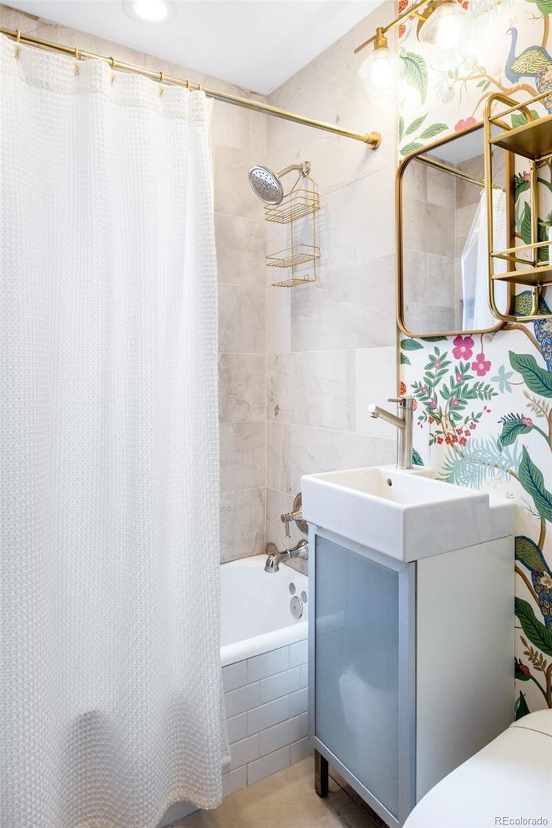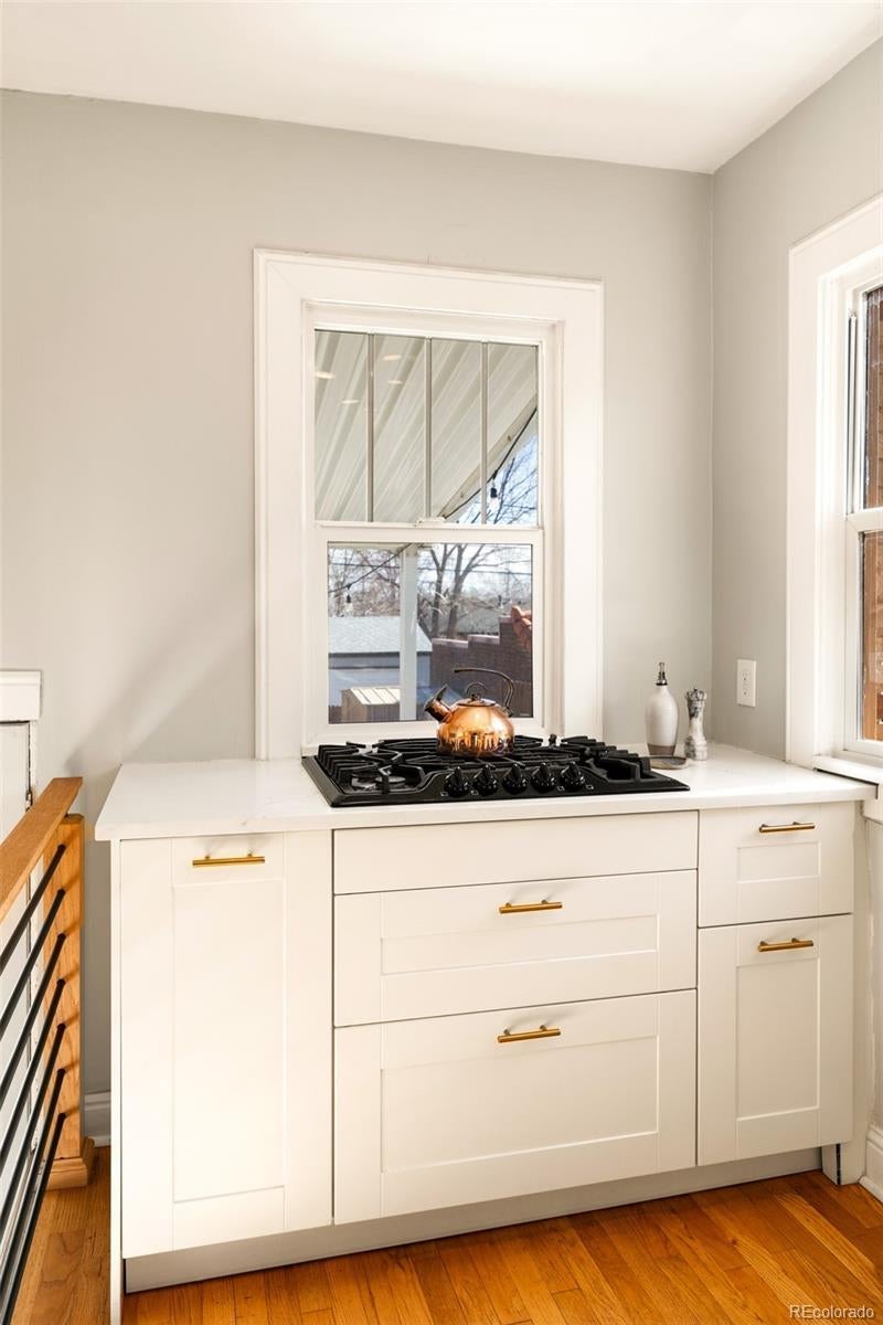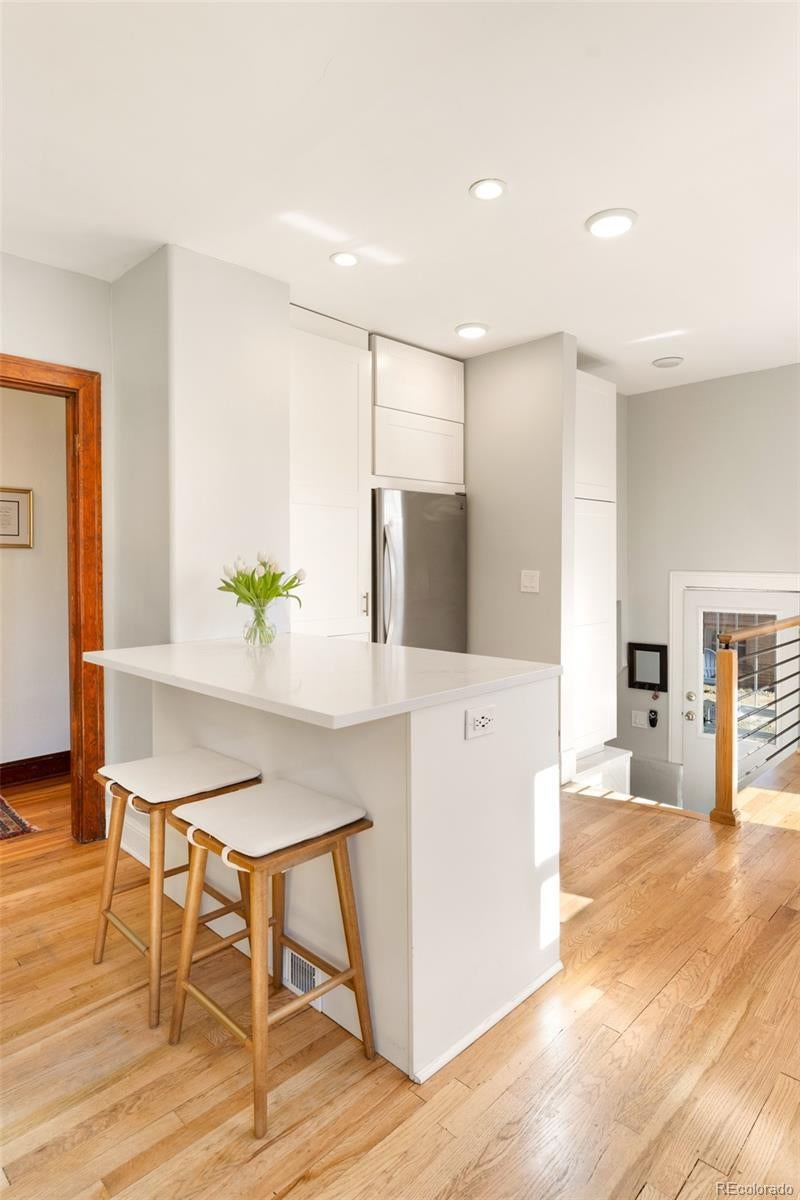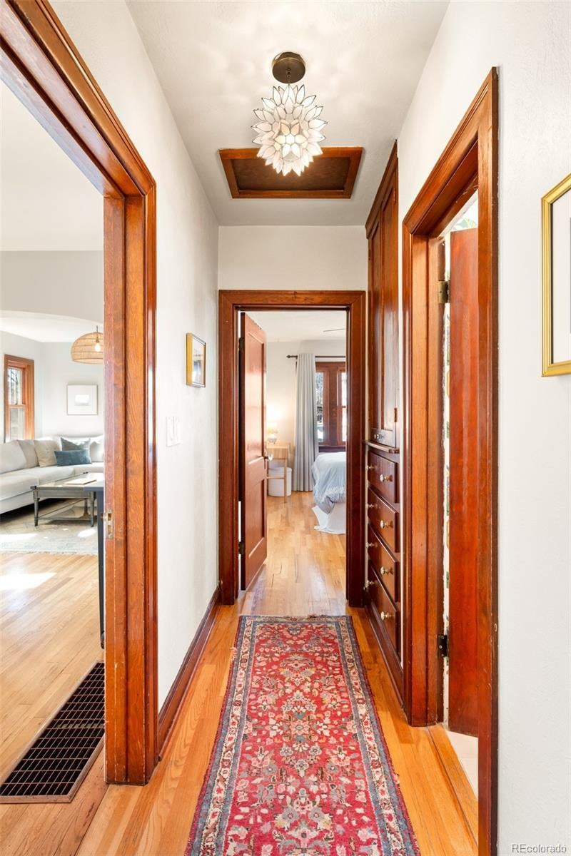 Discover historic charm reimagined in this exquisitely renovated Tudor, nestled in the heart of one of Denver's most coveted and walkable neighborhoods, West Highlands. Steps from Highland Square's vibrant array of restaurants, cozy bars, boutique shops, and coffee havens, this home offers unbeatable convenience and walkability. Thoughtfully renovated to honor its architectural roots while embracing modern design, this home is refined yet captures an inviting living experience. South-facing windows bathe the open-concept main level in warm natural light, showcasing gleaming newly refinished hardwood floors, smooth skim-coated walls, and meticulously restored historic trim. The heart of the home is a stunning chef's kitchen featuring sleek quartz countertops, crisp white cabinetry, and a premium gas range cooktop and brand new dish washer, flowing seamlessly into generous living and dining spaces. A standout rarity in the neighborhood: the main level boasts an expansive bedroom, delivering true single-level living, ideal as a primary bedroom or elevated guest space. The adjacent fully remodeled bath exudes contemporary calm with timeless, high-end finishes. The finished lower level expands the home’s livability, featuring a spacious non-conforming bedroom that functions as a private suite complete with its own living area—ideal for guests, extended stays, or a secondary primary bedroom option. A dedicated office nook, ¾ bath, and laundry room with new washer/dryer complete this level, creating meaningful additional living space. Step outside to a west-facing front porch that captures golden Colorado sunsets, or relax in the private backyard oasis featuring a covered patio with a lush grassy lawn and expansive landscaping. A detached one-car garage provides storage and ease, accompanied by a practical backyard shed. Rarely does a home blend old-world craftsmanship with contemporary comfort so seamlessly in one of Denver's most sought-after neighborhoods.