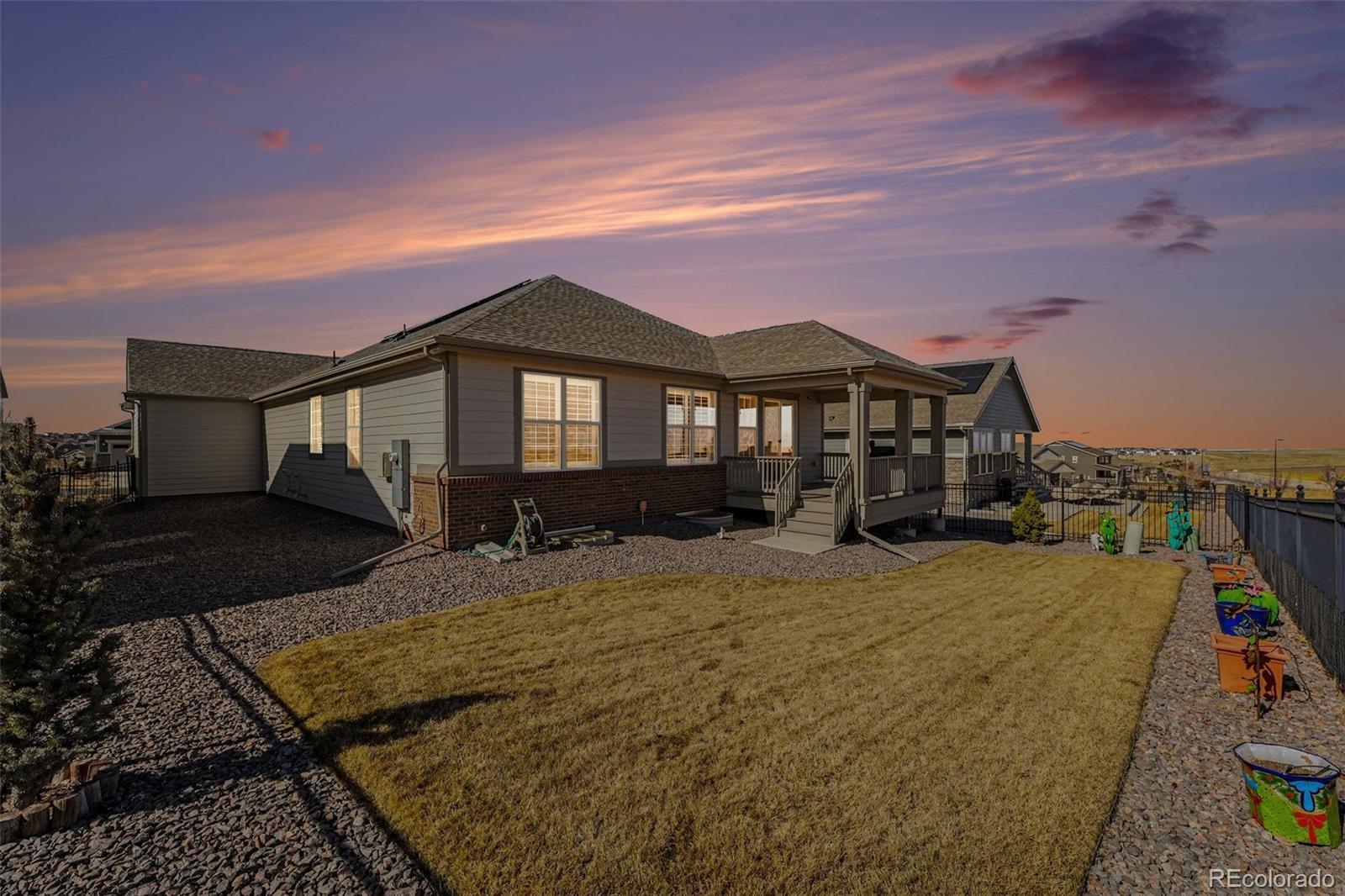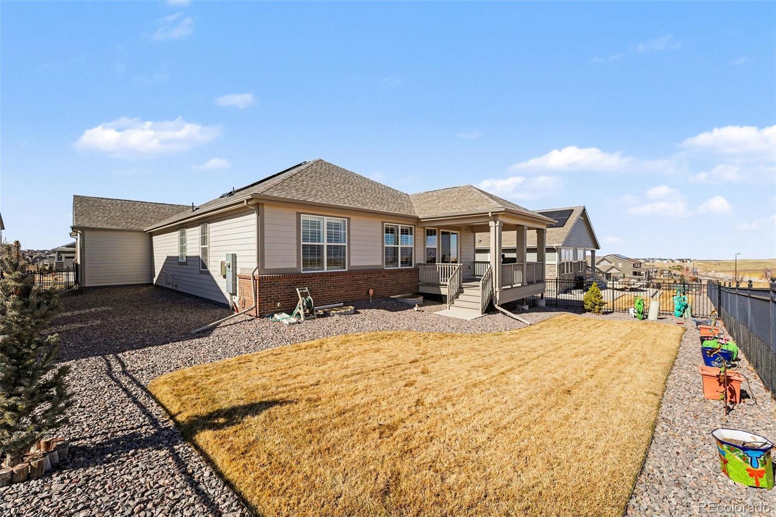 Homes like this are exactly why people fall in love with living in southeast Aurora. Set on a quiet interior street in a golf-course community neighborhood and in award-winning Cherry Creek School district, this newer ranch offers true main-floor living with the kind of space buyers rarely find. Step inside and you immediately notice the wide-open layout, tall ceilings, and natural light flowing from the back of the home. The kitchen becomes the heart of everything — featuring granite countertops, stainless appliances, a large island with seating, pantry storage, and easy connection to both the dining and living areas. The living room centers around a gas fireplace and opens directly to the covered deck, creating that perfect Colorado indoor-outdoor feel for evenings and summer gatherings. The main-level primary suite is spacious and private with a five-piece bath, oversized shower, soaking tub, dual sinks and a large walk-in closet. Two additional bedrooms, a full bath, dedicated office with French doors, mudroom, and main-floor laundry make the layout incredibly functional for everyday living. Downstairs, the full unfinished basement offers over 2,200 square feet ready for future expansion — theater room, additional bedrooms, gym, or multi-generational living — while still leaving plenty of storage. The oversized 3½-car garage is a huge bonus and perfect for a workshop, gear storage, or all the Colorado toys. The home also includes leased solar panels designed to help offset monthly electric costs and improve energy efficiency, giving the next owner an opportunity to benefit from lower utility usage while continuing the existing agreement. Around the corner is the neighborhood park. Even better, the HOA includes access to the private Blackstone Country Club amenities resort-style pool, water slide, tennis, pickleball, fitness facilities, and social activities(optional golf membership available separately). You’re not just buying a home — you’re buying a lifestyle!