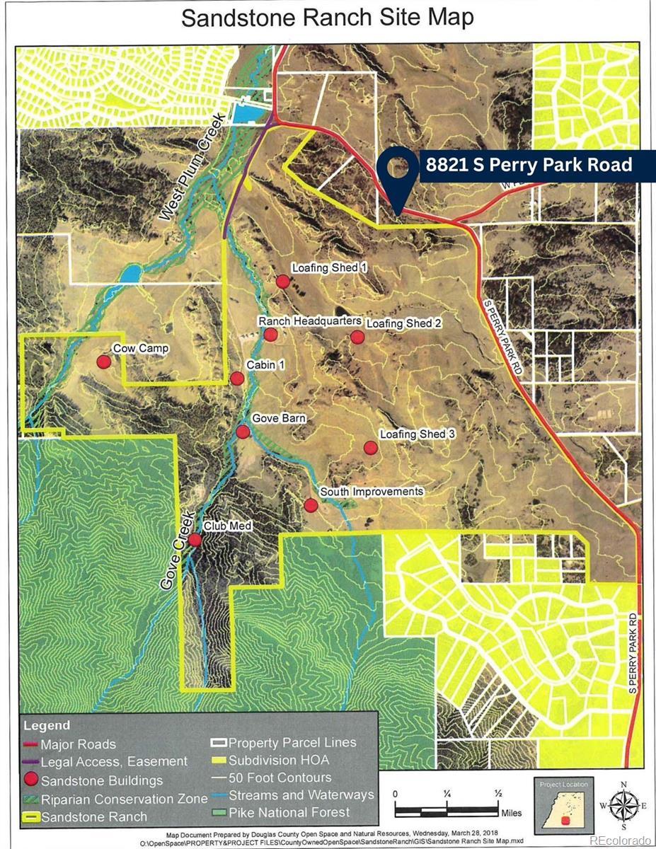 Welcome to one of the most compelling land offerings in Douglas County This 15.7-acre ranch is one of the very few properties that directly borders the 2,038-acre Sandstone Ranch—the crown jewel of Douglas County’s Open Space system. A rare and protected wilderness, Sandstone Ranch showcases red rock formations, sloping meadows, vital wildlife habitat and migration corridors, and a 3.5-mile boundary with Pike National Forest. Leave the horse trailer at home—this property offers direct access to over 12 miles of natural-surface trails for horseback riding, hiking, mountain biking, cross-country skiing, and snowshoeing. This is a once-in-a-generation opportunity to create your legacy retreat in one of Colorado’s most picturesque valleys. With A1 zoning, no HOA, and no covenants, the property offers a blank canvas for an equestrian estate, private residence, or multi-generational compound—the opportunities are truly limitless. Located along the scenic corridor of South Perry Park Road, the setting balances accessibility and seclusion—just 3.5 miles from Perry Park Country Club and under 5 miles to I-25, yet surrounded by dramatic outcroppings, mature trees, and panoramic mountain views. The land includes a permitted well and existing infrastructure, including a house, detached garage, and multiple outbuildings. While the structures need restoration, they offer potential as a guest house, studio, or temporary residence during new construction. Established utility connections are already in place, and multiple build sites span the property. Two primary building envelopes have been visually modeled with architectural renderings to inspire luxury placement and design. Few properties offer direct access to Sandstone Ranch—and even fewer combine this level of usability, freedom, and location just minutes from Castle Rock, Monument, Larkspur, and the greater Denver–Colorado Springs corridor