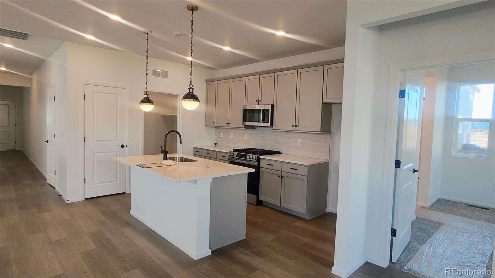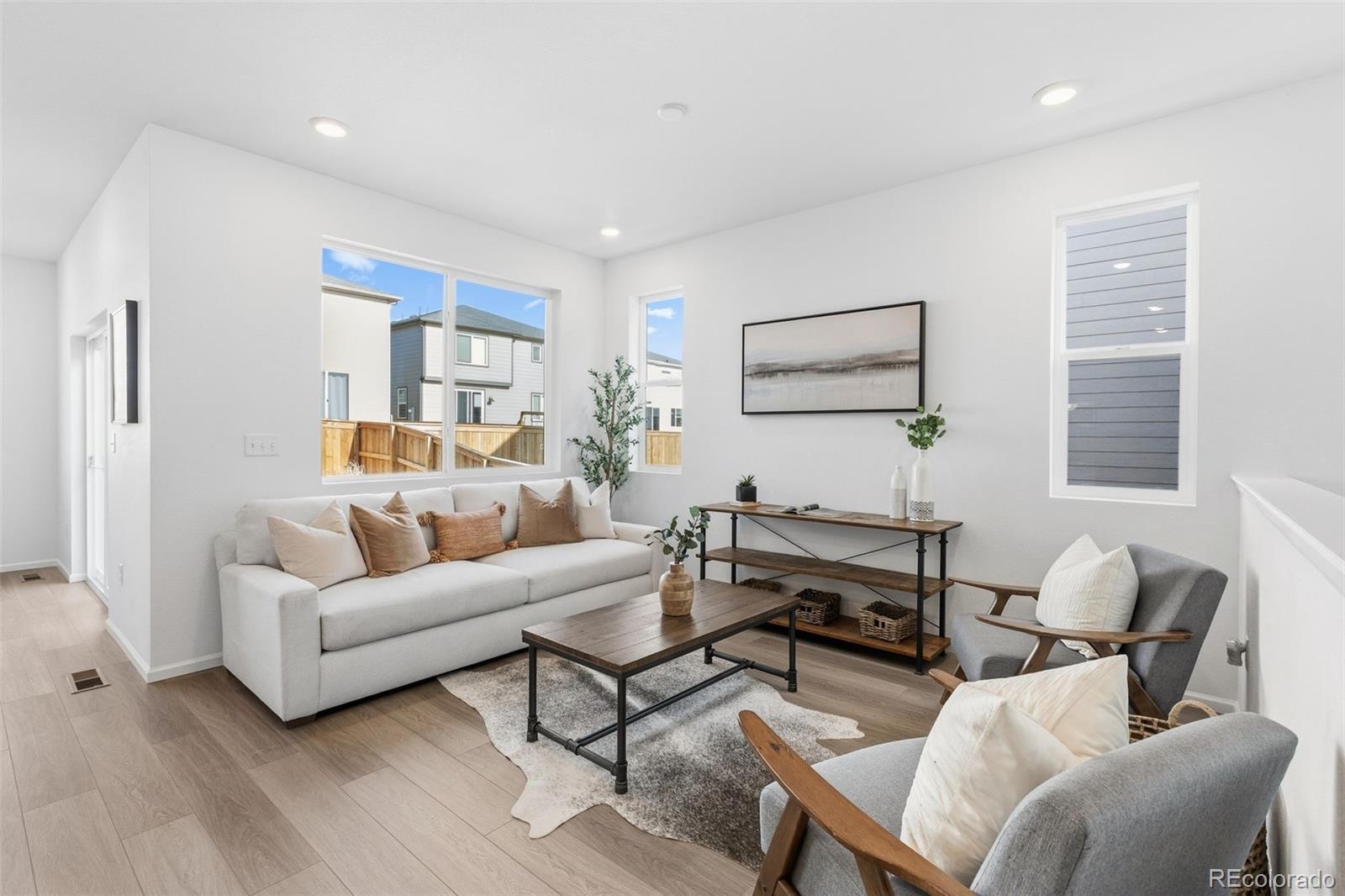 Welcome to this stunning prairie-style ranch home blending timeless architecture with modern comfort. Set in a quiet neighborhood with a small-town feel, this home features a warm cottage exterior, oversized 2-car garage, and a welcoming open foyer that sets the tone for a bright, spacious interior. Enjoy an open-concept layout with sleek quartz countertops, white easy-clean cabinetry, and a full-height gray vertical subway tile backsplash in the kitchen. The stainless steel appliances, including a gas range, add both style and functionality. A built-in bench at the mudroom offers practical entryway storage, while matte black hardware throughout adds a sophisticated touch. The primary suite features a spa-like bath with floor-to-ceiling tiled shower and dual sinks. The secondary bath includes a convenient tub/shower combo. Downstairs, basement includes a versatile pocket office, perfect for remote work or hobbies, and there's still room to expand with an unfinished area for storage or future customization. Outside, enjoy a low-maintenance backyard complete with a retaining wall for decorative landscaping. The community features expansive green spaces, a playground, picnic tables, shaded areas, BBQ grills, and walking paths. Conveniently located just minutes from shopping, dining, entertainment, and outdoor recreation, with easy access to I-76, E-470, and a quick 30-minute drive to both DIA and downtown Denver.