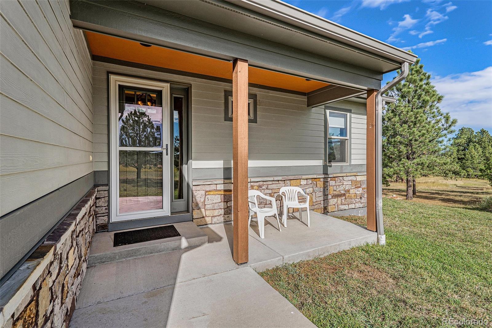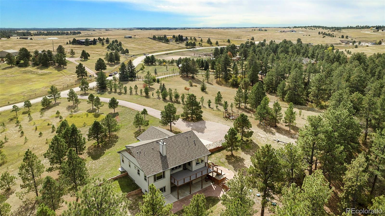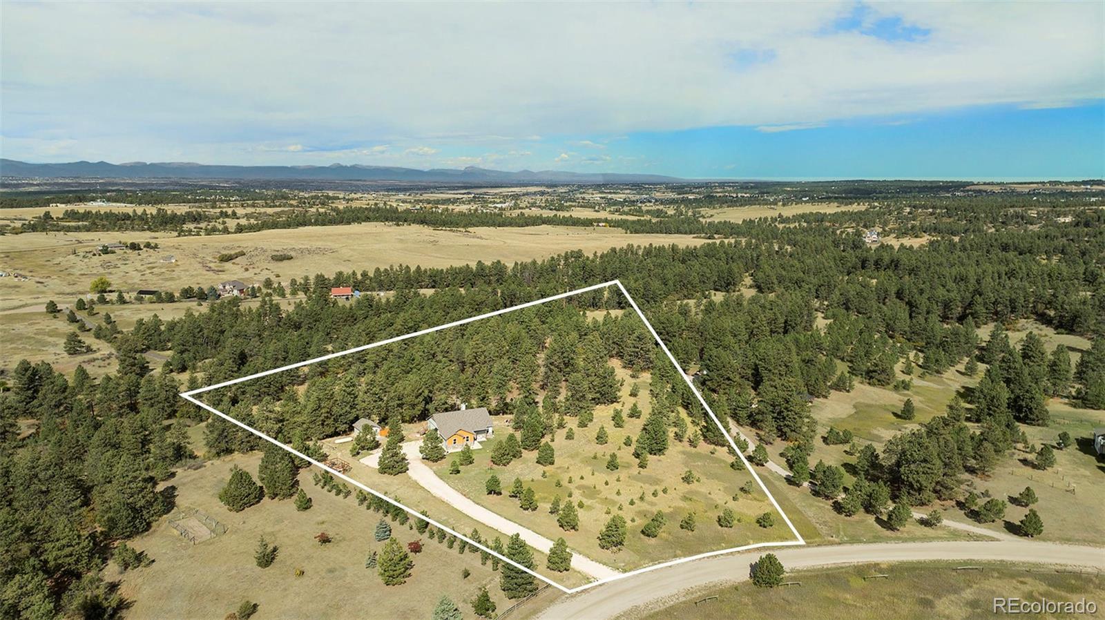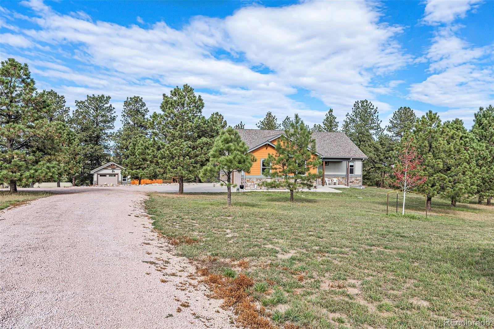Beautiful, well built home on a diverse Colorado landscape of meadows and trees. This home is less than 10 years old, for sale by the original owner. Easy access to Town of Elizabeth amenities with country tranquility on an 8 acre lot. A beautiful, functional ranch style home incorporates multi-generational opportunities with a walkout basement. On the main level, engineered wood floors compliment the open concept lifestyle with 2 carpeted bedrooms and 2 tiled full bathrooms. The entertainment space includes a kitchen, pantry, dining room and family room. Maytag stainless steel matching appliances in the kitchen are ready for the inner chef to prepare the perfect meal. A primary suite is complete with walk in closet, access to the deck and a bathroom that includes a double vanity, curbless shower as well as a water closet with a 2nd shower & jetted tub. For a crisp morning, the bathroom has heated floors to warm your toes. Accessing the home from the attached oversized 2 car garage or from the outdoors to the mud room-laundry room provides the perfect space to kick off your coat and shoes after work or play. Added benefits in the garage include the workshop counters, cabinets and incredible storage space in the attic. The walkout basement has more superb surprises with a wet bar, large entertaining space, a door to the covered patio, another laundry room & a wine room. The generous bedroom with walk in closet has access to the covered patio as well as windows for nice natural light. A full bathroom including heated floors is also in the basement. For projects or additional space, the 16x22 workshop has a 9’ wide, 7’ tall overhead door, a standard door, heat and a fenced yard for the pup. Not enough yet? Test your green thumb in the 12x18 fenced garden area or just go enjoy the community bridle paths. New impact resistant roof completed on the house in May of 2024. Move-in ready!